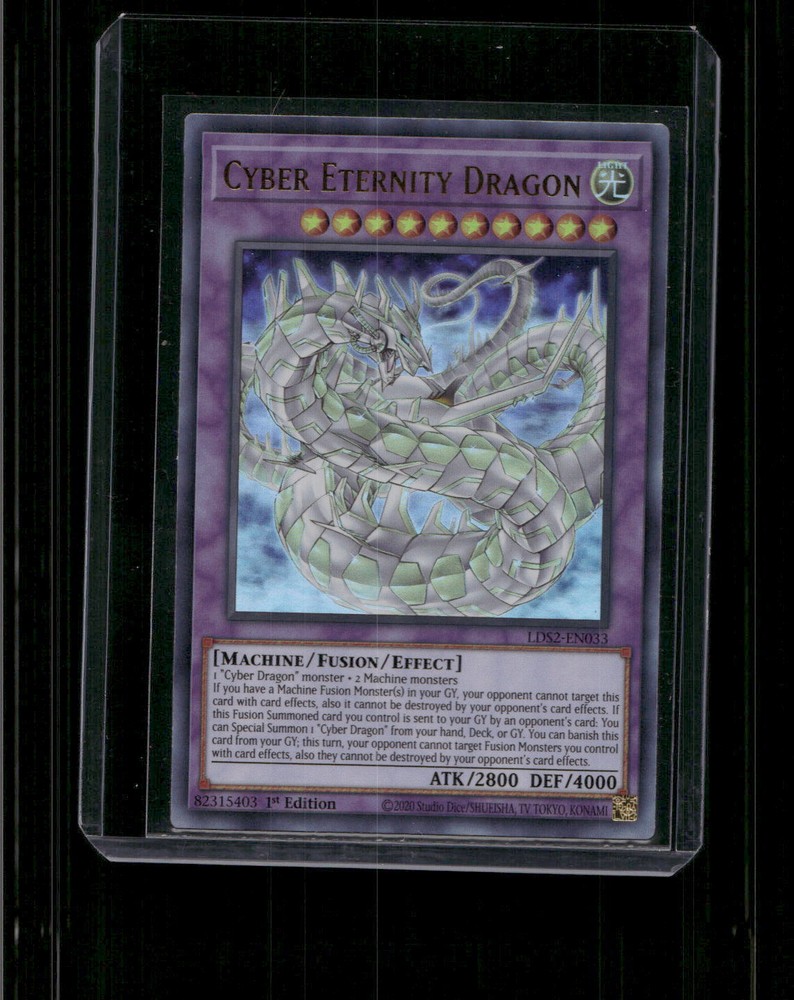 This is a nice example of a Legendary Duelists: Season 2 #LDS2-EN033 Cyber Eternity Dragon Other important information about this card: Ultra Rare In Cyber Eternity Dragon played for the . Please check out our other listings for more great cards.