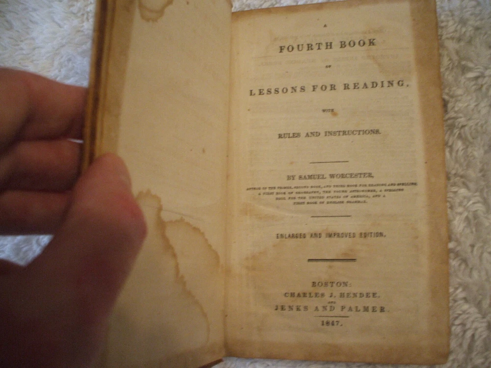 A Fourth Book of Lessons for Reading with Rules and Instruction by Samuel Worcester. Enlarged and Improved Edition. Published by Charles J. Hendee and Jenks and Palmer in 1847. Antique educational book containing instruction, poetry and prose. Fun and interesting curiosity from the distant past.