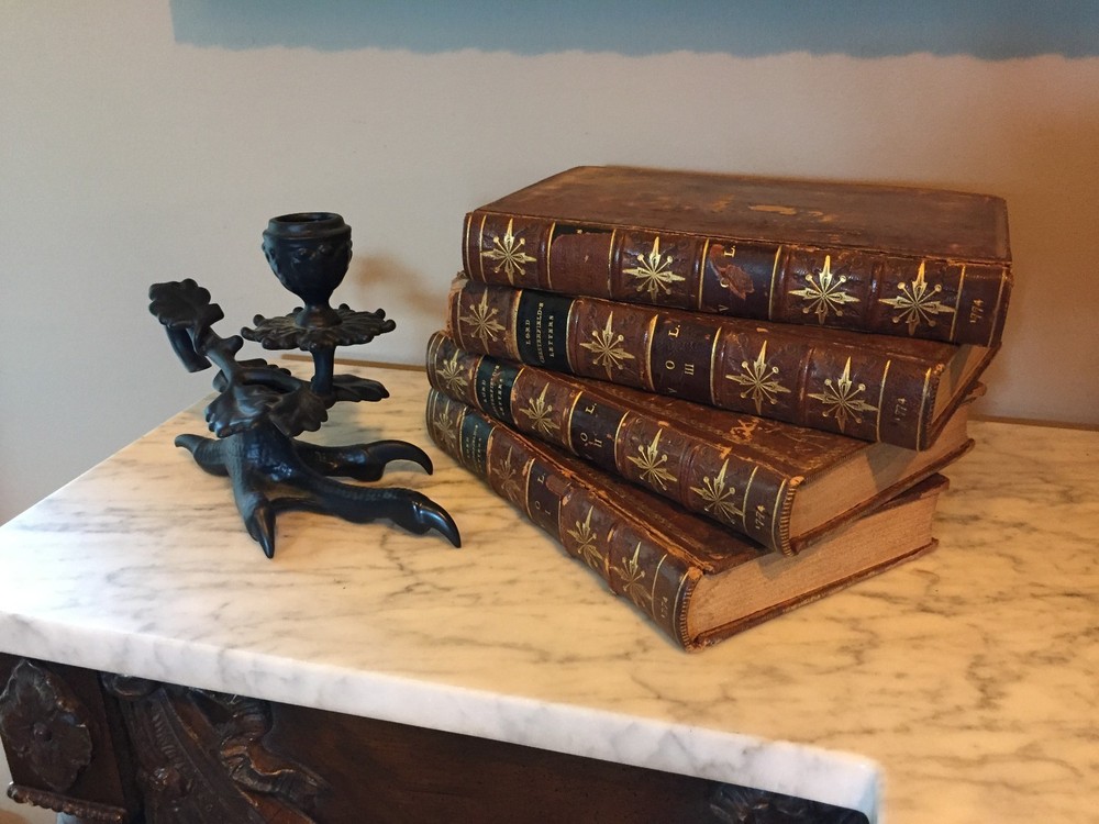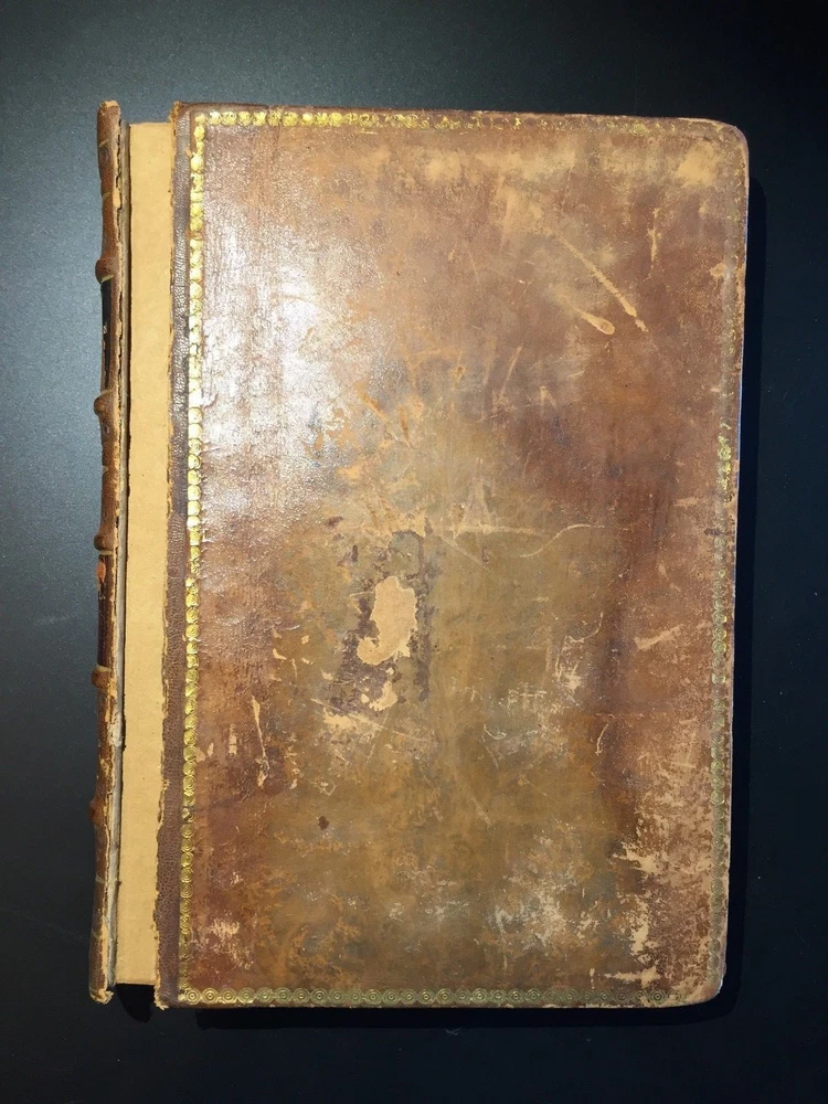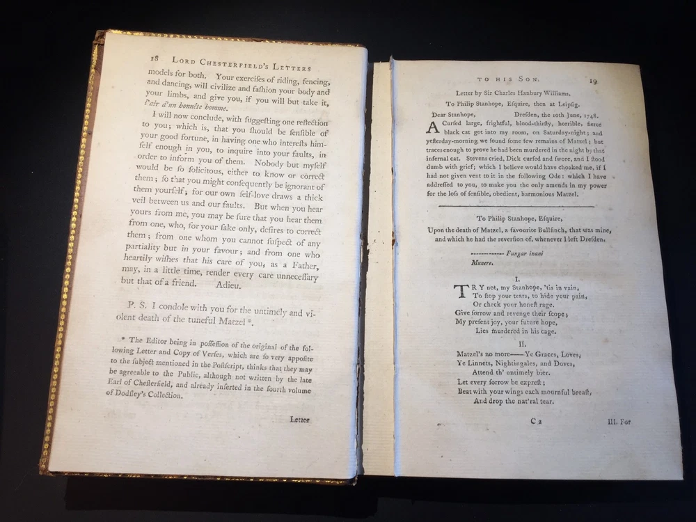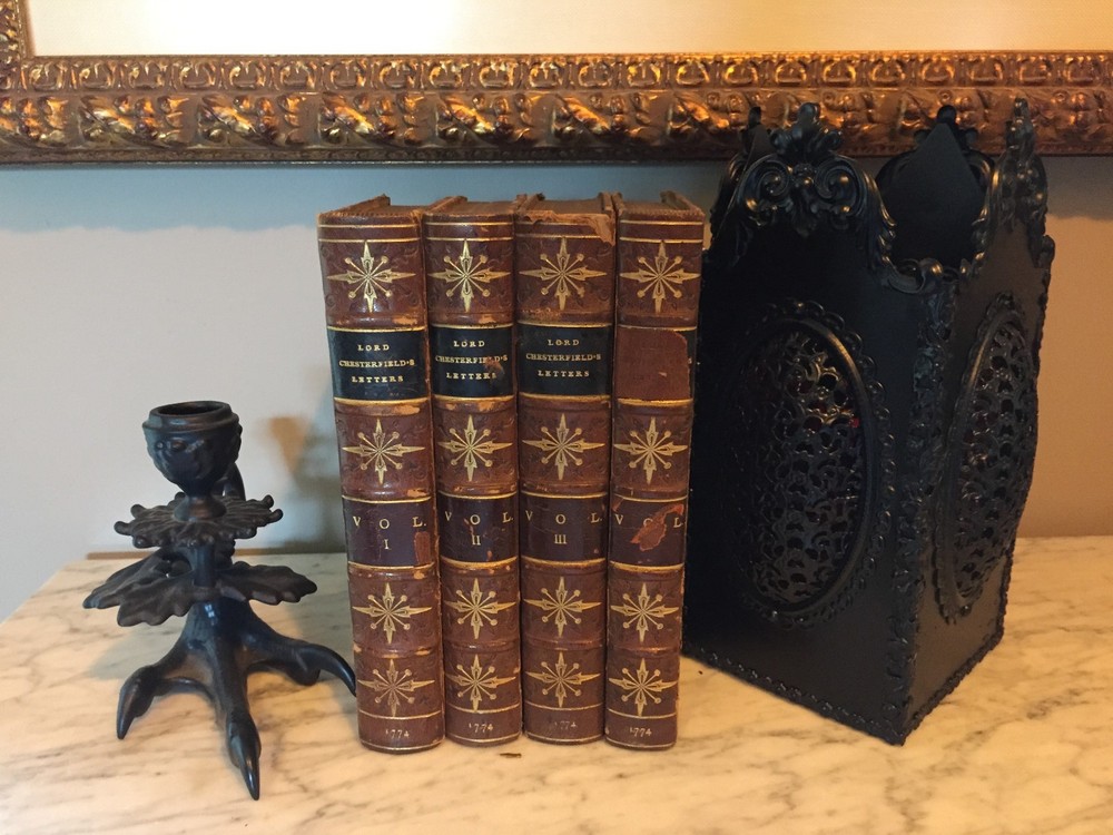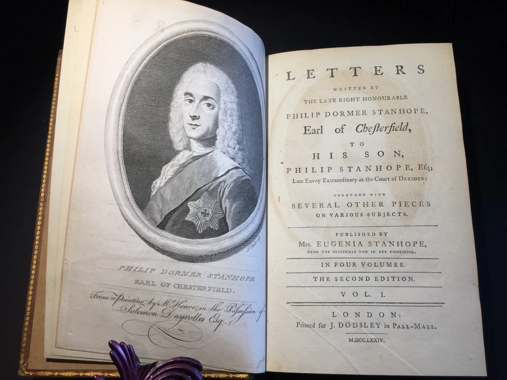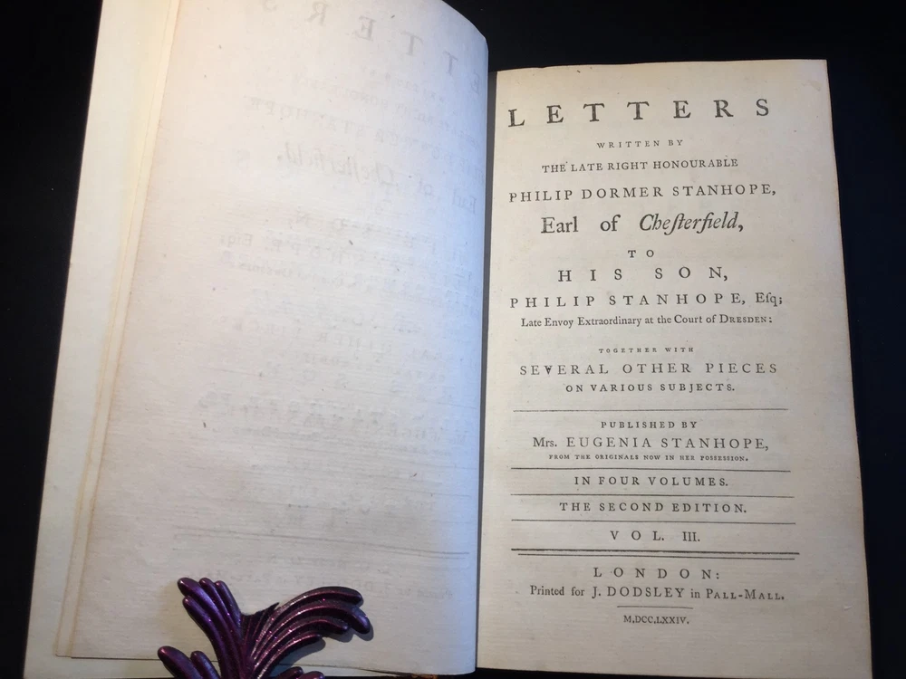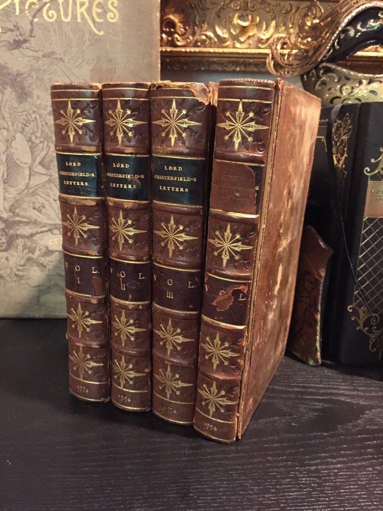 Letters Written by the Late Right Honourable Philip Dormer Stanhope, Earl of Chesterfield, to his Son, Philip Stanhope, Esq; Late Envoy Extraordinary at the Court of Dresden: Together with several other pieces on various subjects. Published by Mrs. Eugenia Stanhope From originals in her possession. In Four Volumes --- COMPLETE IN FOUR VOLUMES HAND-TOOLED LEATHER SECOND EDITION --- Publisher: J. Dodsley in Pall-Mall, London Copyright: 1774 --- CONDITION: These books are in good condition for their age. Leather. Covers show signs of wear along edges and corners. Hinges are weak on three volumes; the cover is detached from one (Vol IV). Beautiful hand-tooled spines with five raised bands. George Harrison Ex Libris on all of them. Text block is in great shape. These books are prime candidates for rebinding. 10 lbs, 5.25" x 8" _gsrx_vers_795 (GS 7.0.7 (795))