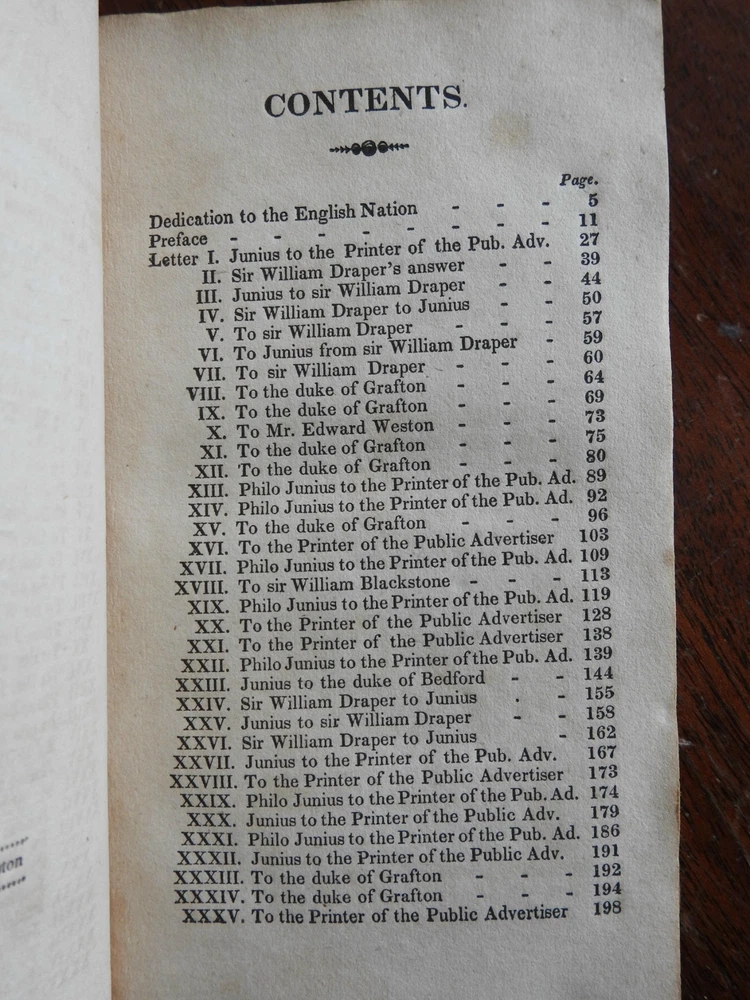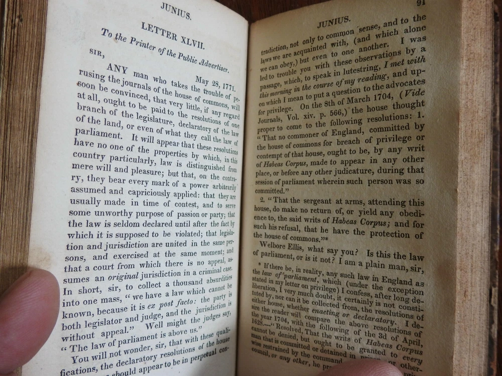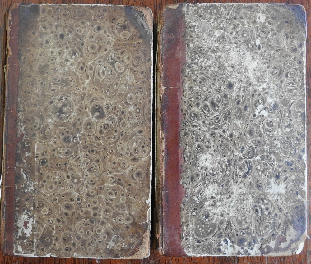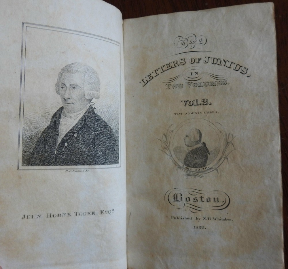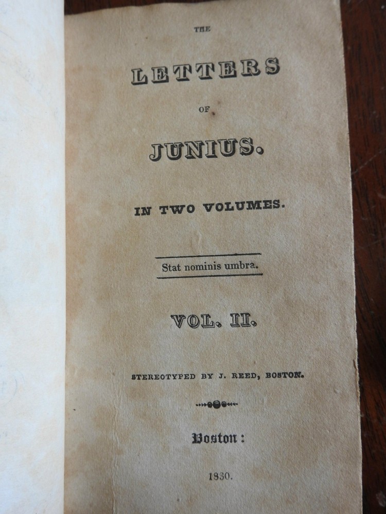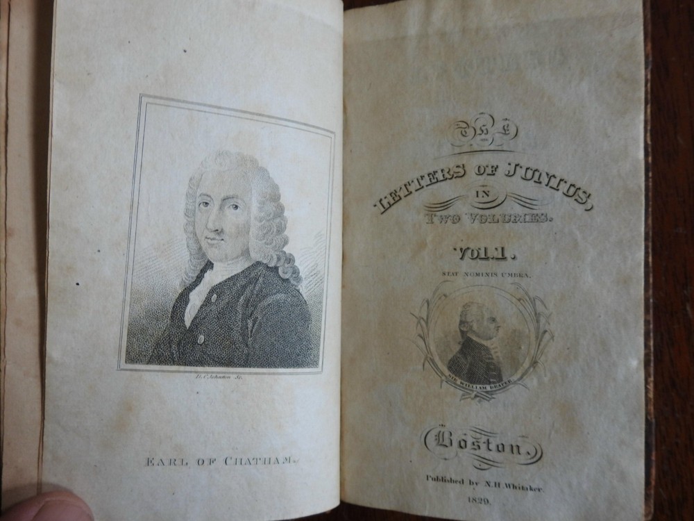 Letters of Junius Political Correspondence Writing 1830 leather 2 vol. set Letters of Junius Political Correspondence Writing 1830 leather 2 vol. set (Old Books, Letters of Junius, Correspondence, Political Writings, Leather Books, 19th Century Books). The Letters of Junius in Two Volumes. Published 1829-30, Boston by J. Reed. 2 Volumes, pp. 216, 215. Text in English. Engraved portrait and half title in each volume (by D.C. Johnson) Period 1/2 leather binding, smooth spines, gilt bands and compartment decorations, marbled covers. Bindings well age worn- All joints cracked, front covers held only by binding cords, leather dried, scuffed and chipped, spine leather mostly perished or chipped, but otherwise text blocks remains clean, tight, and sound. Book remains attractive and display a pleasing and unique age patina. Please review photos for more detail and our best attempt to convey how this antique set survives. Book Measures c. 6" H x 3 1/2" W. [B338].