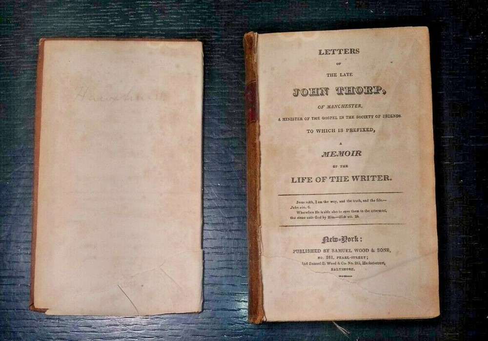 Letter of the Late John Thorp, of Manchester, A Minister of the Gospel in the Society of Friends. A Memoir of the Life of the Writer. Published by Samuel Wood & Sons. The book is a hardcover, leather binding. The back and front covers need to be reattached. One of the cover pages ripped away with the cover. Some staining and discoloration to the pages.