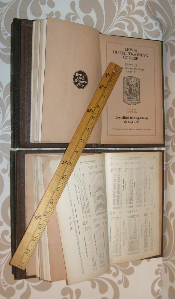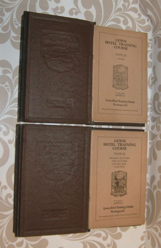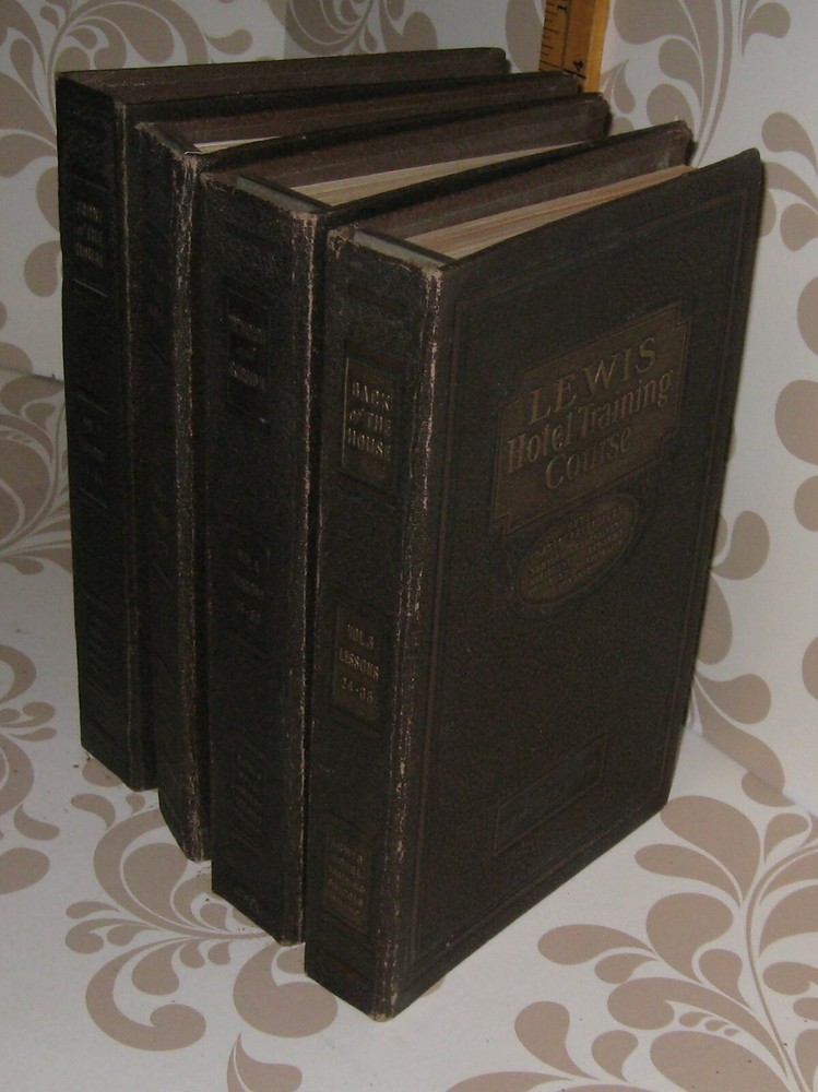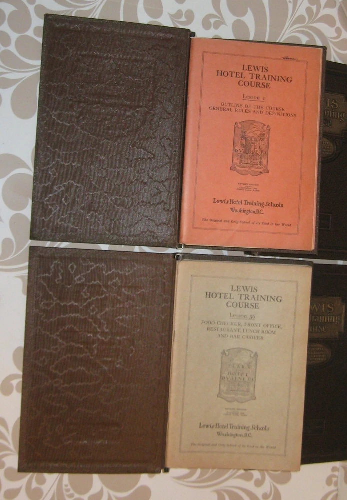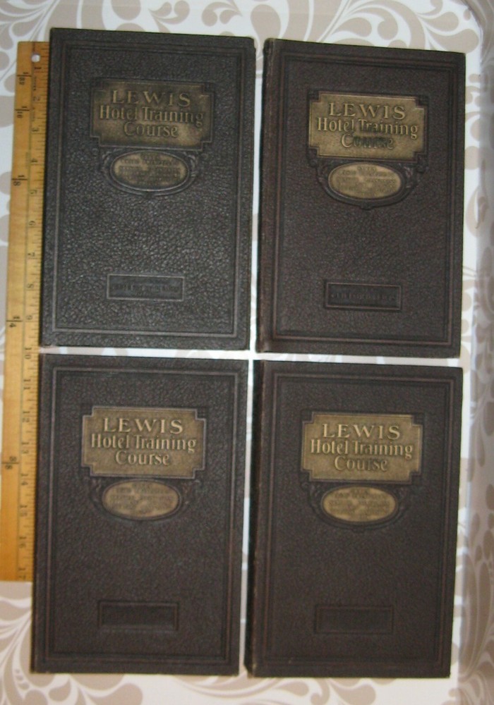 Title/Description: Vintage Leather Lewis Hotel Training Course vol. 1-4 containing lessons 1-50 showing light use Year/Number: 1934-1936 vol. 1-4 Make/Producer: Clifford Lewis Please refer to the photos, in very nice shape with light use in that it looks like the student only completed the first book a just started the second book with a couple penciled notations inside and couple penned notes on a couple covers, questions at the back of each study book and graded test papers for the first volume and part of the second, many subjects in this training set from General Rules to Lessee, Owner Operator including Pastry, Meat-cutter, Steward, Matitre d'Hotel, Captain and more than enough skills to fill a town. Grading is my best guess, I am not a professional appraiser, thank you for looking.