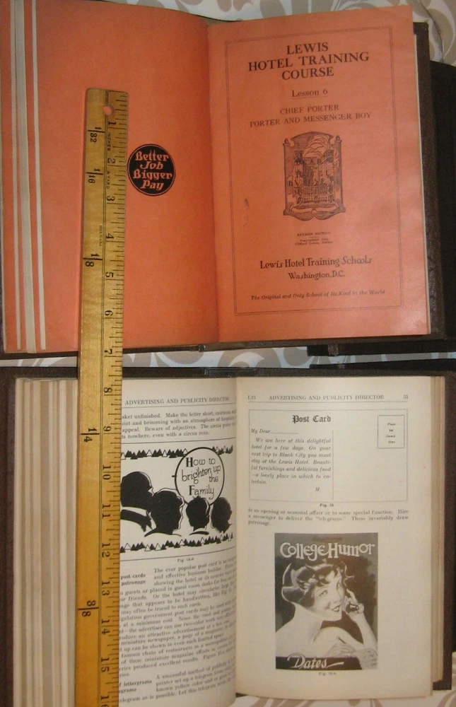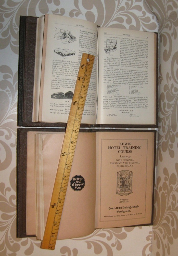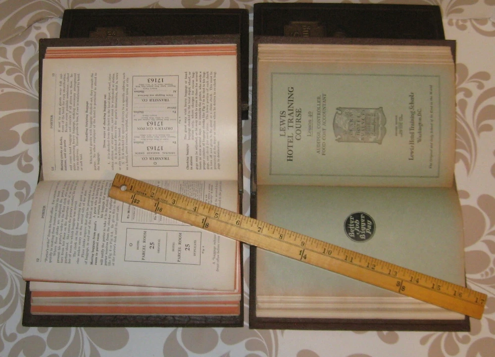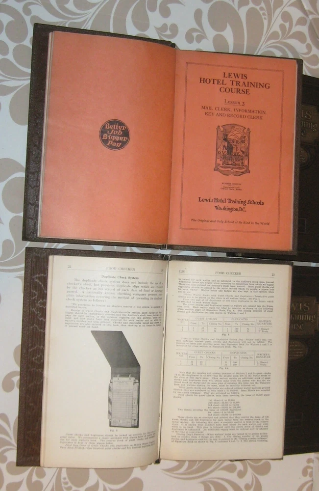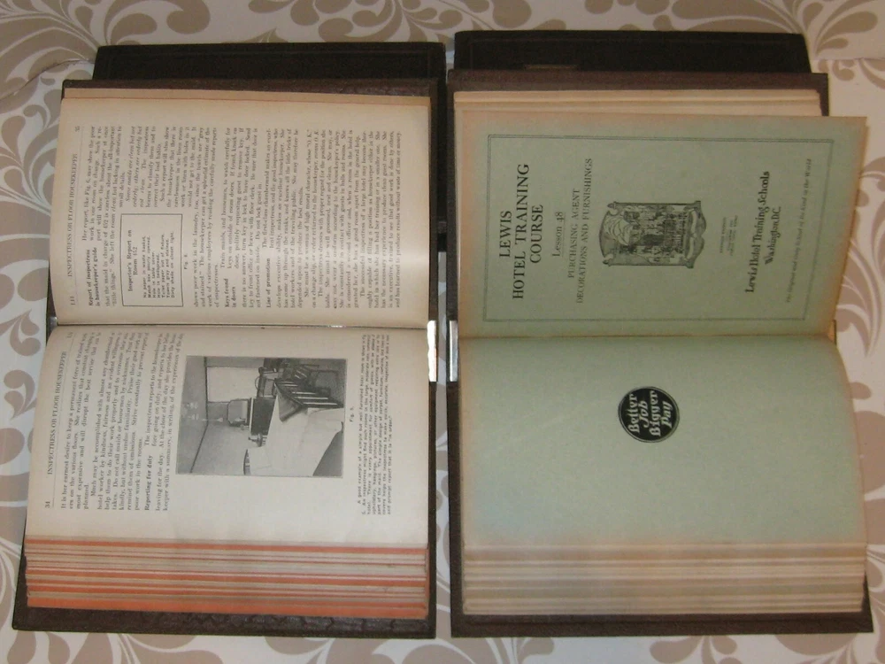 Title/Description: Vintage Leather Lewis Hotel Training Course vol. 1-4 containing lessons 1-50 showing light use Year/Number: 1934-1936 vol. 1-4 Make/Producer: Clifford Lewis Please refer to the photos, in very nice shape with light use in that it looks like the student only completed the first book a just started the second book with a couple penciled notations inside and couple penned notes on a couple covers, questions at the back of each study book and graded test papers for the first volume and part of the second, many subjects in this training set from General Rules to Lessee, Owner Operator including Pastry, Meat-cutter, Steward, Matitre d'Hotel, Captain and more than enough skills to fill a town. Grading is my best guess, I am not a professional appraiser, thank you for looking.