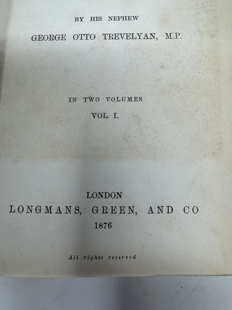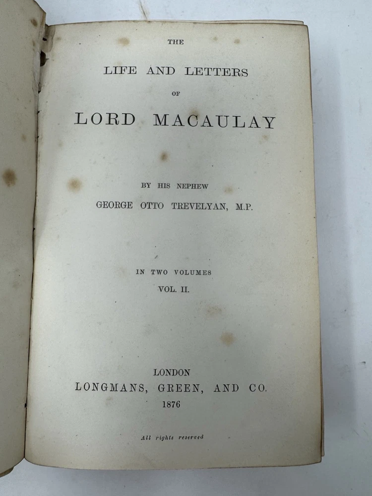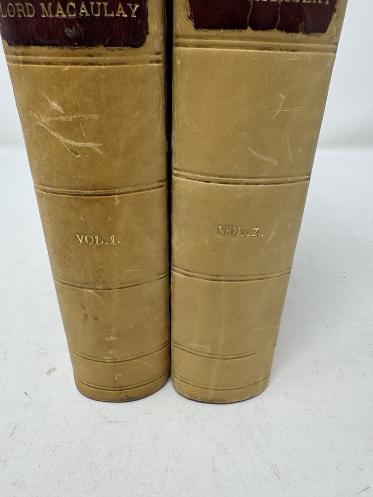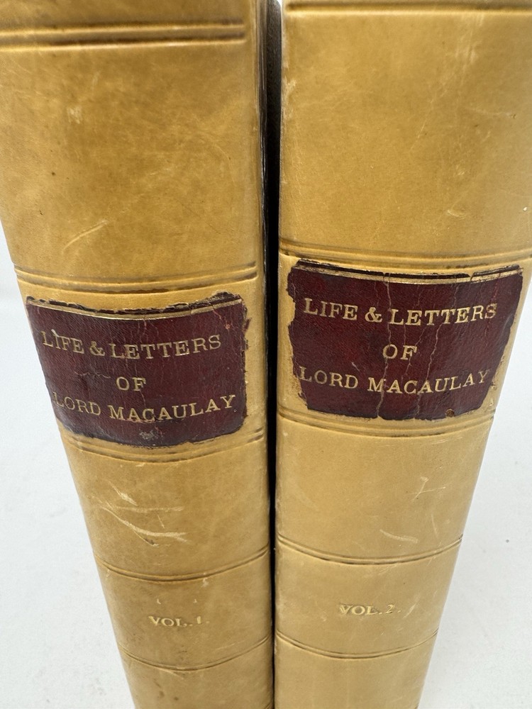 Delve into the rich tapestry of Lord Macaulay's life and times with the 1876 first edition of "Life & Letters of Lord Macaulay," volumes 1 and 2. Bound in elegant leather, this set is a treasure for both bibliophiles and history enthusiasts. The work, penned by Trevelyan, offers an insightful exploration into the political and literary realms, presented in the original English language. Published by Longmans Green Co. in London, these volumes are a testament to the historical legacy of Europe. They are a fine representation of 19th-century biography and autobiography, reflecting the era's aesthetic and intellectual pursuits. An original piece, it stands as a remarkable find for collectors and scholars alike.