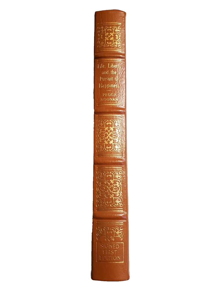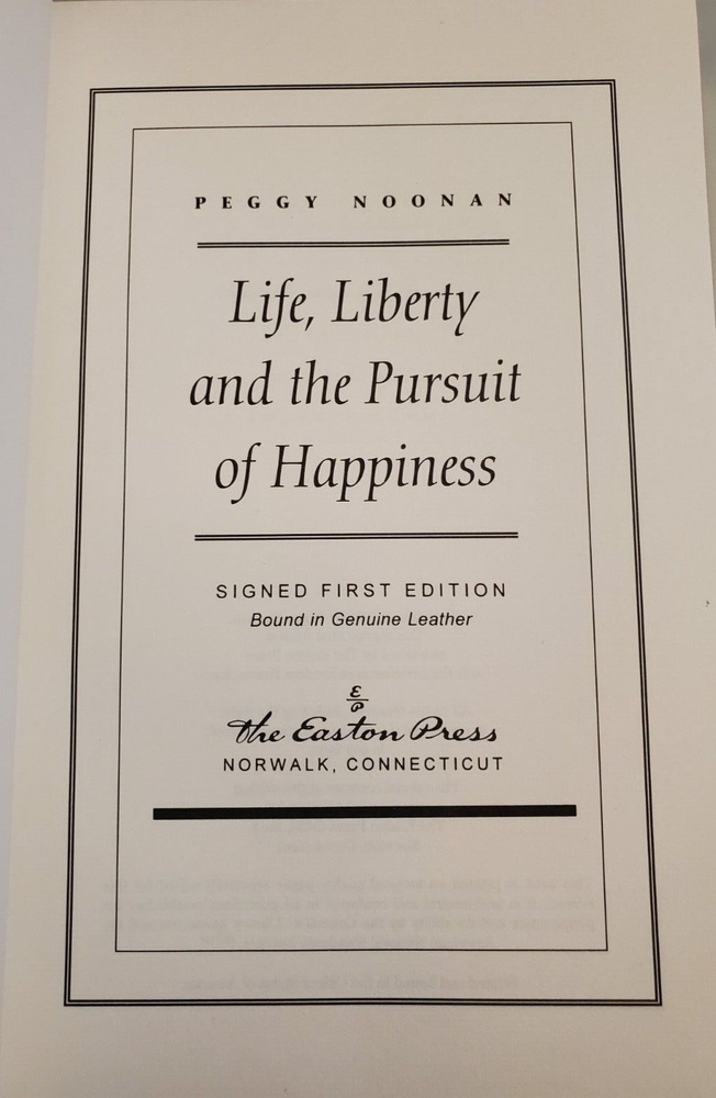Life, Liberty and the Pursuit of Happiness by Peggy Noonan. Like new Easton Press Signed First Edition. This hardcover book boasts the features that are expected from Easton Press: signed by the author, bound in genuine leather, with gold lettering and decorations on the cover and spine, gilded page edging and a sewn-in satin bookmark. Decorative pattern is the same on front and back cover. The text is printed on archival quality acid-neutral paper. These books are a pleasure both to display and to read.