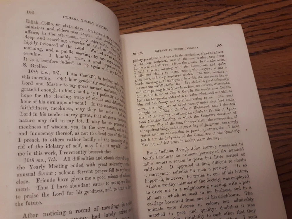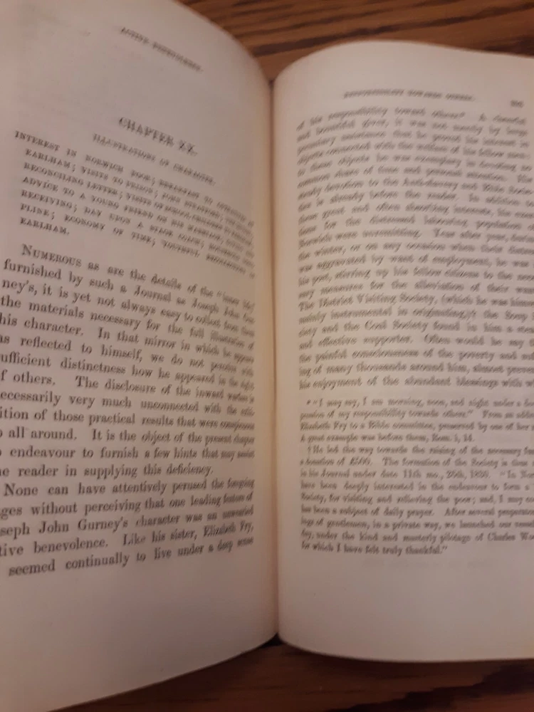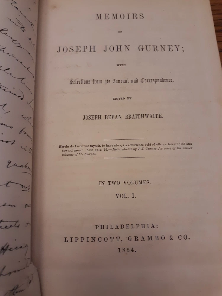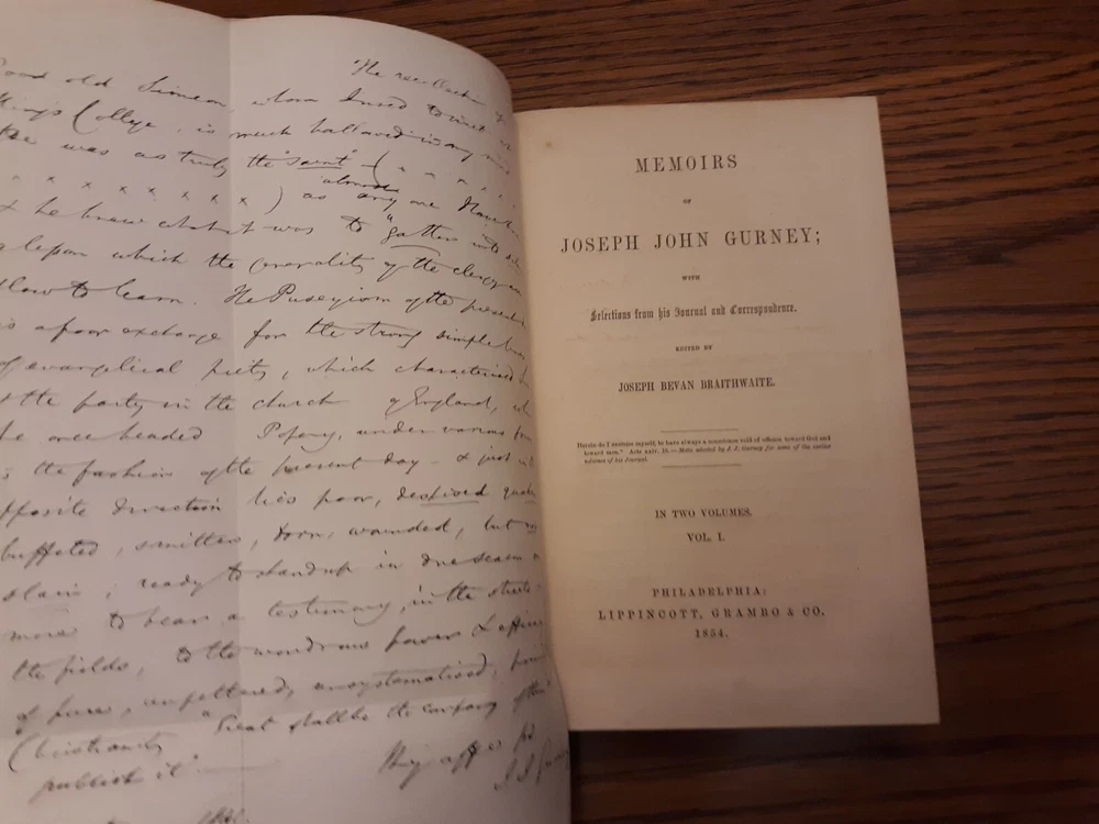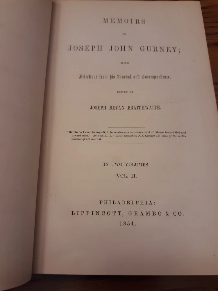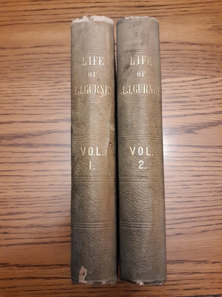Media mail can sometimes take much longer than the estimate. I have no control over that. I'm offering priority mail as an option. It's faster and more reliable, but not infallible. Unfortunately it is much more expensive than media mail. _______________________________________________ Life Of J. J. Gurney, Vol. 1 And Vol. 2, 1854, Lippincott, Grambo & Co. Books are in very good condition considering their age. Covers have some rub wear. Spines have fading. Corners bumped and frayed. Bindings and cover hinges are intact and appear very solid. Inscriptions on front endpapers. Small notation on back endpaper of vol. 2. No other markings noted. Light to moderate foxing on pastedowns and endpapers. Minimal small age-spots on text pages. There are a few small stains on page edges. The 2 most conspicuous blemishes were noted in vol. 1 and are shown in last 2 photos. Foldout facsimile of a letter written by J. J. Gurney at front of vol. 1.