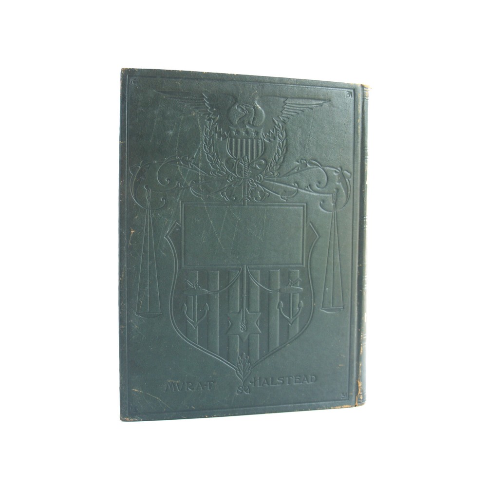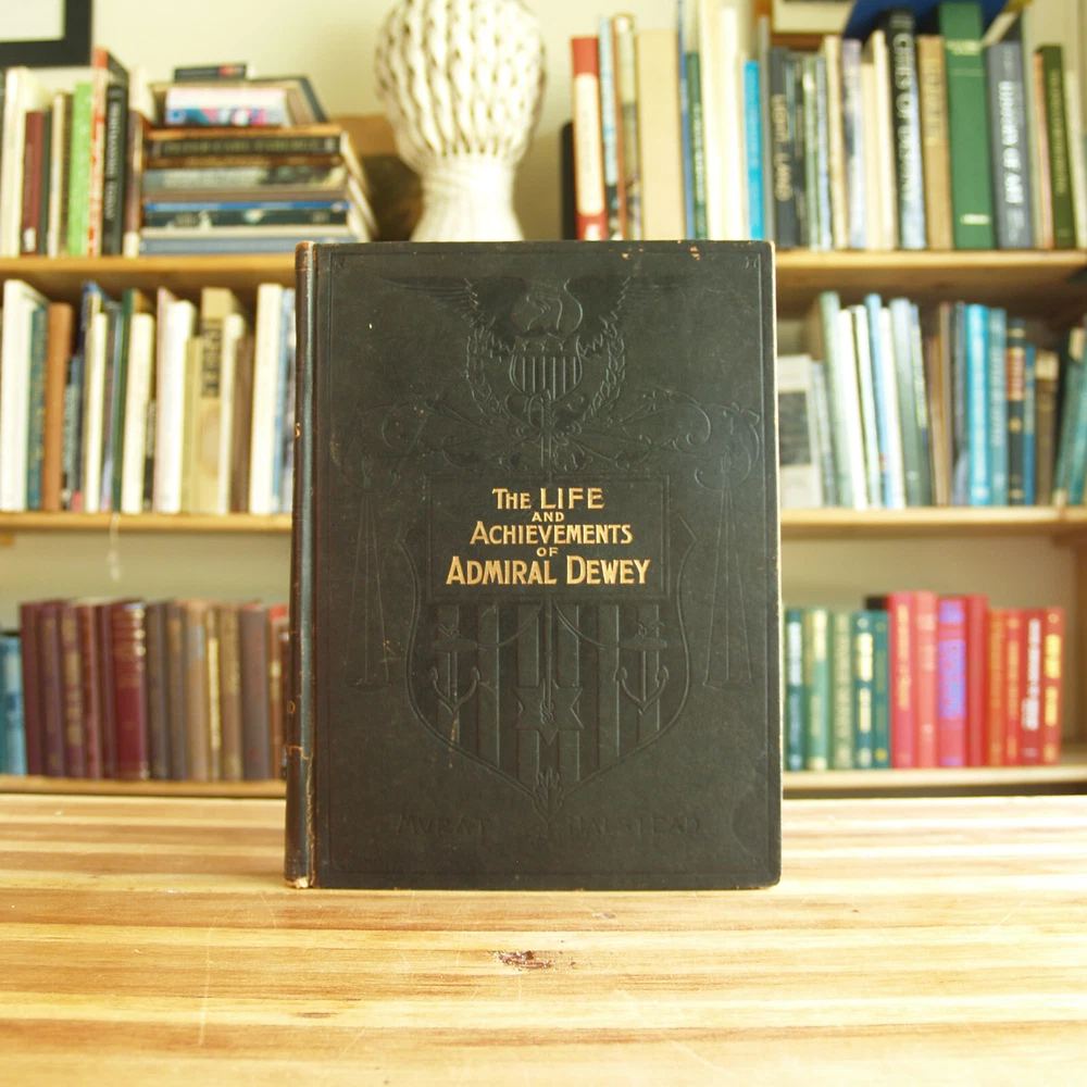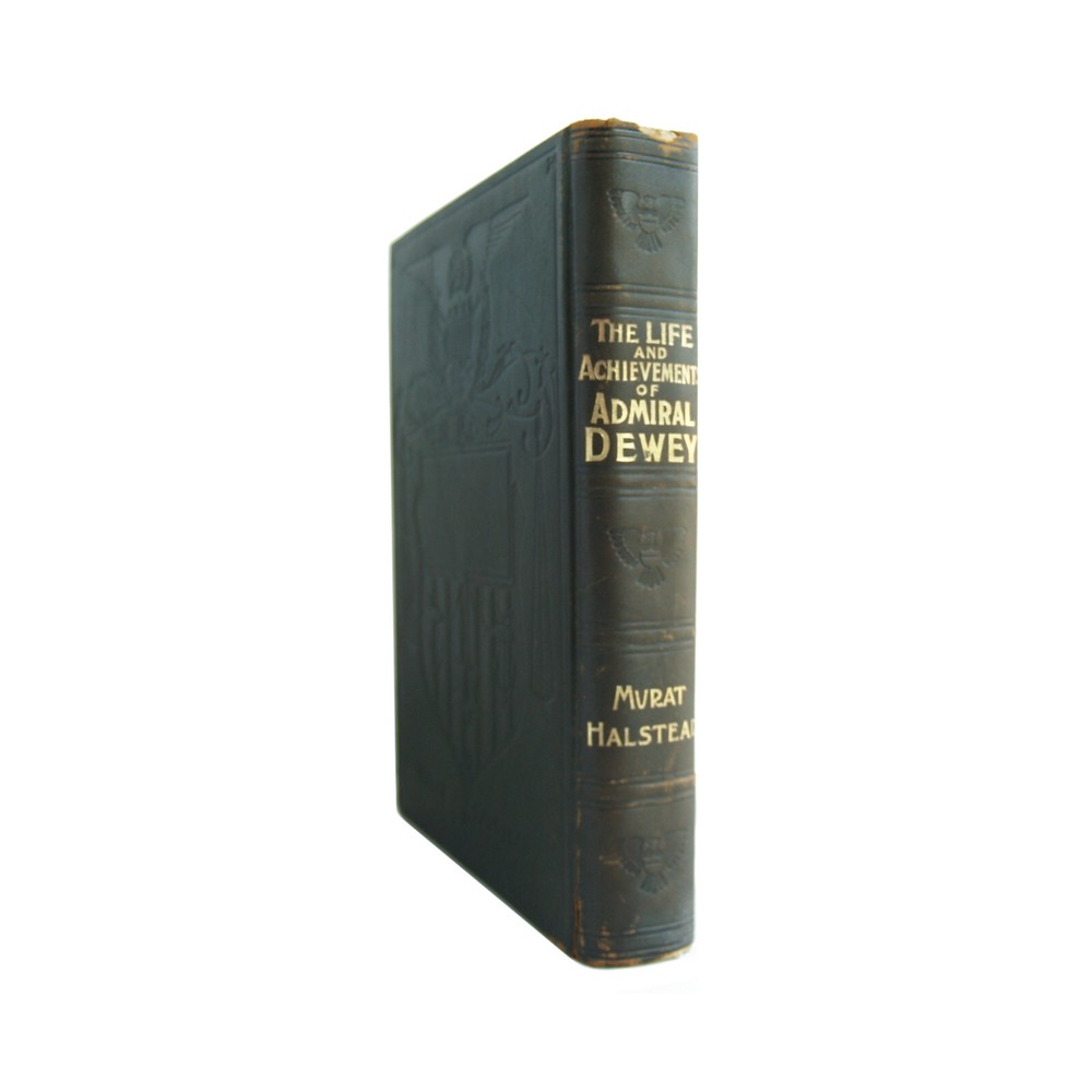 This antique hardcover book is bound in black leather boards with bright gilt lettering and etched decorations featuring an eagle motif and a large shield on the front cover. Wear to spine, inner pages browned, wear and soil. Decorative endpapers. All page edges gilt. Illustrated with black-and-white pictures, this book tells the story of Admiral Dewey's military career. 468 pages; approx. 6"x9". LIFE AND ACHIEVEMENTS OF ADMIRAL DEWEY FROM MONTPELIER TO MANILA Murat Halstead Our Possessions Publishing Co., 1899 First edition