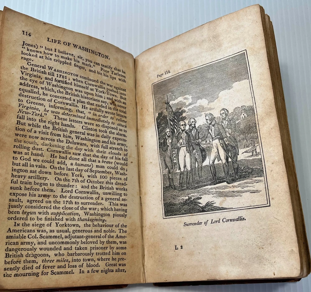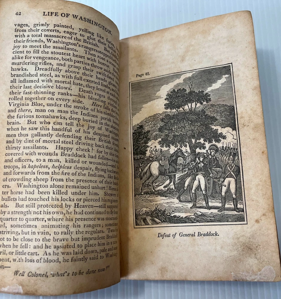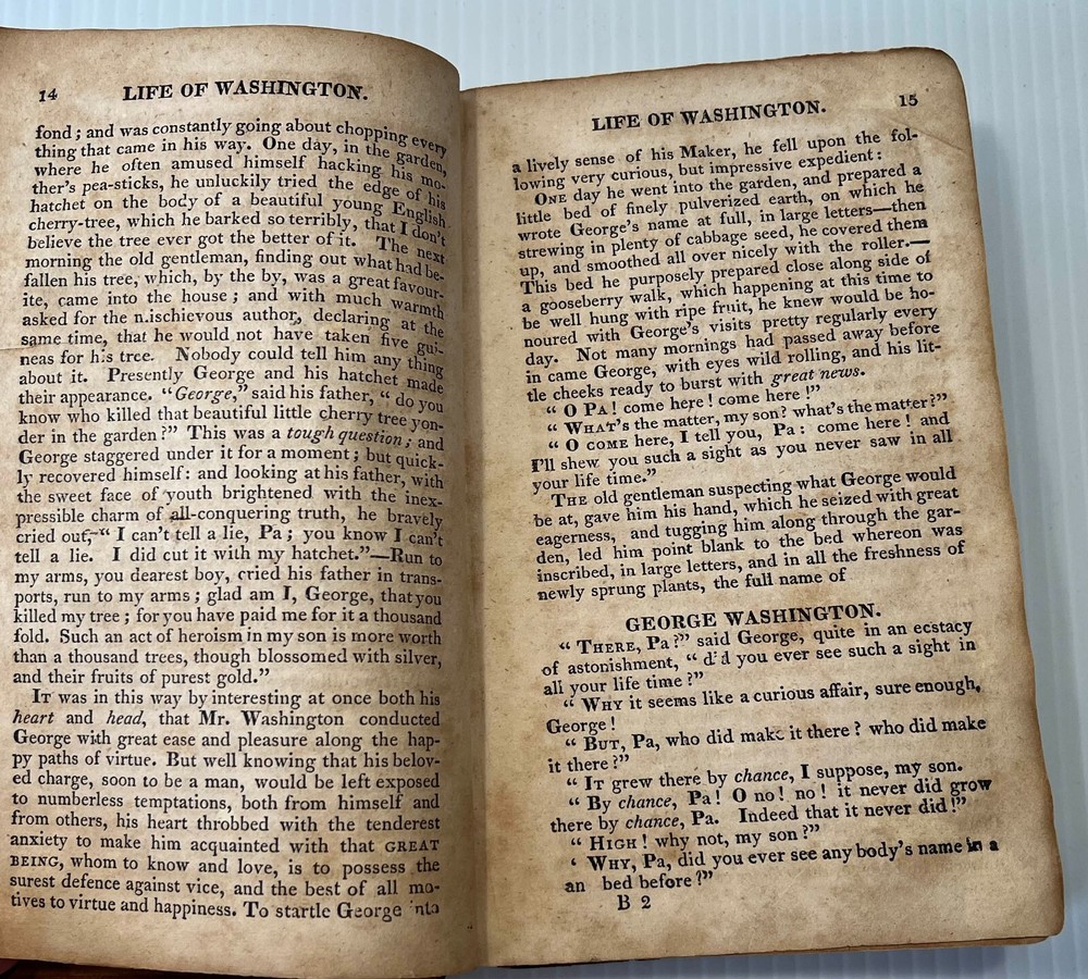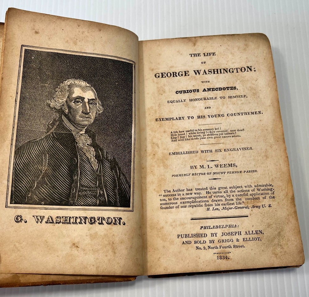 I can't tell a lie, Pa; you know I can't tell a lie. I did cut it with my hatchet. Here we offer Mason Locke Weems's complete and delightful Life of George Washington; with Curious Anecdotes, Equally Honorable to Himself, and Exemplary to his Young Countrymen , published by Joseph Allen, Philadelphia, in 1834. This book is notable as it is the original source of the iconic American "Chopping down the cherry tree" story. The book was first published in 1800, but the cherry tree story was added in an 1806 edition. This edition features six engravings, including a frontispiece of Washington. It is bound in leather with a leather spine label. Well worn boards with cracked and repaired spine (please see pics). Intact endpapers bear period writing. Foxing throughout. Binding is very tight and square; text pages and engravings are very clean, bright and crisp. 228 pages, measures approximately 4.5 x 7-inches. This marvelous collectible will make a wonderful addition to your collection or a very thoughtful gift. Please click HERE to peruse our entire shelf of Americana! ** Have you seen all the amazing first and rare editions of iconic books we offer? We gladly combine shipping and refund the shipping overpayment, so please check out our other items ! -- other auctions of classic antiquarian literature and special gifts!** Thank you for your interest! ***Priority shipping options are available at checkout!***