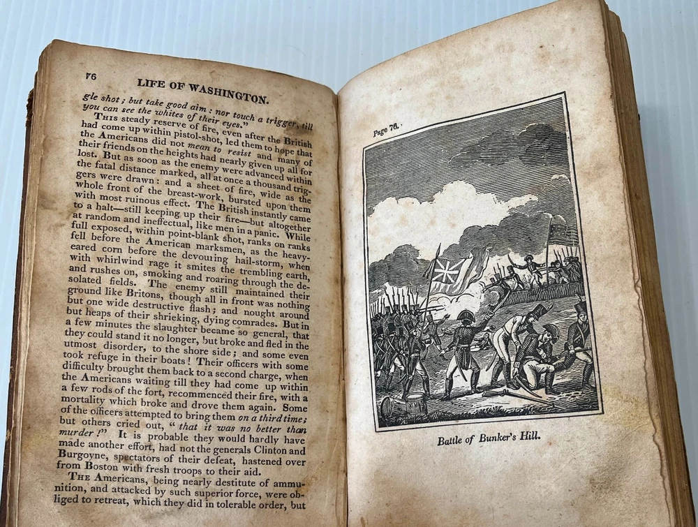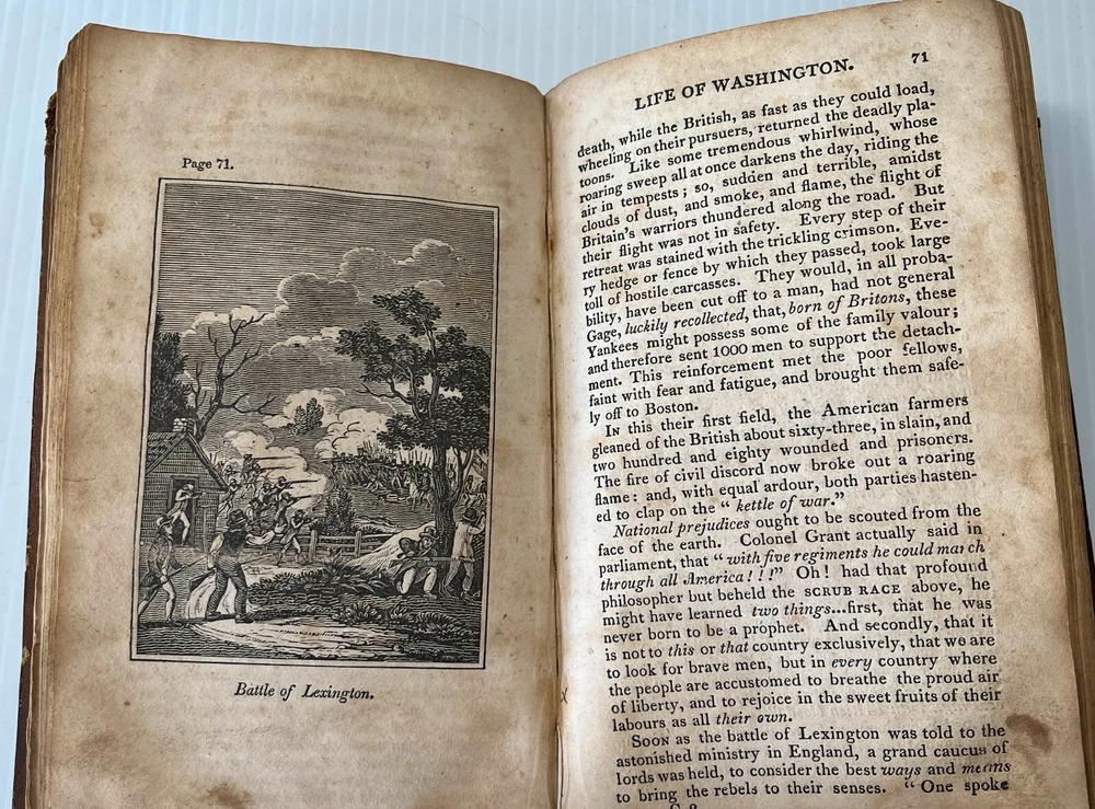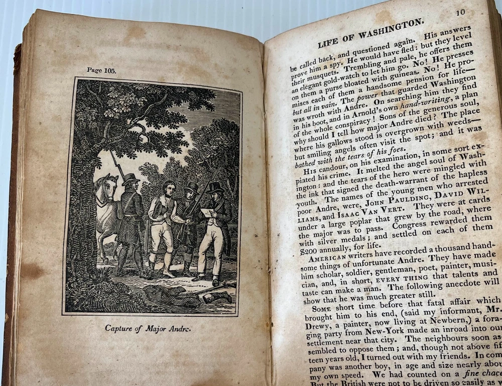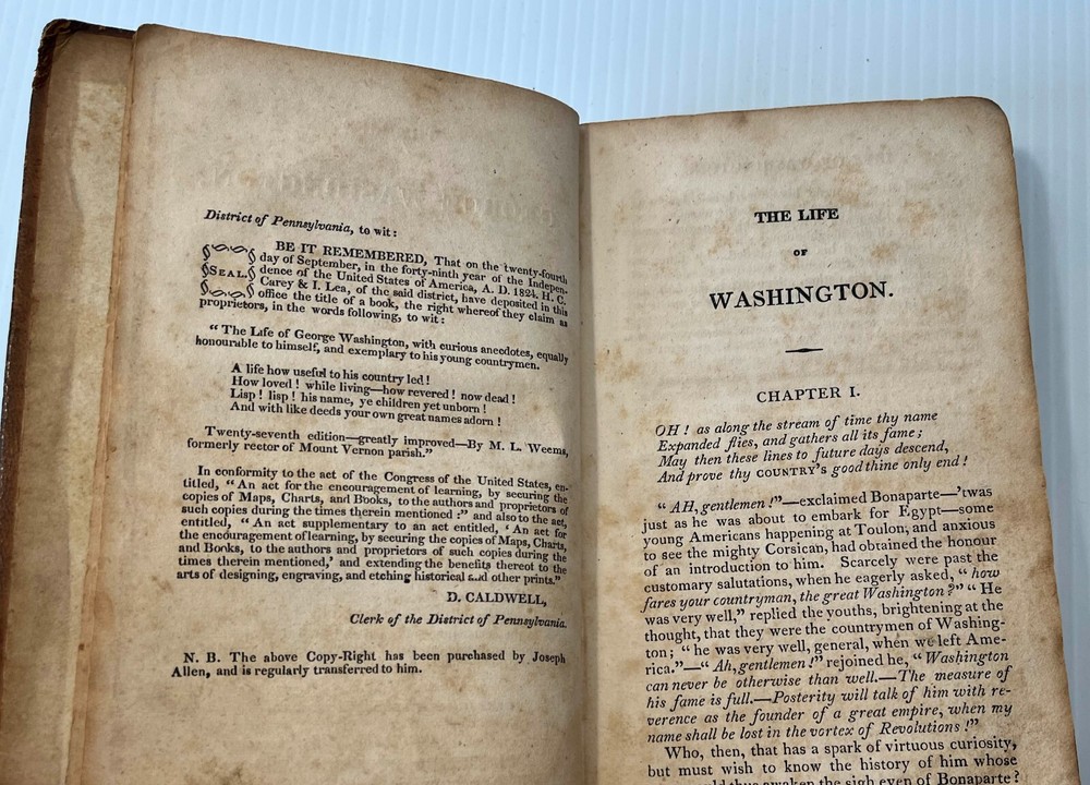 I can't tell a lie, Pa; you know I can't tell a lie. I did cut it with my hatchet. Here we offer Mason Locke Weems's complete and delightful Life of George Washington; with Curious Anecdotes, Equally Honorable to Himself, and Exemplary to his Young Countrymen , published by Joseph Allen, Philadelphia, in 1834. This book is notable as it is the original source of the iconic American "Chopping down the cherry tree" story. The book was first published in 1800, but the cherry tree story was added in an 1806 edition. This edition features six engravings, including a frontispiece of Washington. It is bound in leather with a leather spine label. Well worn boards with cracked and repaired spine (please see pics). Intact endpapers bear period writing. Foxing throughout. Binding is very tight and square; text pages and engravings are very clean, bright and crisp. 228 pages, measures approximately 4.5 x 7-inches. This marvelous collectible will make a wonderful addition to your collection or a very thoughtful gift. Please click HERE to peruse our entire shelf of Americana! ** Have you seen all the amazing first and rare editions of iconic books we offer? We gladly combine shipping and refund the shipping overpayment, so please check out our other items ! -- other auctions of classic antiquarian literature and special gifts!** Thank you for your interest! ***Priority shipping options are available at checkout!***