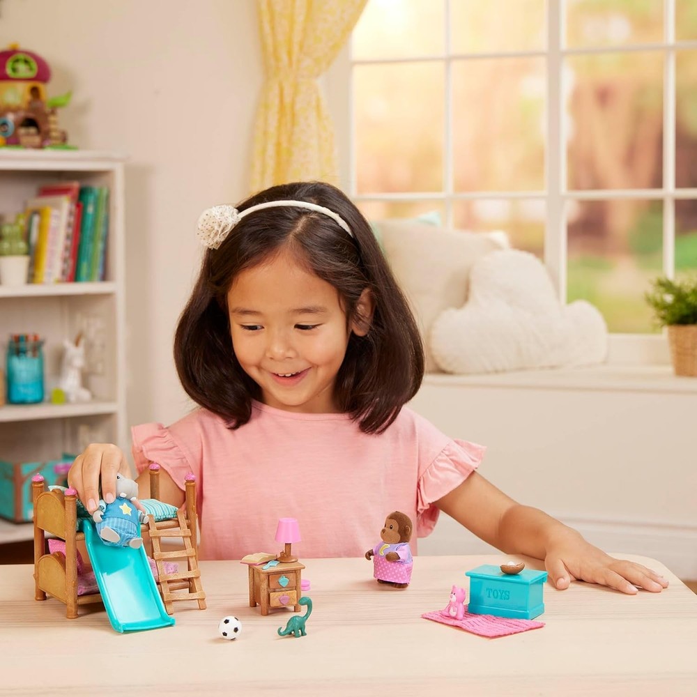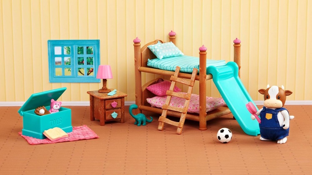 Li'l Woodzeez Bunk Beds Playset – Miniature Bedroom Furniture and Accessories – 18pc Toy Set with Bed, Toys, Book, and More – Gifts for Kids Age 3+ Product Details Product Dimensions: 10 x 3.75 x 8.25 inches Item Weight: 11.6 ounces Country of Origin: China Item model number: 6169Z Manufacturer recommended age: 36 months - 10 years Is Discontinued By Manufacturer: No Release date: December 6, 2019 Manufacturer: Branford Ltd. Bunk Bed Playset: Li’l Woodzeez Bunk Bed Bedroom toy set miniature furniture. Includes: bunk beds, toy dinosaur, soccer ball, baseball glove, teddy bear and more. Encourages Imagination: Your Li’l Woodzeez friends can have a slumber party! Plays Well: Compatible with Li’l Woodzeez animal figurines and competitor toys. Recommended Age: Suitable for kids aged 3 and over. Need a place for your little animal characters to rest after a long day at Honeysuckle Schoolhouse? The Li’l Woodzeez Bunk Bed Bedroom Set is just the thing! This playset comes with lots of miniature furniture, including bunk beds for the Li’l Woodzeez kids. They can climb up to the top bunk with the ladder and whizz down the slide – so fun! Also included is a toy dinosaur, soccer ball, baseball glove, and teddy bear for hours of pretend play. When it’s time for bed, gather up all the toys and store them away in the toy box. Don’t forget to turn off the lamp! Li’l Woodzeez animal figurines sold separately. Recommended for 3 year olds and up.