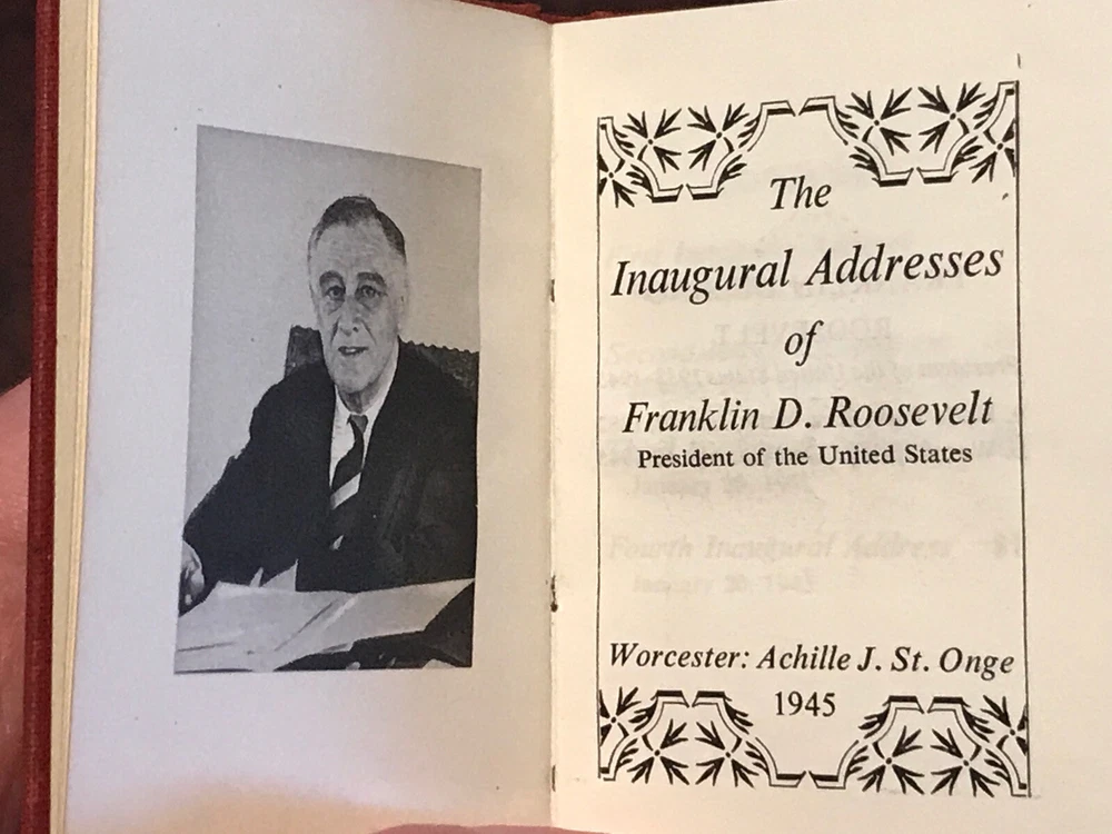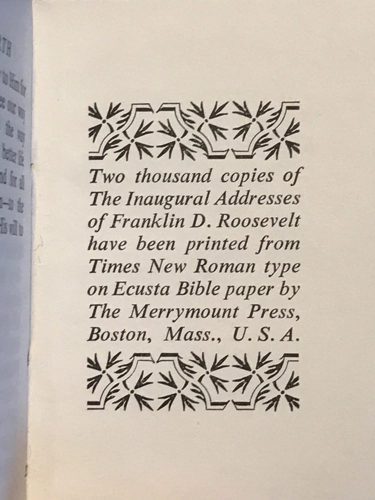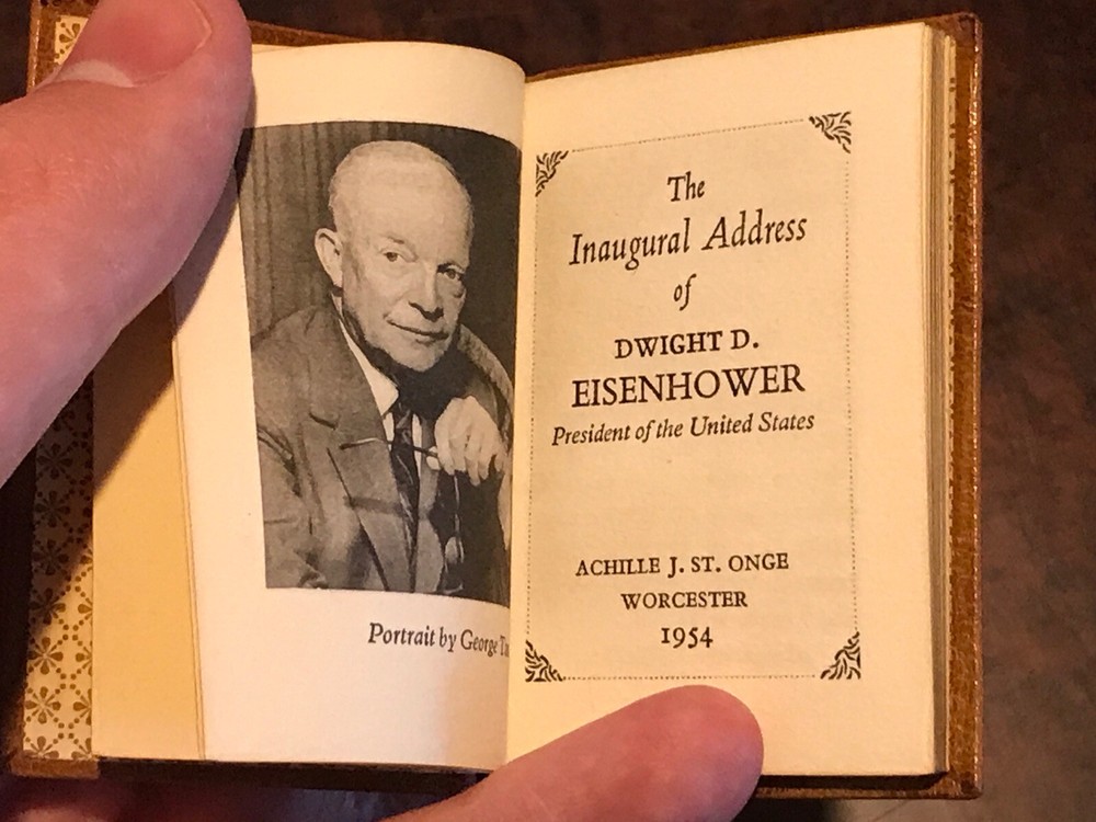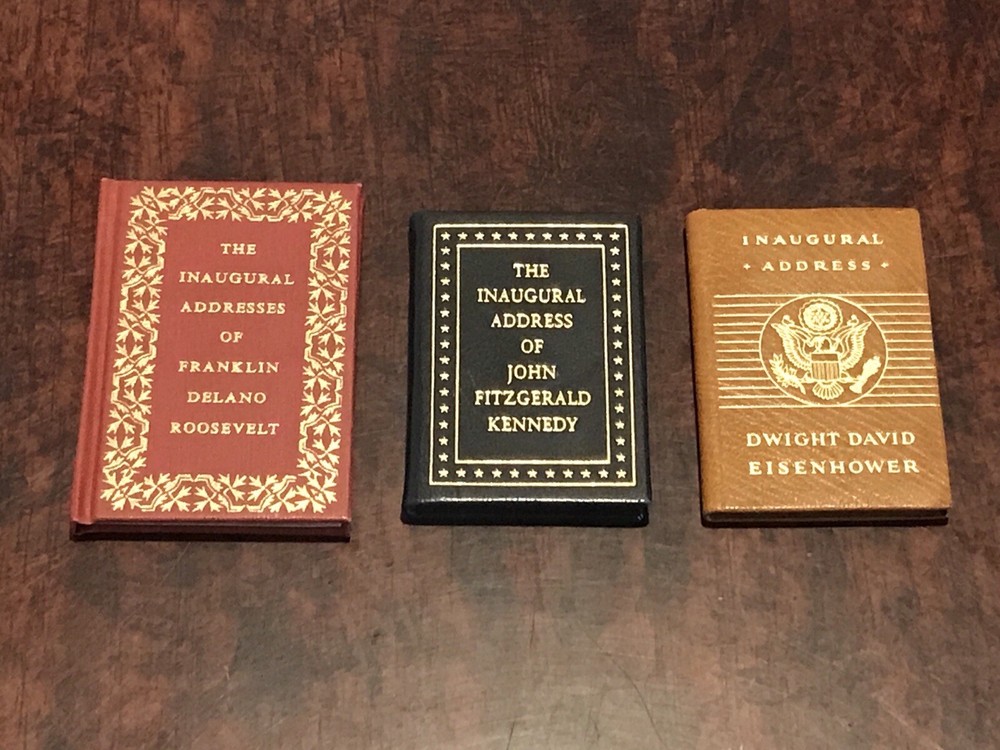 Limited Edition Copies Of The Inaugural Addresses Of JFK, FDR, And Eisenhower. Limited edition of 2000 copies, of The Inaugural Address of Franklin D. Roosevelt President of the United States. From times new Roman type in exista Bible paper by the Merrymount Press, Boston, Mass, USA, full leather, mint condition. 3.25x2.25 in. Limited edition of 1000 copies, of The Inaugural Address of Dwight D. Eisenhower President of the United States . This book has been printed from bembo type on W. S. Hodgkinson’s hand made pure rag wove paper by the Chiswick Press, London, and bound by Sangorski & Sutcliffe, London. Full leather. Mint condition. 2.75x2 in. And a copy of The Inaugural Address of John Fitzgerald Kennedy President of the United States Delivered at the Capitol/Washington January 20, 1961 . Printed from Lutetia type on ‘Old Kentucky Linen’ paper by Joh. Enschede en Zonen Haarlem/Holland. Full leather. Mint condition. 2.75x2 in. All of them have small pencil writings on the first pages.