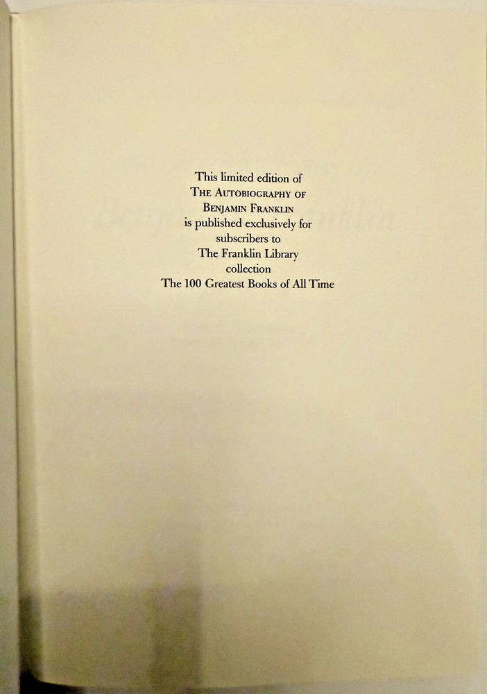 Experience the charm of historical literature with the Limited Edition Leather Franklin Library The Autobiography of Benjamin Franklin . This luxurious collector's item, published in 1979, features embossed leather and illustrious artwork by Thomas Hart Benton. The book offers a fascinating glimpse into the life of one of America's most admired figures, written by John Bigelow and presented in English.This original edition is a treasure for any book lover or history enthusiast. It is a perfect addition to any library, and its unique features make it a conversation starter. Get your hands on this limited edition piece, published in Pennsylvania, and add a touch of North American history to your collection.