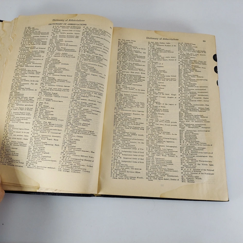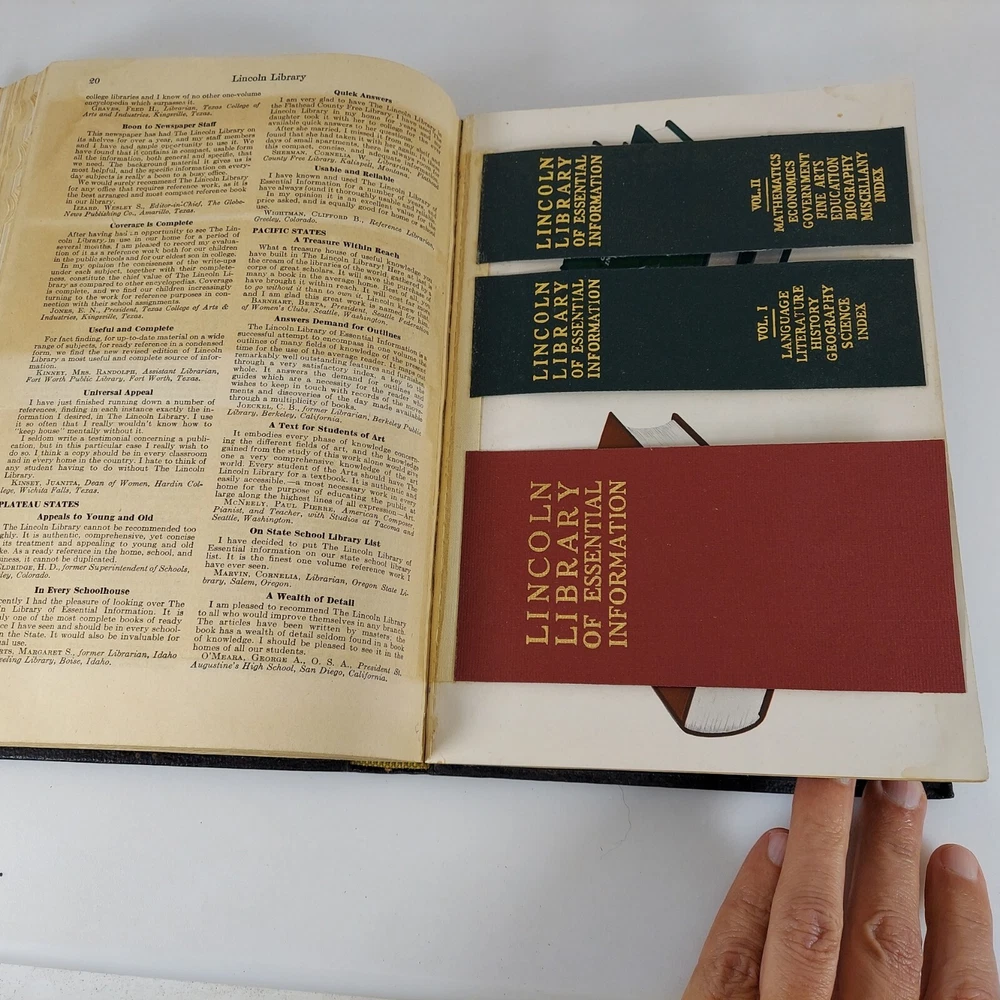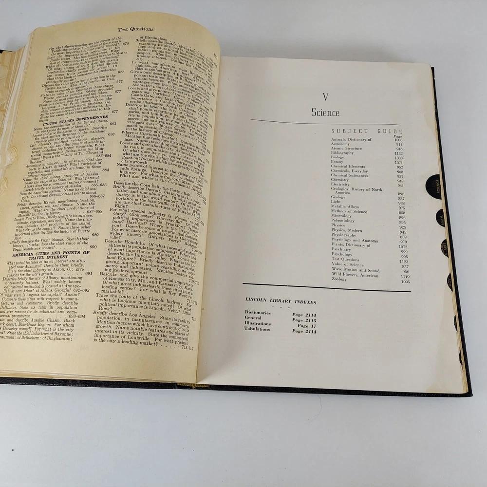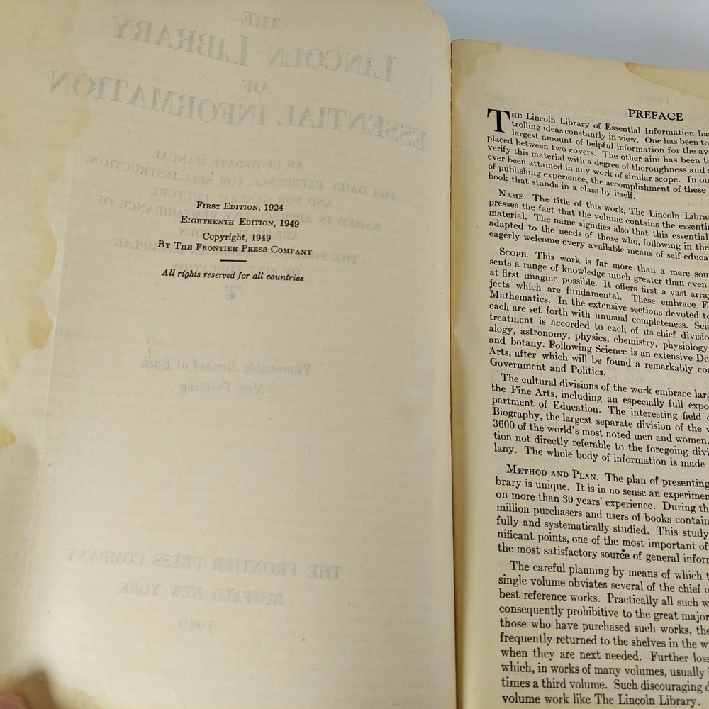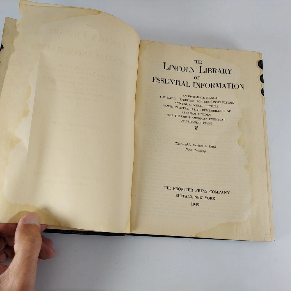 Lincoln Library of Essential Information Leather Tabbed Illustrated 1949. Condition is Acceptable with cover wear and staining, light tanning and evidence of moisture exposure on pages as shown. A still very usable copy. Shipped with USPS Media Mail