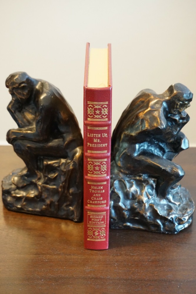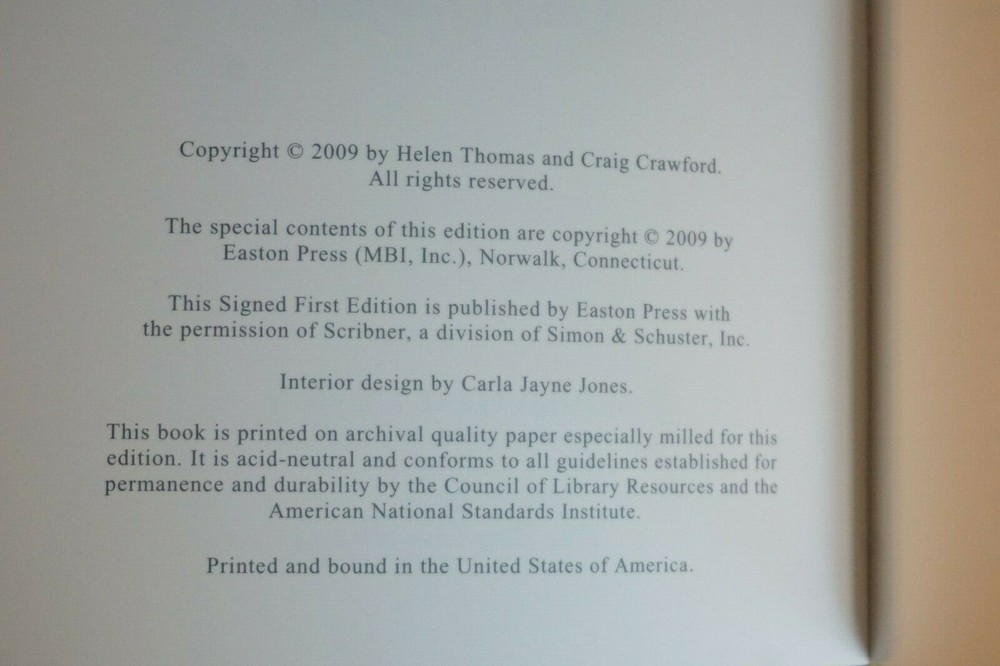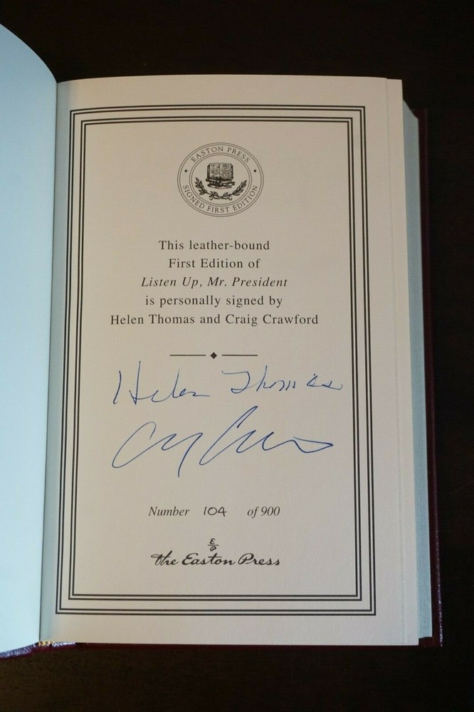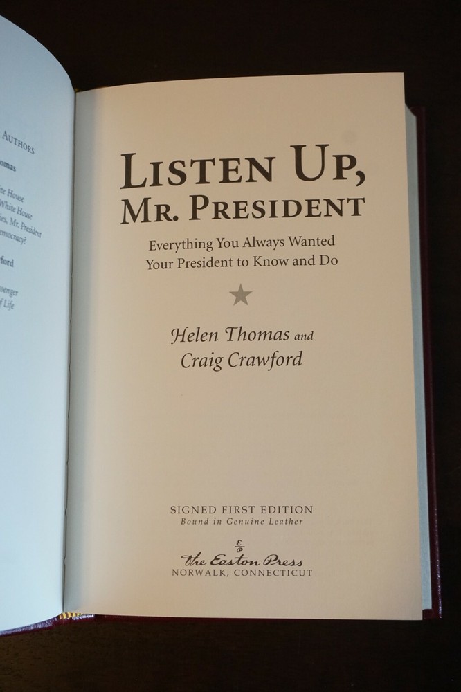 Wonderful Limited Edition Signed 1st Edition copy of Listen Up, Mr. President by Helen Thomas and Craig Crawford. Published in 2009 by Easton Press of Norwalk, Connecticut. The leather-bound book is in very good condition, with minimal wear to the cover and edges. Great find at a great price! Please note the S&H charges, which include USPS postage, materials, and handling. The pictured bookends are not included in the sale. View our other eBay listings at Weiss Lane Books! https://www.ebay.com/str/Weiss-Lane-Books
