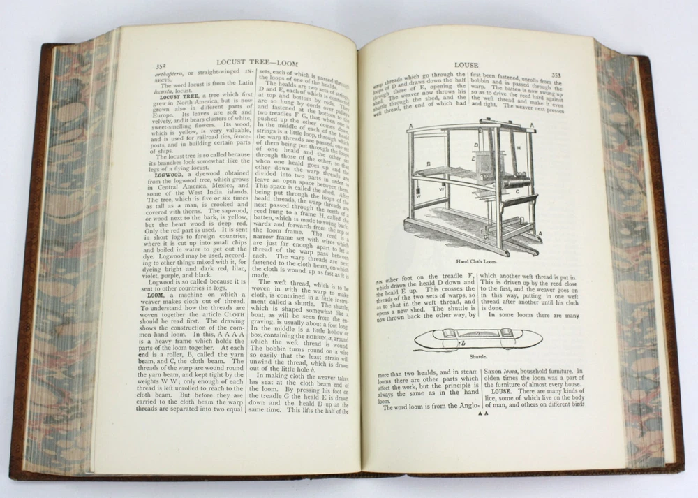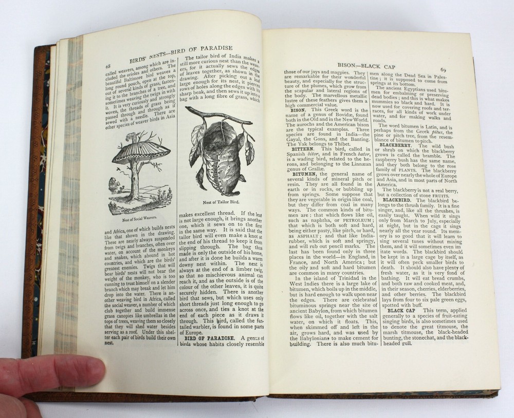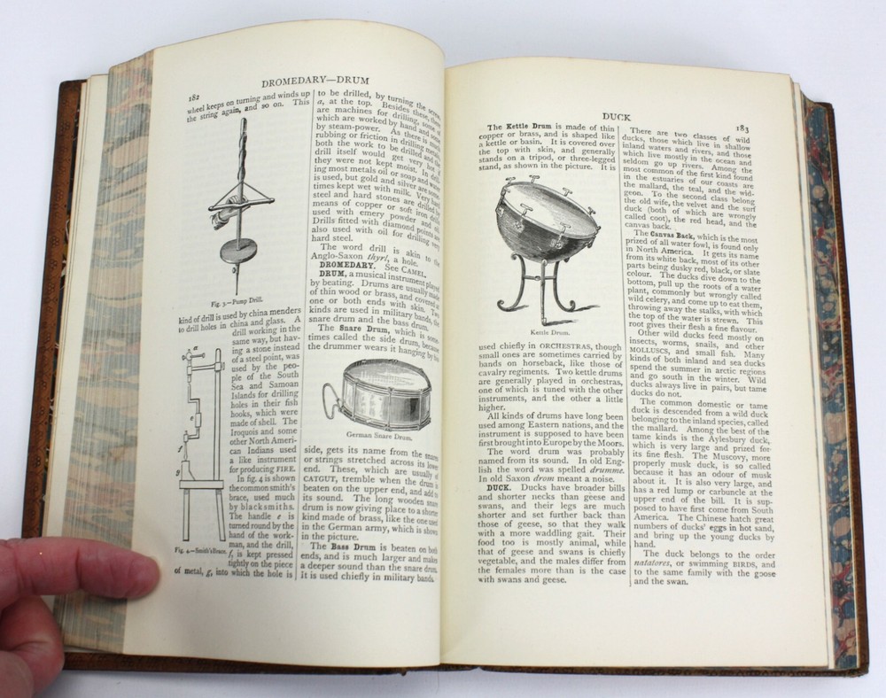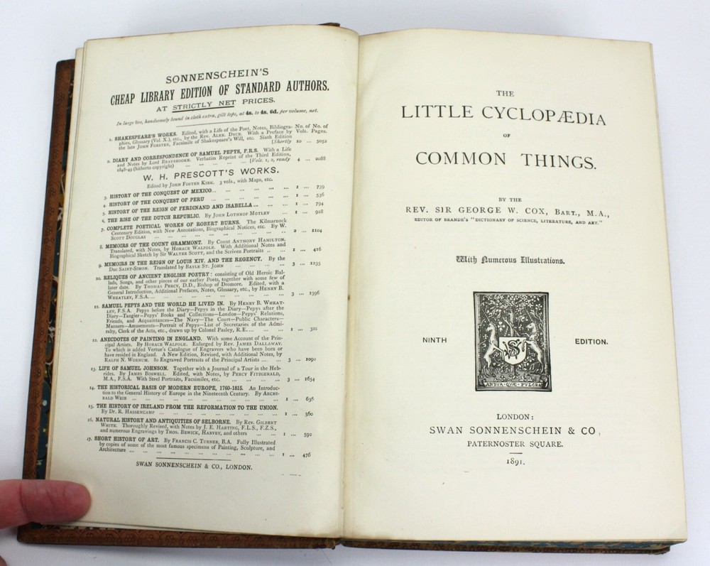 The Little Cyclopaedia of Common Things, by the Rev. Sir George W. Cox, Bart., M. A. Published by Swan Sonnenschein & Co, London. 1891. Ninth edition. Good hardback. Full leather. Cover has significant wear, scratches and is splitting lower right of spine. Marbled endpapers with attractive bookplate of I. C. Metcalfe (and their signature in pencil verso). Marbled edges of text block. Cracked at front hinge although all still bound. Text is lovely and clean throughout. An attractive volume, despite its faults. Not really so 'little' as it weighs over 1kg. Prelims + 660pp. Dimensions: approximately 219mm x 150mm x 40mm. The Little Cyclopaedia of Common Things, by the Rev. Sir George W. Cox, Bart., M. A. Published by Swan Sonnenschein & Co, London. 1891. Ninth edition. Good hardback. Full leather. Cover has significant wear, scratches and is splitting lower right of spine. Marbled endpapers with attractive bookplate of I. C. Metcalfe (and their signature in pencil verso). Marbled edges of text block. Cracked at front hinge although all still bound. Text is lovely and clean throughout. An attractive volume, despite its faults. Not really so 'little' as it weighs over 1kg. Prelims + 660pp. Dimensions: approximately 219mm x 150mm x 40mm.Â