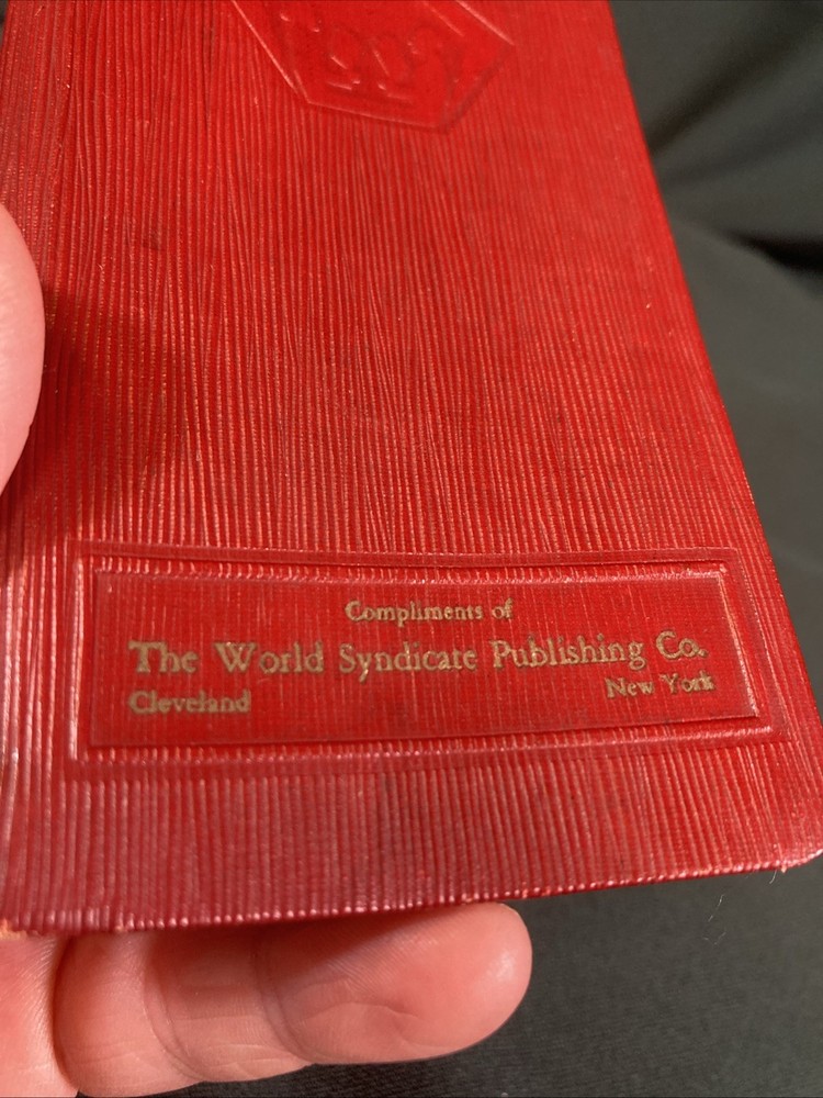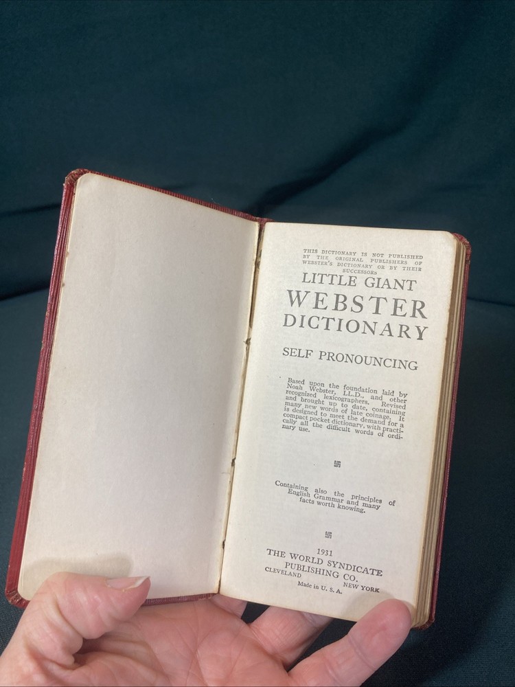 Vintage Little Giant Webster Pocket Dictionary. Published in 1931 by World Syndicate Publishing Co. Includes rules for grammar, spelling, Americanisms, State name meanings, language of flowers and gems, and major city populations as of the 1930 census, just to name a few. None of the pages are missing and are still securely bound. No rips, creases, however the Cover is piling away from its paper and has some edge wear from use and shelf storage. Pages have yellowed some from age, but the texts is all clearly legible. Ships via USPS Media Mail. Please note- the symbols seen on the title page are the classic religious presentation rather than the “hooked cross” that was turned 45 degrees and utilized in world war 2.