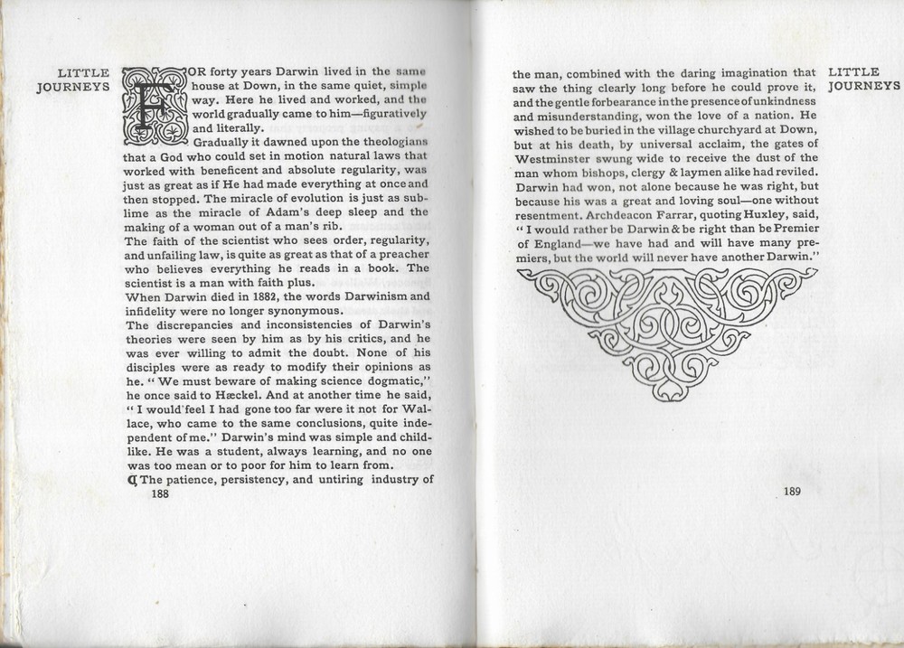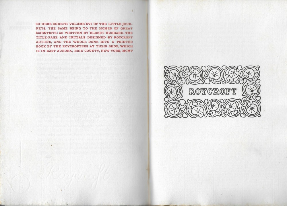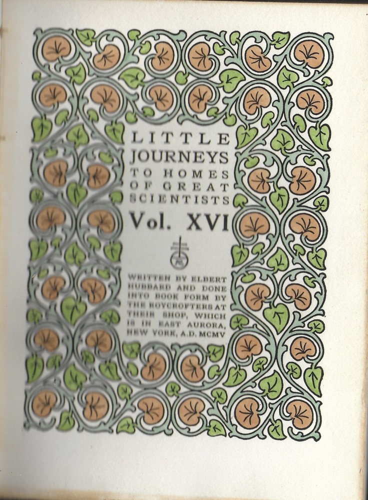Little Journeys to the Homes of Great Scientist, Book 1, Vol. XVI , Roycroft You are buying Little Journeys to the Homes of Great Scientist, Book 1, Vol. XVI by Elbert Hubbard . Roycroft Shop , East Aurora, NY published the book copyright 1905. The interior is in fine condition. The pages are tight and clean. There are no tears or marks. There are no signs of prior ownership. The green suede leather cover is in very good condition. There is considerable fading. The attached bookmark is in good condition. There is fraying at the end. The book is 6” x 8 1/4” tall, and 118 pages. This is a very beautiful book. There is a b & w portrait of each of the scientist with tissue guard. The beautiful color title page, the initial letter at the beginning of each article, and the b & w initial letters were designed and hand colored by the Roycroft artist. Please look at the pictures. The book covers: Copernicus Galileo Sir Issac Newton Humboldt Hesschel Charles Darwin Elbert Hubbard founder of the Roycroft community was influenced by William Morris and in particular his Kelmscott Press. Roycroft Creed: " A belief in working with the head, hand and heart and mixing enough play with the work so that every task is pleasurable and makes for health and happiness ". Please if you need any additional information and photos, eBay message me immediately. Combine Shipping Discount!!!!! Save money when you buy more than one item (lot) from us! Except in rare cases, s & h to a U. S. address via media mail in the same box is $1.25 for each additional book. eBay may automatically send a combine invoice with the wrong s & h. Please wait to pay until you receive my combine invoice with the correct s & h. PLEASE CHECK OUT MY eBAY STORE AND OTHER AUCTIONS!!! 82 202352023