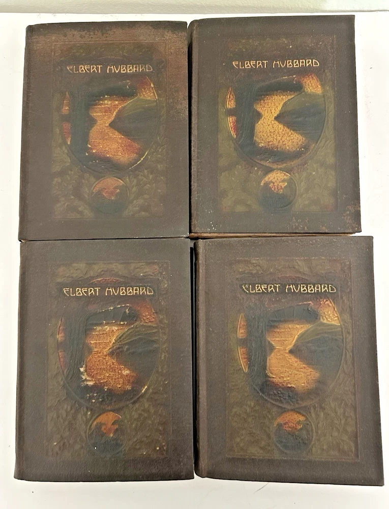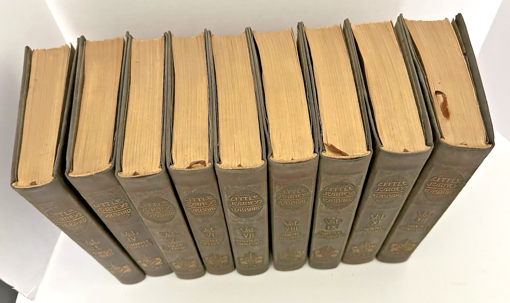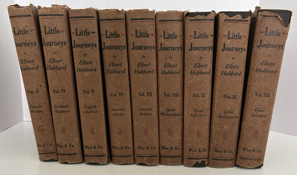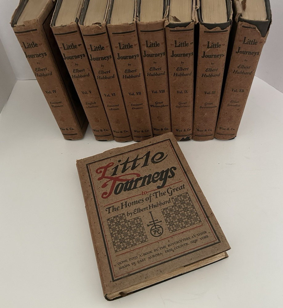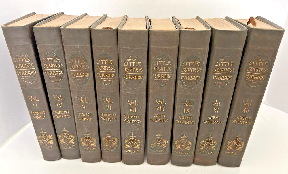 This lot is for nine of the fourteen in the complete set. Each book is a collection of short biographies of famous individuals by Elbert Hubbard, "Little Journeys to the Homes of the Great." This is the Memorial Edition, published posthumously by the Roycrofters and Wm. A. Wise in 1916. It was edited by Fred Bann. Hubbard and his second wife, Alice Moore Hubbard, died aboard the RMS Lusitania when it was sunk by a German submarine off the coast of Ireland on May 7 1915. These nine volumes include a brown paper dust jacket. The covers are brown leatherette with tooled front and spine. Each has an illustrated frontis with guard and plates. Black and white decorations, ribbon marker, rubbed gilt top edge. Included in this lot of nine: Volume 2 - Famous Women Volume 3 - American Statesmen Volume 5 - English Authors Volume 6 - Eminent Artists Volume 7 - Eminent Orators Volume 8 - Great Philosophers Volume 9 - Great Reformers Volume 11 - Great Businessmen Volume 12 - Great Scientists