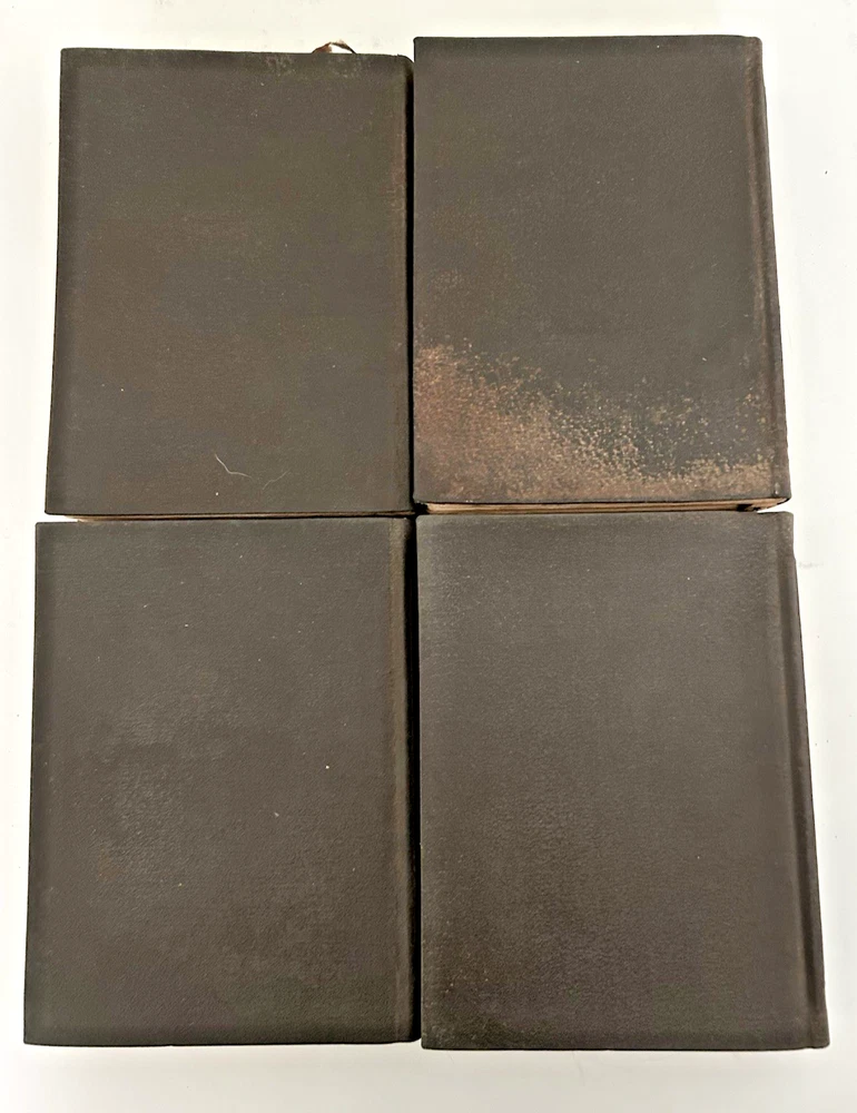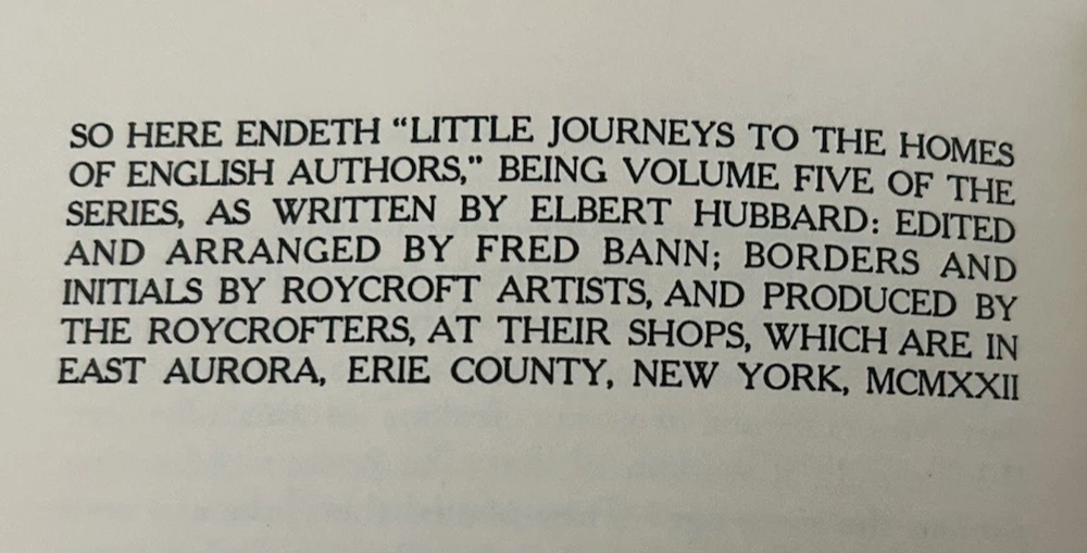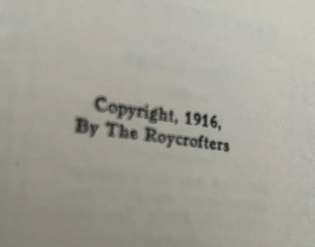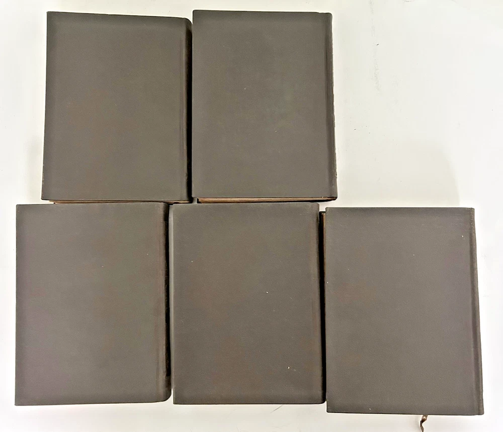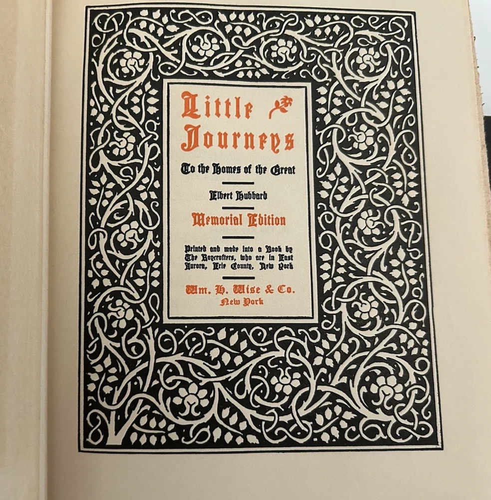 This lot is for nine of the fourteen in the complete set. Each book is a collection of short biographies of famous individuals by Elbert Hubbard, "Little Journeys to the Homes of the Great." This is the Memorial Edition, published posthumously by the Roycrofters and Wm. A. Wise in 1916. It was edited by Fred Bann. Hubbard and his second wife, Alice Moore Hubbard, died aboard the RMS Lusitania when it was sunk by a German submarine off the coast of Ireland on May 7 1915. These nine volumes include a brown paper dust jacket. The covers are brown leatherette with tooled front and spine. Each has an illustrated frontis with guard and plates. Black and white decorations, ribbon marker, rubbed gilt top edge. Included in this lot of nine: Volume 2 - Famous Women Volume 3 - American Statesmen Volume 5 - English Authors Volume 6 - Eminent Artists Volume 7 - Eminent Orators Volume 8 - Great Philosophers Volume 9 - Great Reformers Volume 11 - Great Businessmen Volume 12 - Great Scientists