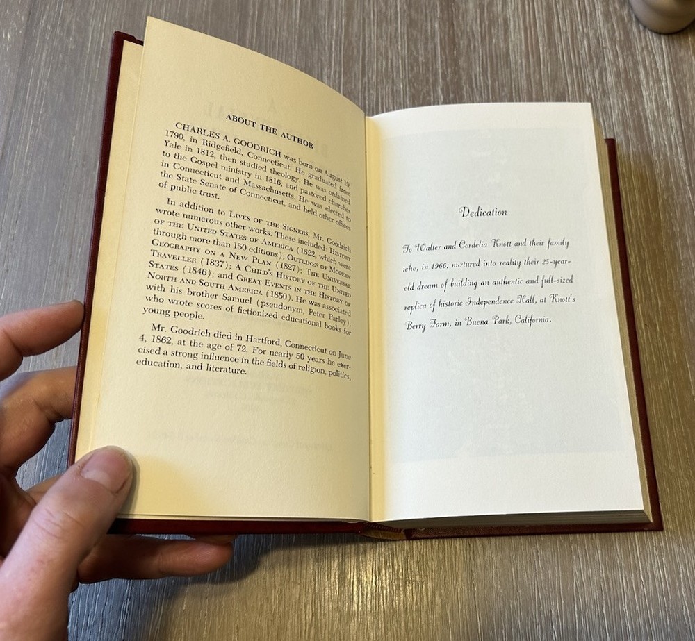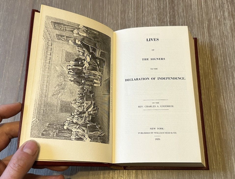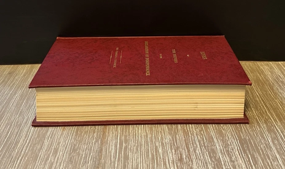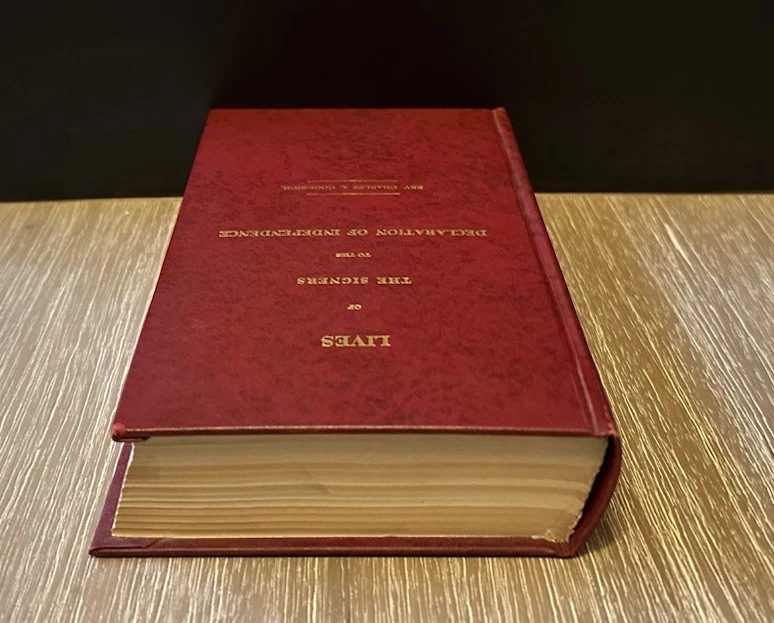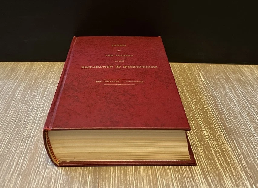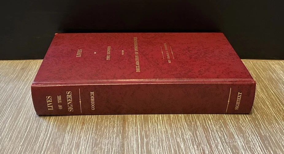 The product is a hardcover book written by Rev. Charles A. Goodrich and published by Sightext Publications in 1969. The book is a facsimile edition and is bound in leather. It is a biography and autobiography of the signers to the Declaration of Independence. The book is in English and was printed in El Segundo, California, United States. B46 3.9