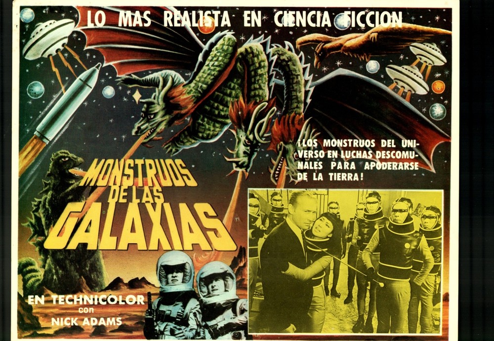 Godzilla vs. Gigan 12.5"x17" Lobby Card Hiroshi Ishikawa Yuriko Hishimi Mexican -This is a lobby card approximately 12.5"x17". -Original used theater lobby card from Mexico. -Superior colorful imagery with graphic insert -Stars Hiroshi Ishikawa and Yuriko Hishimi. -Couple of pin holes along edges and inside card. Writing on the back. -Great promotional item, suitable for framing. Grade: G/VG SKU: FF-24-053
