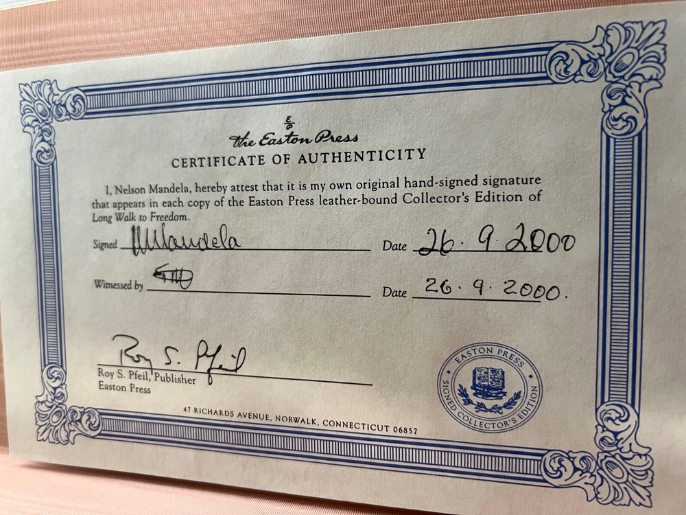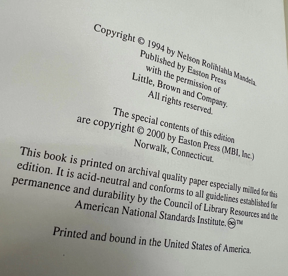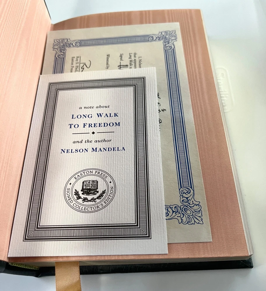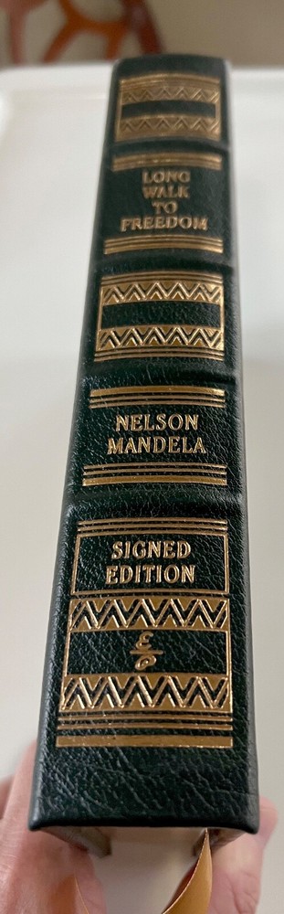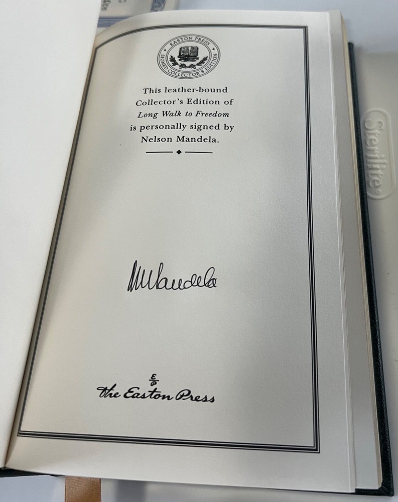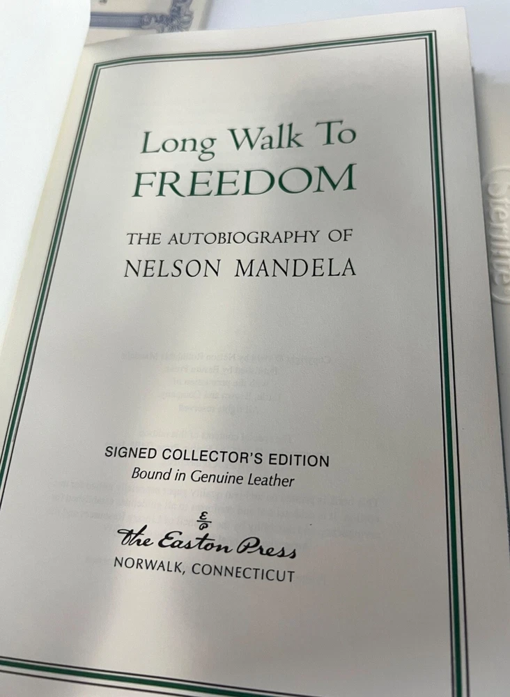 The product is a collector's edition book titled "Long Walk to Freedom" by Nelson Mandela, published by Easton Press in Norwalk, Connecticut in 2000. It is a biography focusing on Mandela's resistance to apartheid in South Africa. This special copy is signed by Nelson Mandela himself, making it a unique and valuable piece for collectors interested in historical and political literature. The book is bound in leather and is an original printing in English, making it a sought-after item for those intrigued by Mandela's life and activism.