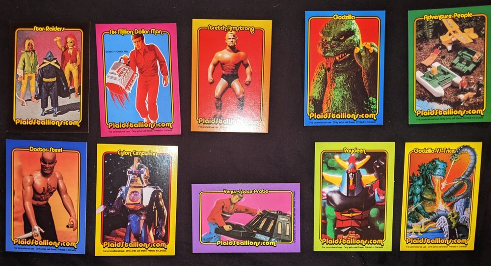 Lot Of Promotional Trading Cards Vintage Toys Godzilla Shogun Warriors Tomland, Steve Austin, released by plaid stallions Thank you for your interest in Me-Go-Media We have many more vintage toys, comics and collectibles available on eBay. Check out my other items! Please contact me before purchase if you have any questions. Questions will be addressed ASAP. If an offer is accepted, item will be held for 48 hours for payment. There is generally a handling time of 5 business days (excludes weekends and holidays) following receipt of payment. Please contact me BEFORE purchase if you need quick shipping as I'm not always proximate to my inventory. Items are sold as shown. Vintage items (especially loose toys, sports cards, and comics) should be considered used or played with, may not be high grade or appropriate for professional grading. Items only include accessories shown in photos. Please view photos and email with any questions before purchase. I do list any accessories I am aware of being missing or reproduced, but please feel free to ask. Signed comics sold without certificates are only offered when signed in my presence by the creator at a professionally sponsored show (Typically C2E2 and Wizard World). I don't personally grade comics. If not professionally graded, please view photos, assume one grade down. Insurance available at buyer's expense. Not all items are available for international purchase. Please contact me if you have any questions before purchase! No refunds offered. Thank you so much for checking out my s