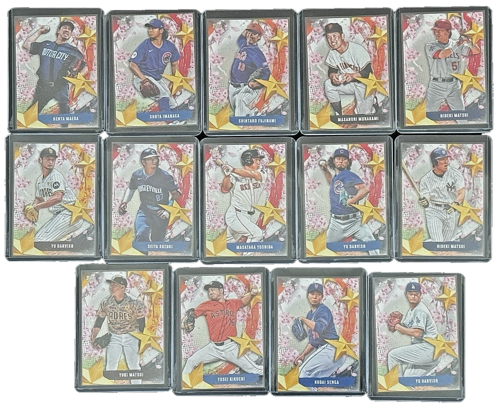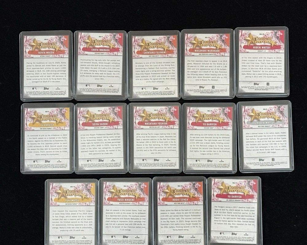 The product is a lot of 14 2025 Topps Series One Tokyo Series baseball trading cards featuring Japanese stars such as Hideki Matsui, Yu Darvish, and Shota Imanaga. Manufactured by Topps, these cards are part of the MLB World Tour event/tournament and are considered inserts in the set. Each card likely showcases these players in unique and special ways, making them a valuable addition to any sports trading card collection. *** While we do our best to catch any issues, some cards from large case breaks may not have been fully inspected. Cards are listed as used – cards may show various signs of handling or wear that don’t significantly impact the visual appeal of the image. This can include surface marks, edge or corner imperfections, and other minor flaws. Please review the photos for centering and overall condition to form your own opinion. Any visible marks are usually on the top loader, not the card itself. Our photos are high resolution and we recommend using the zoom feature on ebay for better inspection of the card for sale. However, If you'd like a closer look, feel free to message us — we're happy to provide photos outside the top loader before purchase. We do not guarantee that any card will receive a specific grade if submitted for professional grading, nor do we offer predictions or assessments regarding potential grades. MST Cards Premium Shipping Guarantee Every card is individually penny sleeved and top-loaded, unless otherwise noted on a specific listing. Shipping & Handling Cards under $20 ship via eBay Standard Envelope (when eligible) Cards over $20 or thicker cards ship via USPS Ground Advantage flat rate $5.75 Buying multiple cards? We combine shipping and cap costs to save you money Refunds will be given for lost or damaged items NO SOONER than 15 days from the shipping date. This is due to ebay's refund policy for seller's. We appreciate your cooperation on this. Why Buy from MST Cards? Trusted by collectors of Topps, Bowman, Panini, and more Thousands of MLB, NFL, NBA, and prospect cards sold 100% positive feedback and lightning-fast shipping Top-loaded. Protected. Trusted. That's the MST Cards promise.