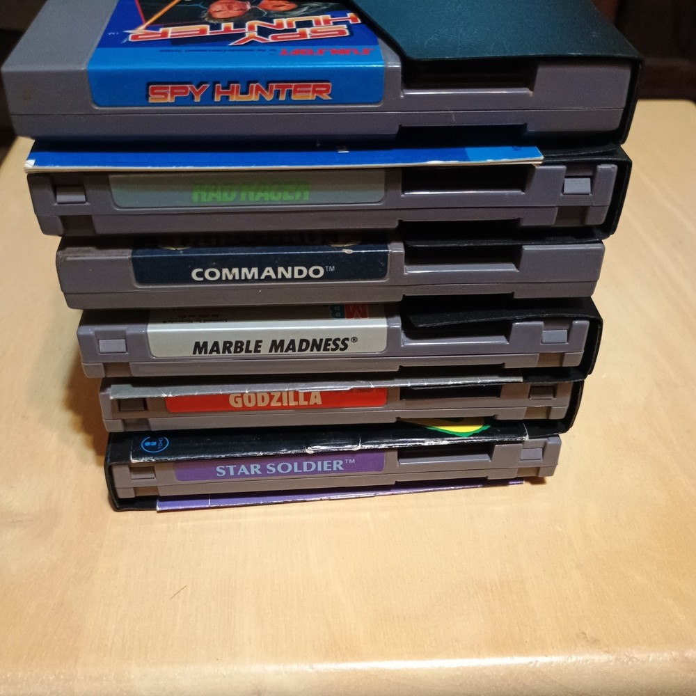 this is for 6 untested nes games estate sale purchase. this product may contain odor from previous storage/use. please be aware of this prior to purchase. some games come with booklet/case so please read and see pictures for full details star soldier with booklet Godzilla monster of monsters with booklet commando rad racer spy Hunter with booklet marble madness with booklet FREE SHIPPING