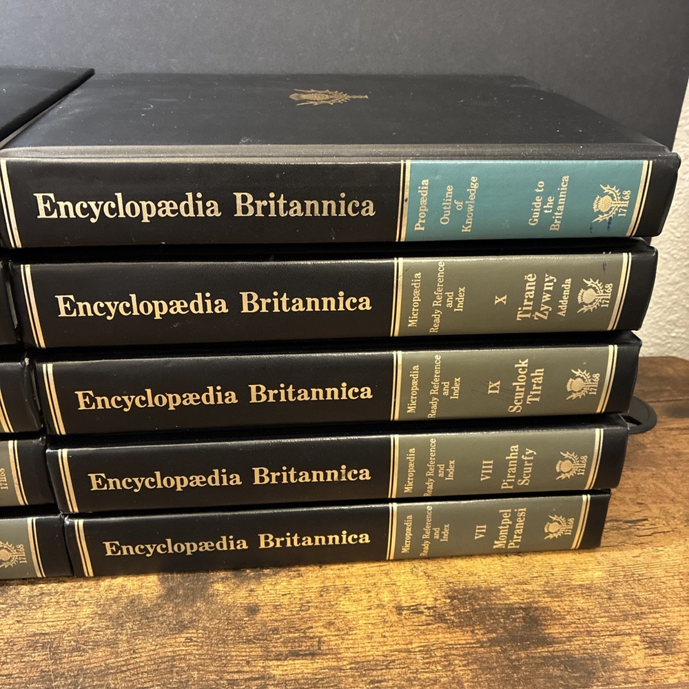 Lot of 10 Encyclopedia Britannica Micropedias & Propedia 15th Edition 1984 Set Leather Bound HC Very good overall condition for this large bundle set. Missing 1 Micropedia Volume 3 (III). Pages clean and intact. Shipped out within 1 business day.