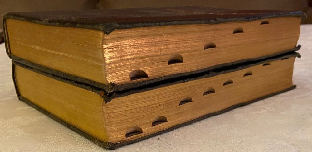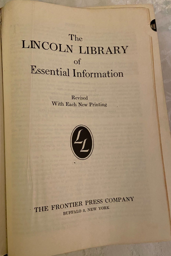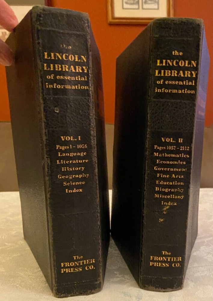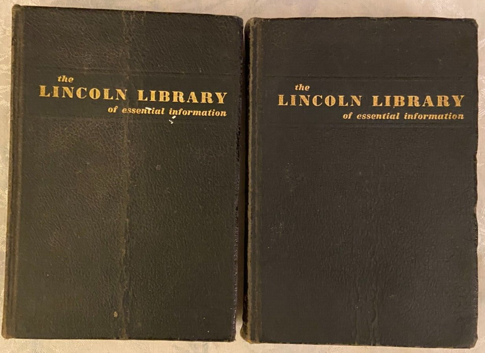 This is a vintage lot of 2 leather look, 1959 editions of The Lincoln Library of Essential Information, Vol 1 & 2. The book edges are scuffed & worn. Volume 1 has a crease on the front cover. The pages are all attached, & the spines are tight. The pages have minor tanning. Please see pictures. 1. The Lincoln Library, Vol. 1 2. The Lincoln Library, Vol. 2