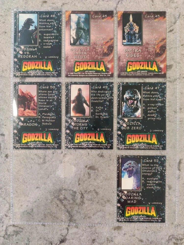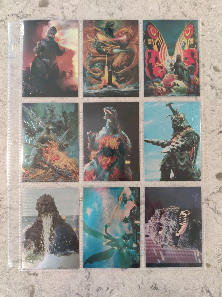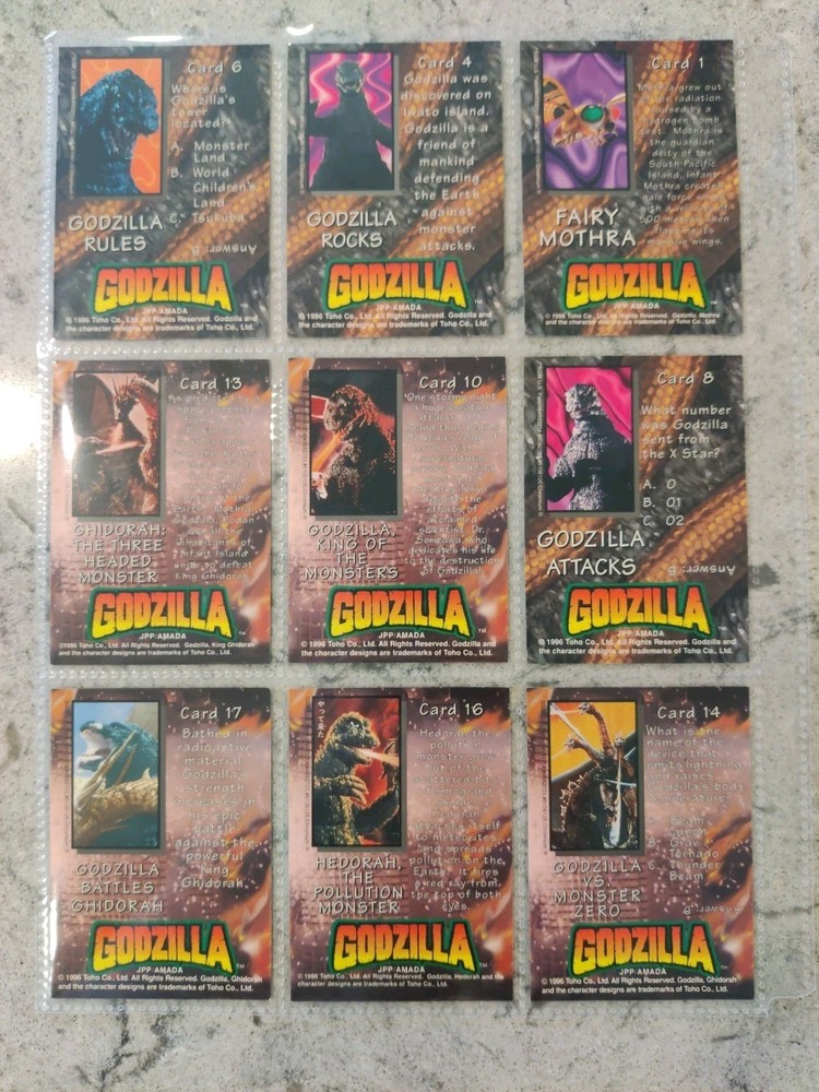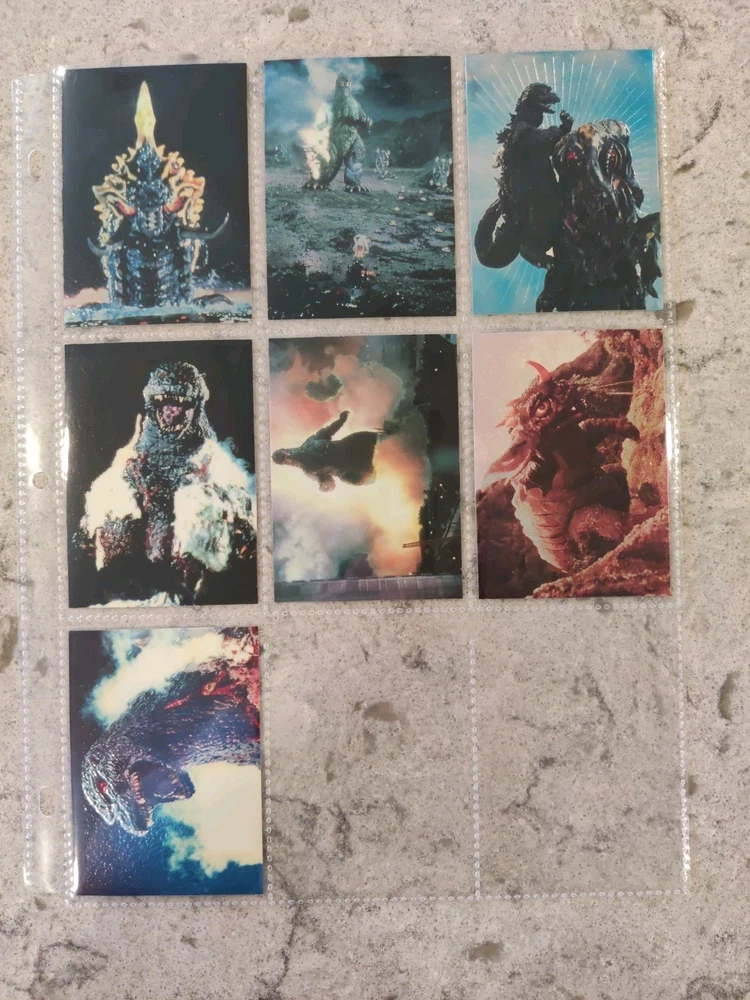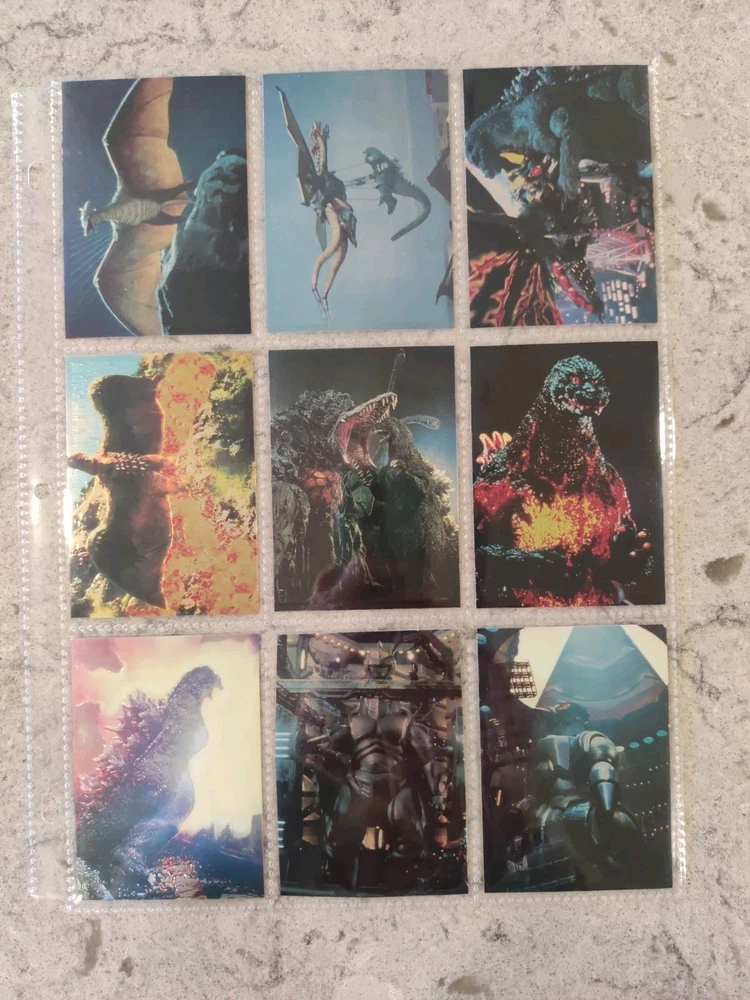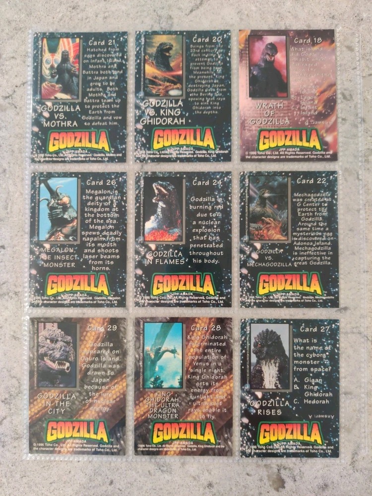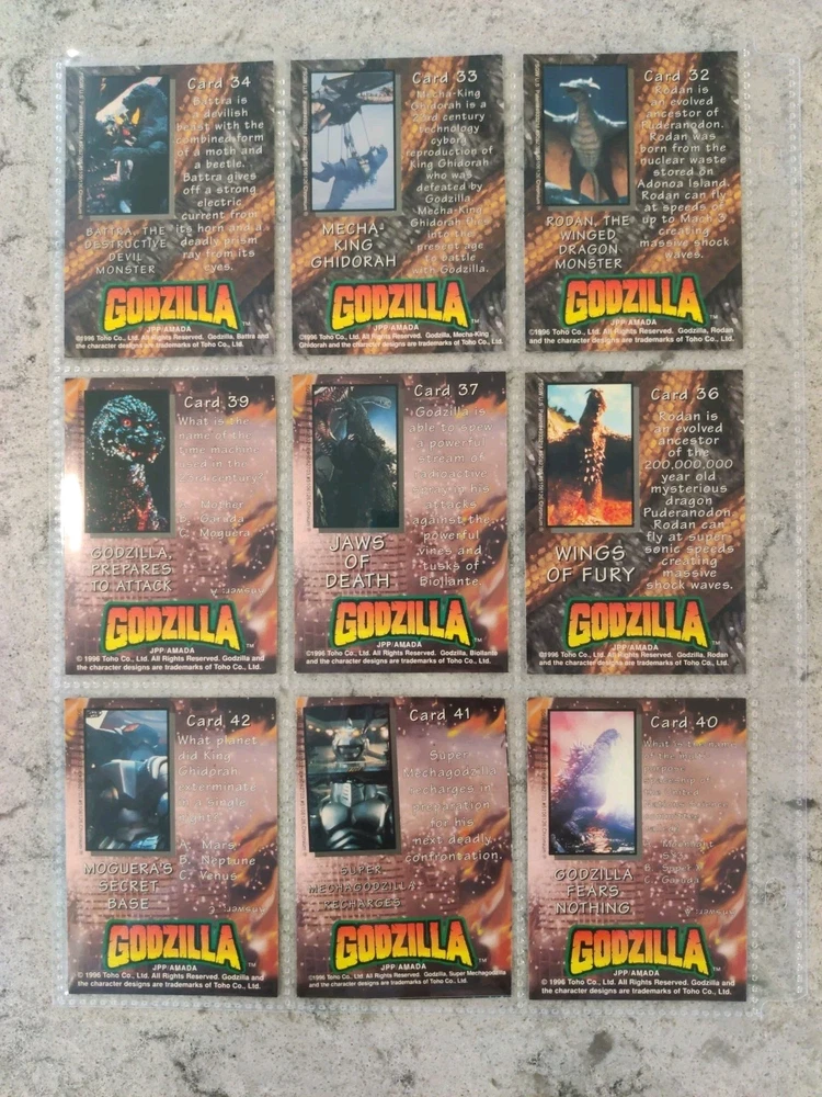 Lot of 34 vintage 1996 Godzilla chromium trading cards from JPP Amada. Cards are all in quite good condition. Nice sharp corners, minimal wear. See photos. And note that the color looks a little washed out in the photos, but they are actually very brilliant. There is just a lot of daylight in my kitchen. Will be shipped in a reinforced padded envelope.