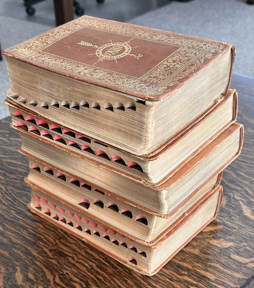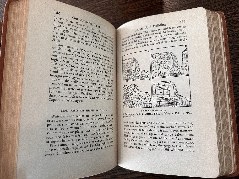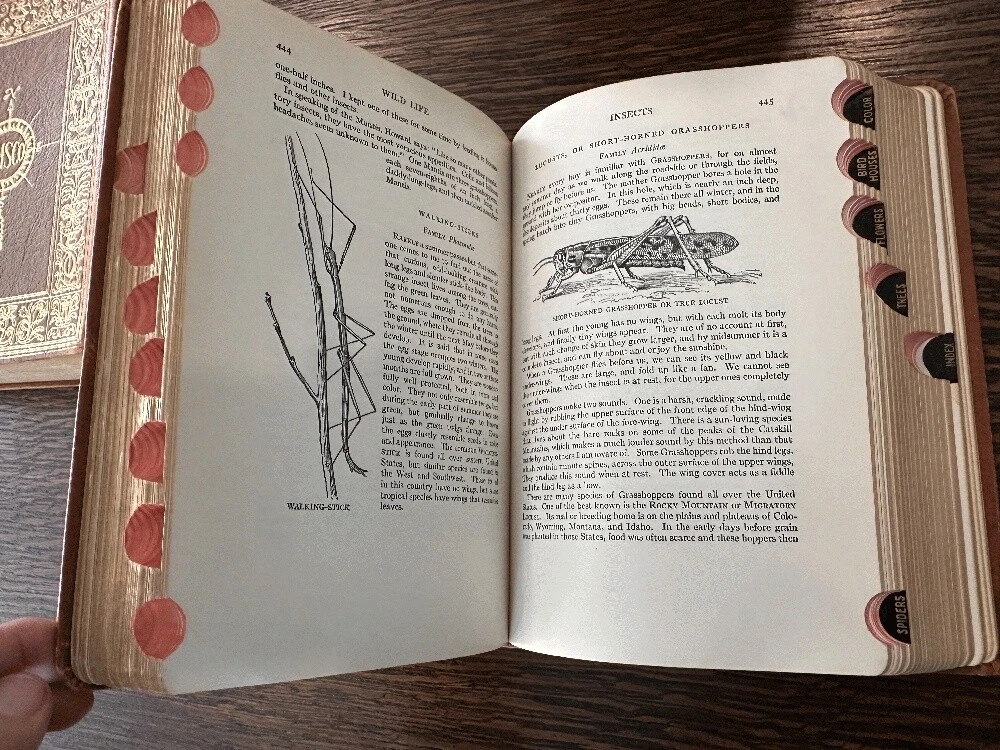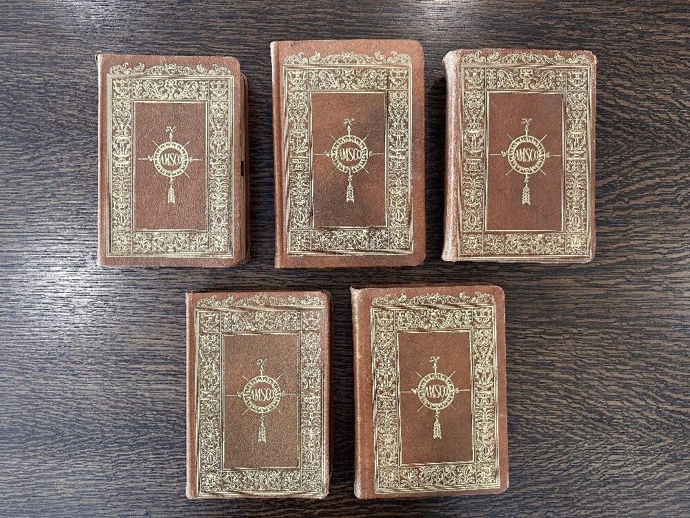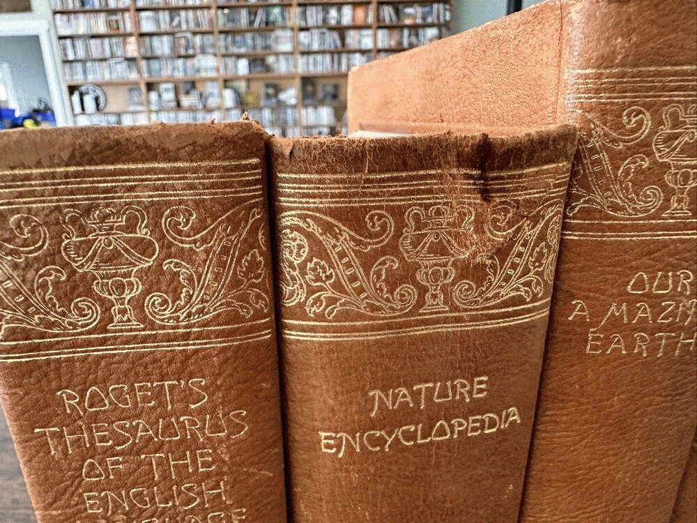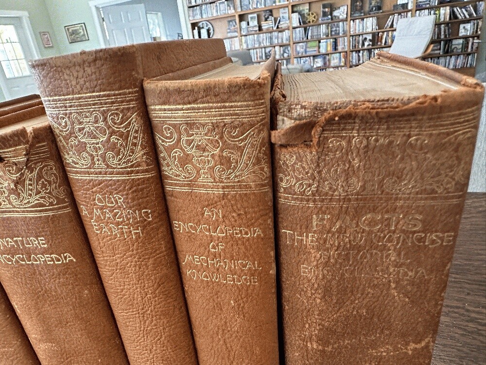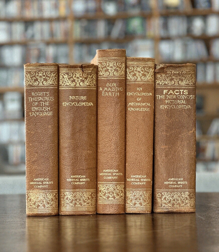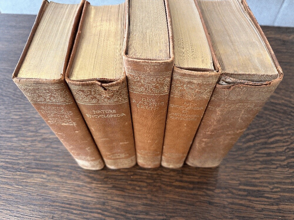 Lot of 5 antique leather AMSCO Nature~Encyclopedia~Facts~Mechanical~Earth~Thesaurus Author: Various Publisher: Doubleday Doran; Halcyon House; Garden City Publishing; American Mineral Spirits Company Publication Date: 1941 Qty Available: 1 Condition: Collectible: Acceptable Sku: 052163 Notes: SCACE set of Full leather books presented by AMSCO (American Mineral Spirits Company) 1941; All hinges are intact and binding sturdy and secure. The spine of two volumes is torn as shown. The volume titled "FACTS The New Concise Pictorial Encyclopedia" has the cover loosening from the binding and a chipped spine. Nature Encyclopedia has a chipped/torn upper spine edge. The other three are in better condition: Our Amazing Earth; Roget's Thesaurus; and An Encyclopedia of Mechanical Knowledge. No scent to any.. The tallest volume is 9.25". Your purchase benefits literacy and summer reading programs in Cincinnati and Hamilton County, Ohio. We ship every business day. All books ship in cardboard bookfolds with delivery confirmation. Sets or unusually heavy items ship in a box. Please contact us for more information.