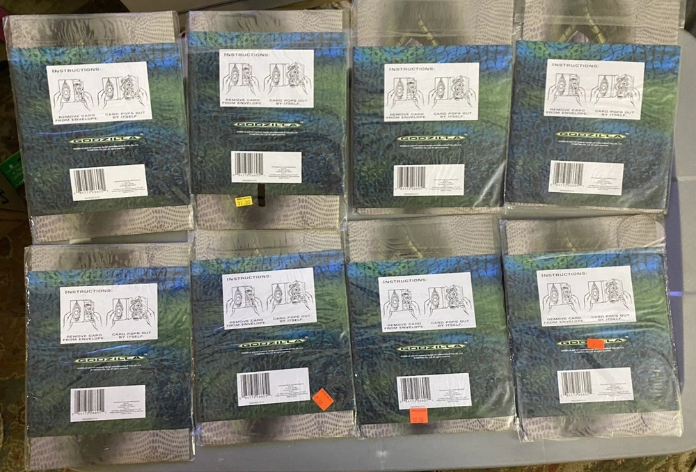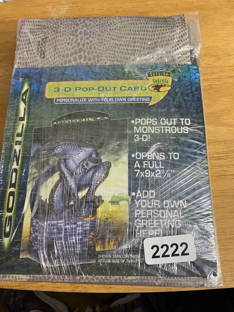 Lot of 8 GGI Godzilla 3D Pop-Out Greeting Card 1998 NEW SEALED 7 X 9 X 2 5/8" Unleash a touch of nostalgia with the G.G.I. Godzilla 3D Pop-Out Greeting Card, a perfect choice for fans of the classic monster. This collectible card, dating back to 1998, features the iconic Godzilla design that pops out in a thrilling 3D format, providing an unexpected and playful twist to your personalized message. The card, measuring 7 x 9 x 2 5/8 inches, includes an envelope for easy sending and makes for a versatile recipient, suitable for a personal touch on any occasion. Genuine Godzilla product line, this multicolored card is a unique blend of pop culture and sentiment, ready to be personalized with your own greeting. •Condition: New Sealed Unopened •Size: 7 X 9 X 2 5/8" •Color: Multicolor •Features: 3D Pop-Out Greeting Card - Add your own Personal Greeting The item is in good condition from a non-smoking home. - Please note: Some of the packages have old price tags. Some of the corners may be creased from storage. Office - 2222 Wicker Basket