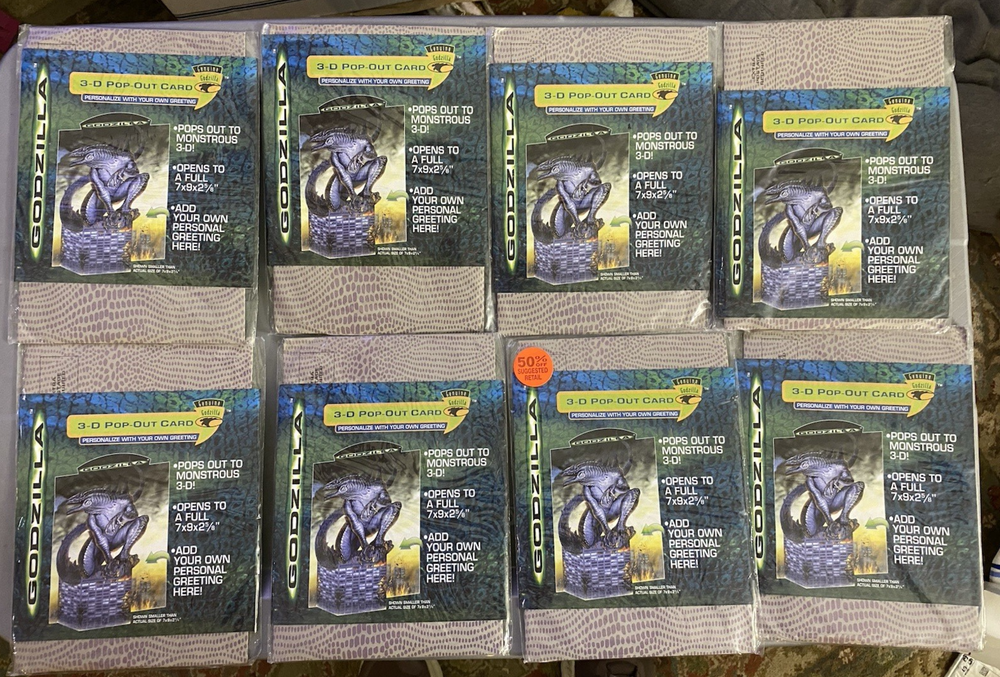 Lot of 8 G.G.I. Godzilla 3D Pop-Out Greeting Card 1998 NEW SEALED 7 X 9 X 2 5/8" Unleash a touch of nostalgia with the G.G.I. Godzilla 3D Pop-Out Greeting Card, a perfect choice for fans of the classic monster. This collectible card, dating back to 1998, features the iconic Godzilla design that pops out in a thrilling 3D format, providing an unexpected and playful twist to your personalized message. The card, measuring 7 x 9 x 2 5/8 inches, includes an envelope for easy sending and makes for a versatile recipient, suitable for a personal touch on any occasion. Genuine Godzilla product line, this multicolored card is a unique blend of pop culture and sentiment, ready to be personalized with your own greeting. •Condition: New Sealed Unopened •Size: 7 X 9 X 2 5/8" •Color: Multicolor •Features: 3D Pop-Out Greeting Card - Add your own Personal Greeting The item is in good condition from a non-smoking home. - Please note: Some of the packages have old price tags. Some of the corners may be creased from storage. Office - 2219 Wicker Basket