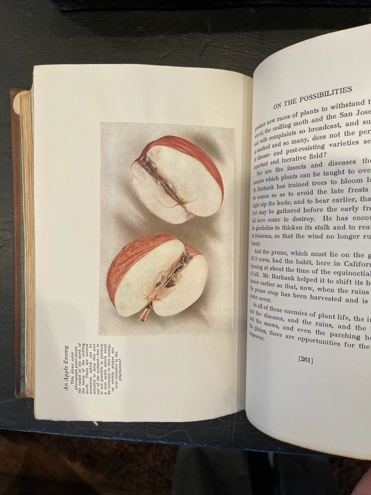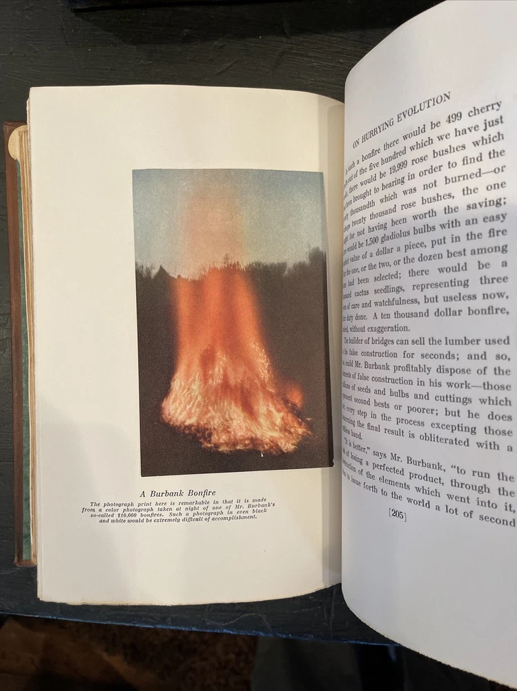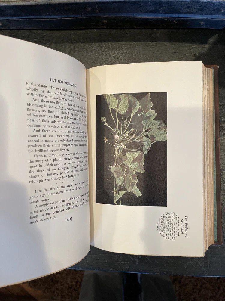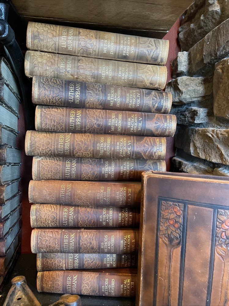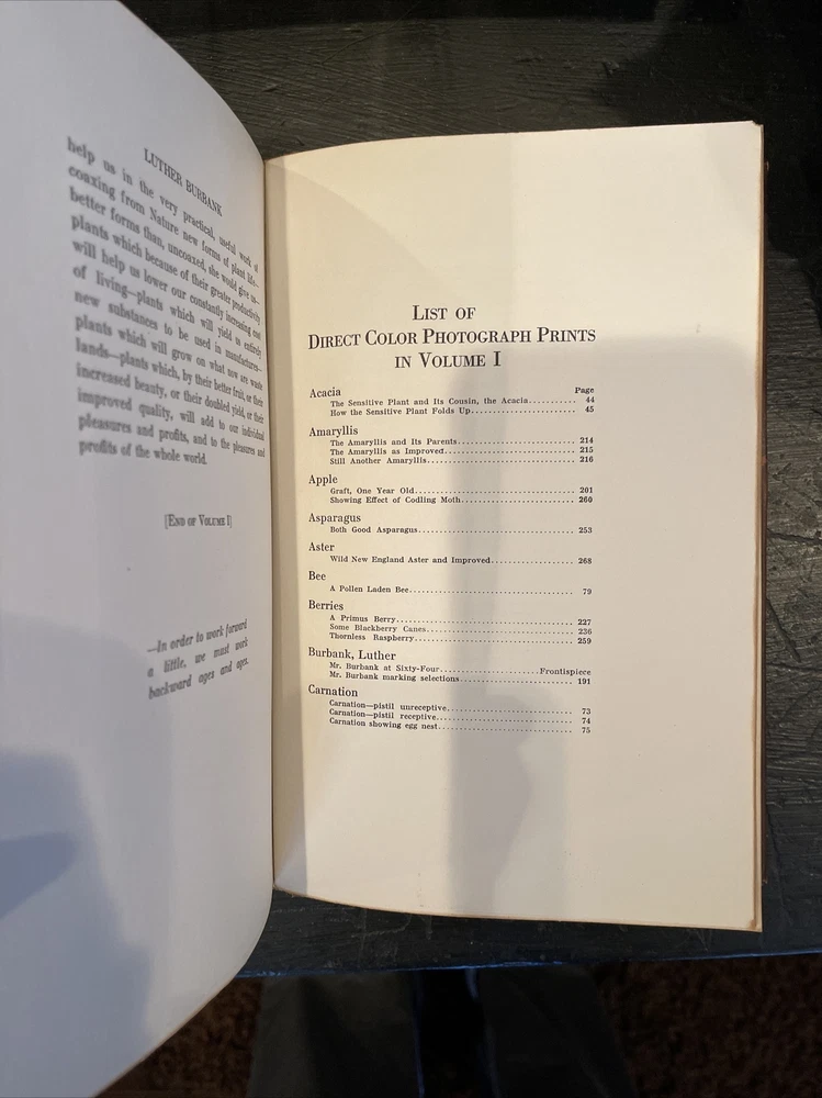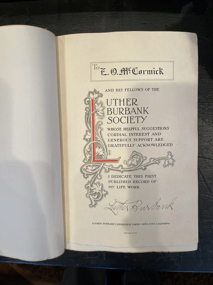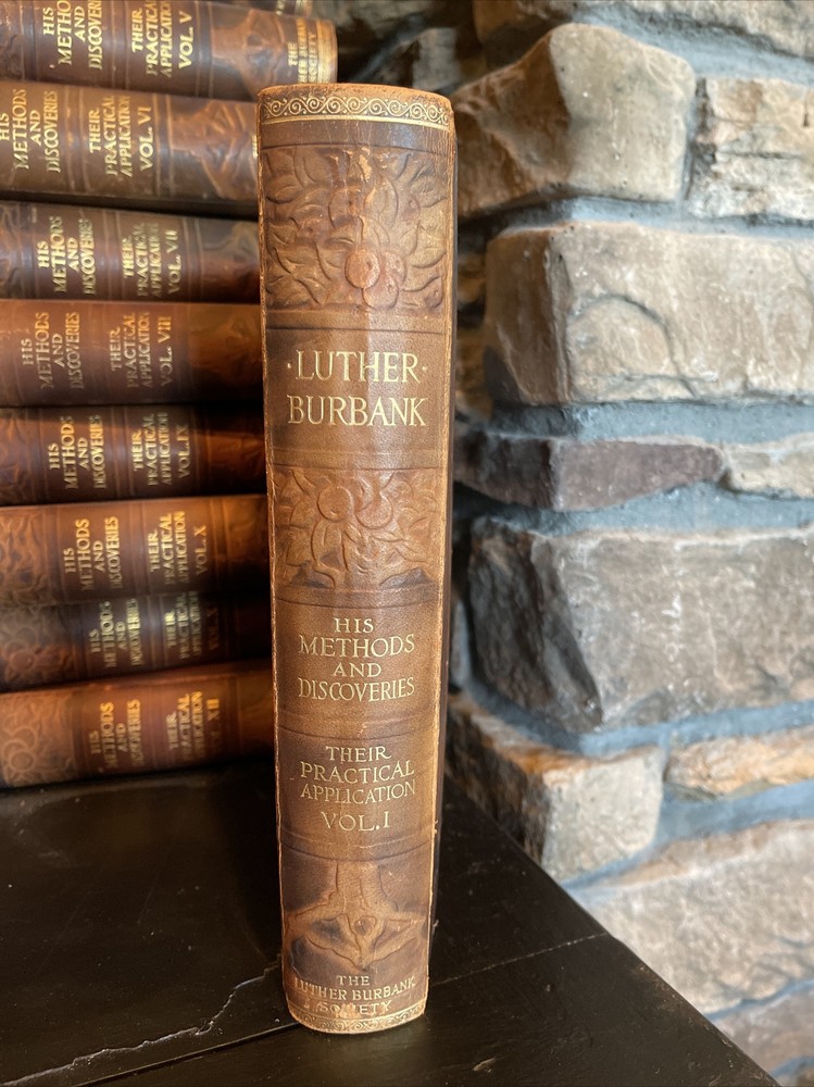 Luther Burbank His Methods and Discoveries, Autographed, 1st Ed, 1914 *RARE*. Prepared from his original field notes covering more than 100,000 experiments made during forty years devoted to plant improvement with the assistance of The Luther Burbank Society. Illustrated with direct color photograph prints produced by a new process devised and perfected for use in these volumes. COMPLETE 12 Volume Set, Autographed. E.O. McCormick inscribed in gold-gilt. Mr. McCormick was the V.P. of Southern Pacific Railway in San Francisco, CA. Beautifully embossed leather covers and spine. Cardstock pages, dedication page by Tiffany & Co. Shipped with USPS Media Mail.