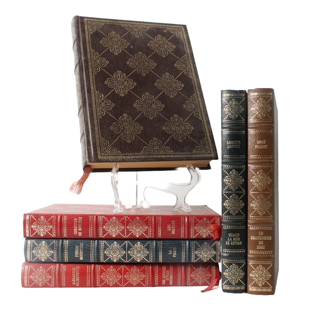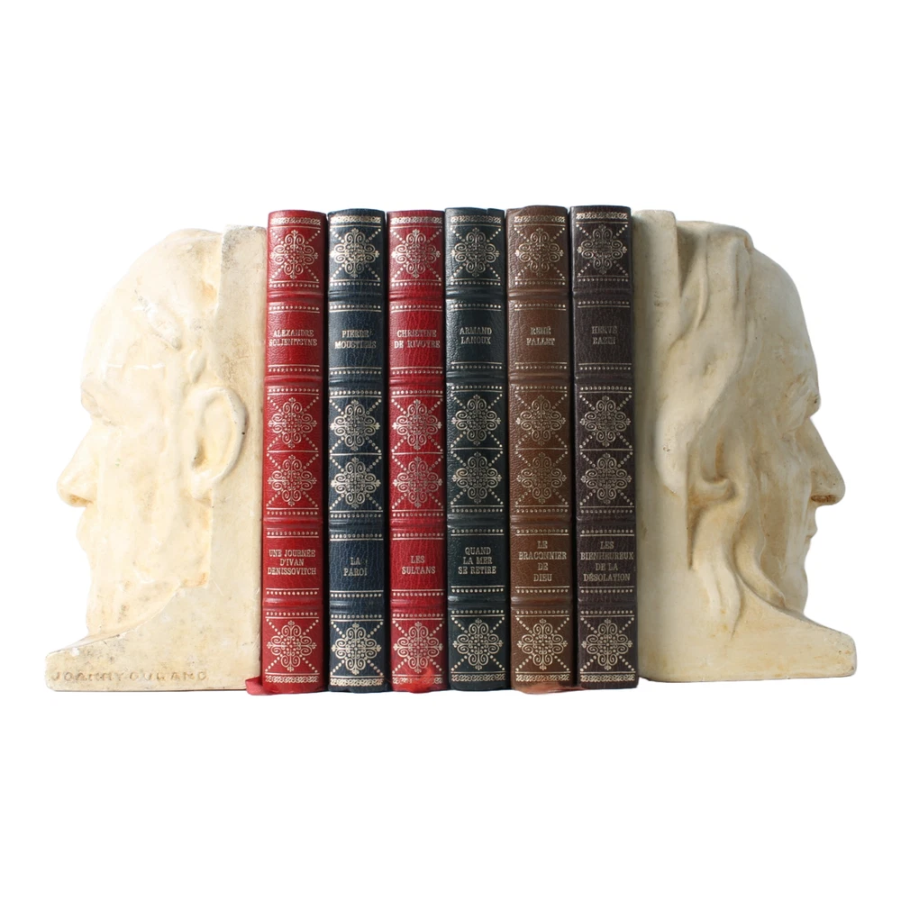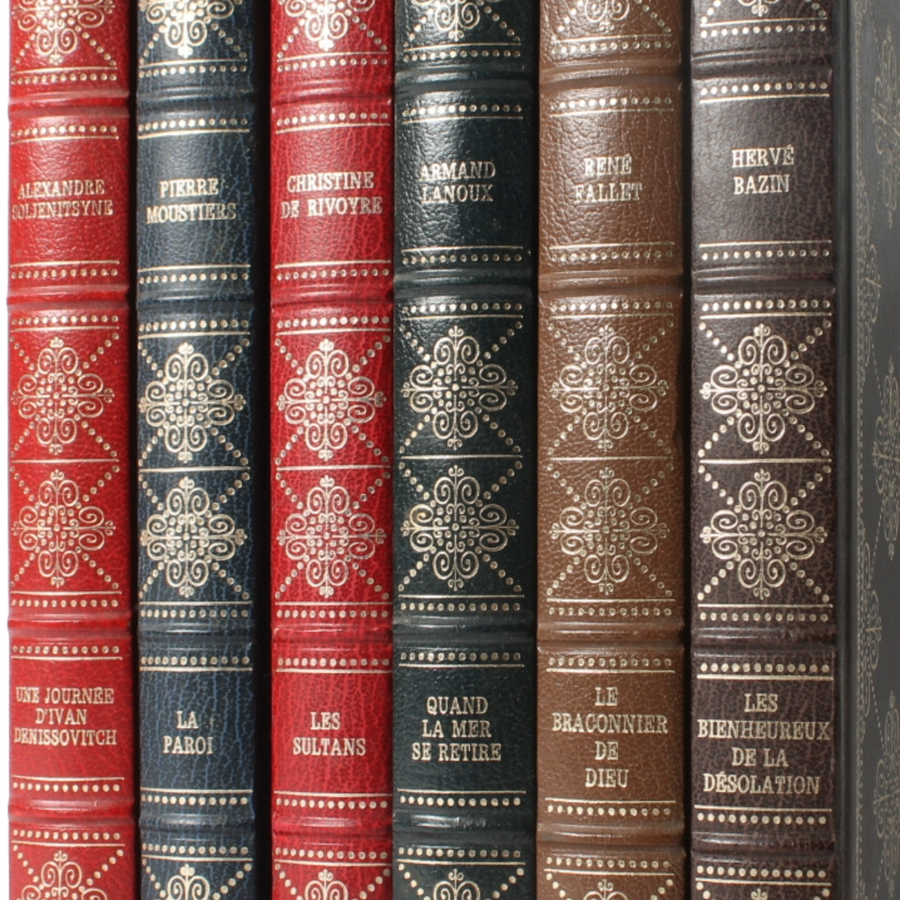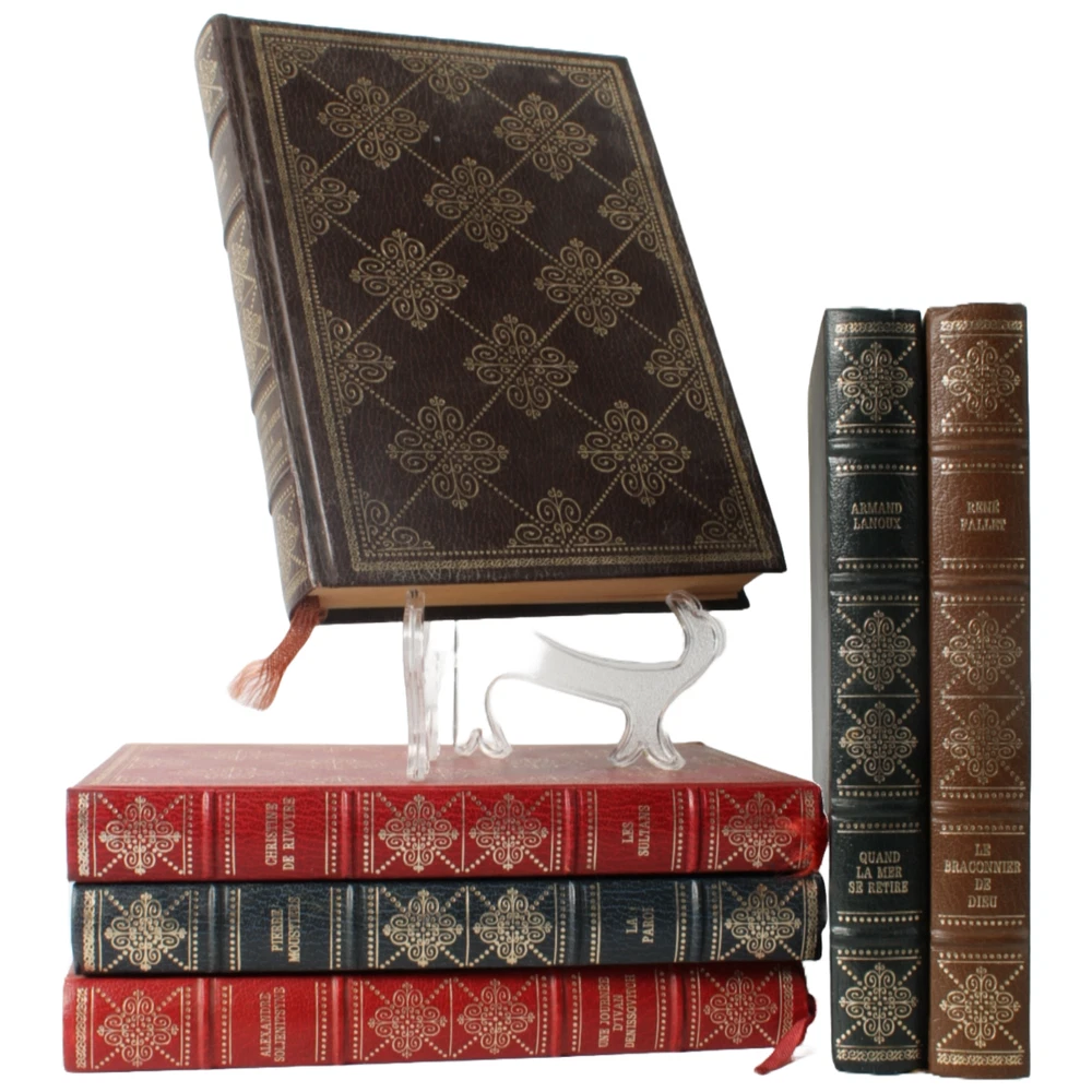 This beautiful book collection consists of literary masterpieces bound in luxurious faux leather with elegant gold details. The set includes works from renowned authors like Alexander Solzhenitsyn, Pierre Moustiers, Christine de Rivoyre, Armand Lanoux, René Fallet, and Hervé Bazin. Where does it come from? The books are likely published by esteemed French publishers specializing in deluxe editions, such as Éditions Rencontre, Gallimard, or Le Club Français du Livre. These publishers are known for their high-quality finishes and attention to detail. Overall condition of the item: The books are in excellent vintage condition, with minimal signs of wear. The gold lettering on the spines and the faux leather are well-preserved, maintaining the set's elegant appearance. Is it handmade or authentic? The books are meticulously crafted, showcasing a high level of craftsmanship typical of luxury editions from the second half of the 20th century. How old is it? These books likely date back to the latter half of the 20th century, which is evident in their binding style and choice of literary works. What was it used for? Ideal for both literature enthusiasts and collectors, these books serve as a striking addition to any collection or as a decorative piece in a classic library. Dimensions: The books have a standard size, measuring approximately 22 cm (8.66 inches) in height and 14 cm (5.51 inches) in width, giving them a refined and uniform look on any bookshelf. Summary of the Books: Alexander Solzhenitsyn - Une Journée d'Ivan Denissovitch : A powerful tale of life in a Soviet labor camp. Pierre Moustiers - La Paroi : Exploration of human relationships and challenges. Christine de Rivoyre - Les Sultans : Complex family dynamics and intrigue. Armand Lanoux - Quand la Mer se Retire : Story of loss and rebuilding after a natural disaster. René Fallet - Le Braconnier de Dieu : Humorous and satirical tale of freedom. Hervé Bazin - Les Bienheureux de la Désolation : Themes of struggle against despair and the search for meaning. Additional Notes: The books are sold as a complete set. The bookends shown in the pictures are not included but are available for purchase separately in our shop. About House of History: At House of History, we are passionate about discovering and curating unique historical items like this book collection. We believe that tangible pieces of history bring the past to life, and our selection is based on craftsmanship, historical significance, and character. Pricing and Shipping: At House of History, our prices always include shipping costs. We ship all orders with tracking for your peace of mind. Orders are dispatched within 1 to 2 business days. Items valued over €200 are always insured during shipping. We take great care to pack our items professionally, and we have extensive experience with international shipping. SEO Tags : luxury book collection, French literature, faux leather books, vintage books, Alexander Solzhenitsyn, Pierre Moustiers, Christine de Rivoyre, Armand Lanoux, René Fallet, Hervé Bazin, collectible books, decorative books, classic literature Materials : faux leather, paper, gold foil, adhesive, ink, cotton bookmark