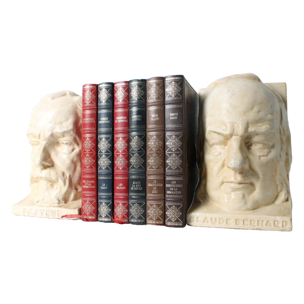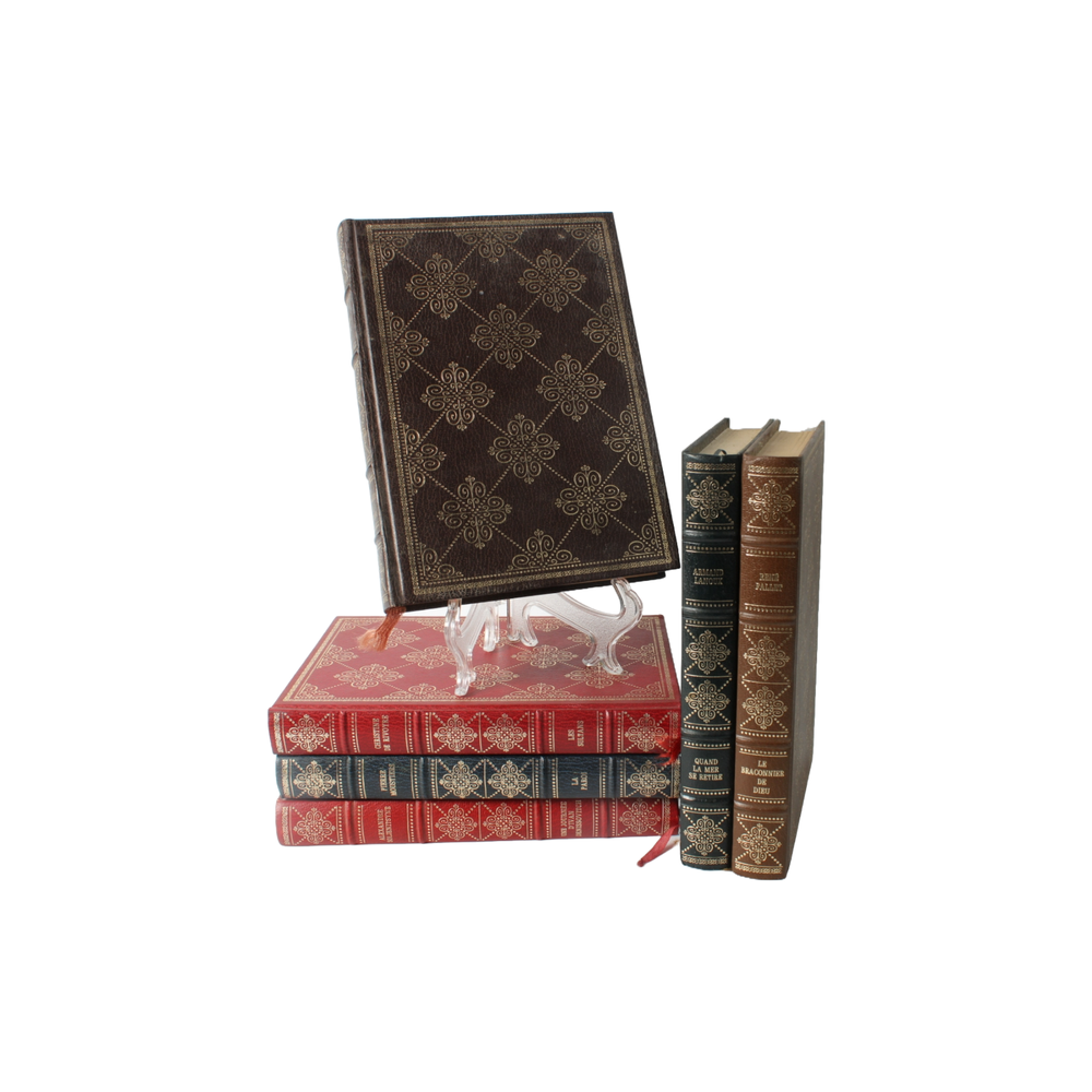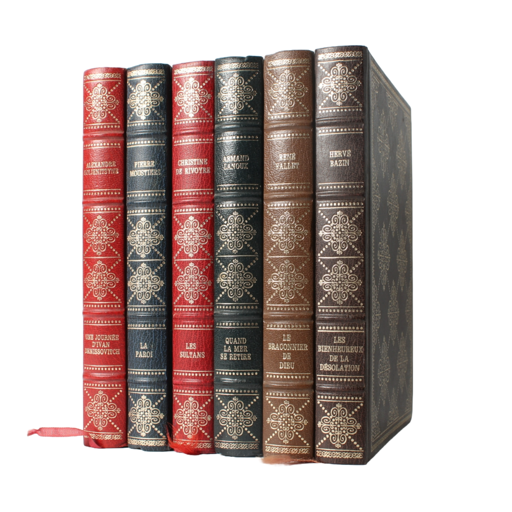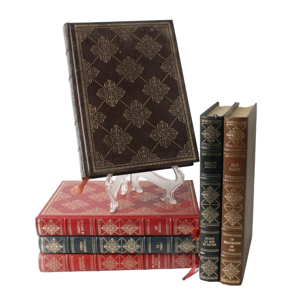 This beautiful book collection consists of literary masterpieces bound in luxurious faux leather with elegant gold details. The set includes works from renowned authors like Alexander Solzhenitsyn, Pierre Moustiers, Christine de Rivoyre, Armand Lanoux, René Fallet, and Hervé Bazin. Where does it come from? The books are likely published by esteemed French publishers specializing in deluxe editions, such as Éditions Rencontre, Gallimard, or Le Club Français du Livre. These publishers are known for their high-quality finishes and attention to detail. Overall condition of the item: The books are in excellent vintage condition, with minimal signs of wear. The gold lettering on the spines and the faux leather are well-preserved, maintaining the set's elegant appearance. Is it handmade or authentic? The books are meticulously crafted, showcasing a high level of craftsmanship typical of luxury editions from the second half of the 20th century. How old is it? These books likely date back to the latter half of the 20th century, which is evident in their binding style and choice of literary works. What was it used for? Ideal for both literature enthusiasts and collectors, these books serve as a striking addition to any collection or as a decorative piece in a classic library. Dimensions: The books have a standard size, measuring approximately 22 cm (8.66 inches) in height and 14 cm (5.51 inches) in width, giving them a refined and uniform look on any bookshelf. Summary of the Books: Alexander Solzhenitsyn - Une Journée d'Ivan Denissovitch : A powerful tale of life in a Soviet labor camp. Pierre Moustiers - La Paroi : Exploration of human relationships and challenges. Christine de Rivoyre - Les Sultans : Complex family dynamics and intrigue. Armand Lanoux - Quand la Mer se Retire : Story of loss and rebuilding after a natural disaster. René Fallet - Le Braconnier de Dieu : Humorous and satirical tale of freedom. Hervé Bazin - Les Bienheureux de la Désolation : Themes of struggle against despair and the search for meaning. Additional Notes: The books are sold as a complete set. The bookends shown in the pictures are not included but are available for purchase separately in our shop. About House of History: At House of History, we are passionate about discovering and curating unique historical items like this book collection. We believe that tangible pieces of history bring the past to life, and our selection is based on craftsmanship, historical significance, and character. Pricing and Shipping: At House of History, our prices always include shipping costs. We ship all orders with tracking for your peace of mind. Orders are dispatched within 1 to 2 business days. Items valued over €200 are always insured during shipping. We take great care to pack our items professionally, and we have extensive experience with international shipping. SEO Tags : luxury book collection, French literature, faux leather books, vintage books, Alexander Solzhenitsyn, Pierre Moustiers, Christine de Rivoyre, Armand Lanoux, René Fallet, Hervé Bazin, collectible books, decorative books, classic literature Materials : faux leather, paper, gold foil, adhesive, ink, cotton bookmark