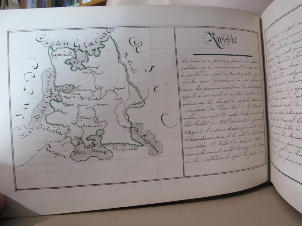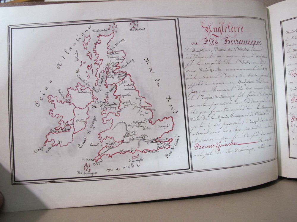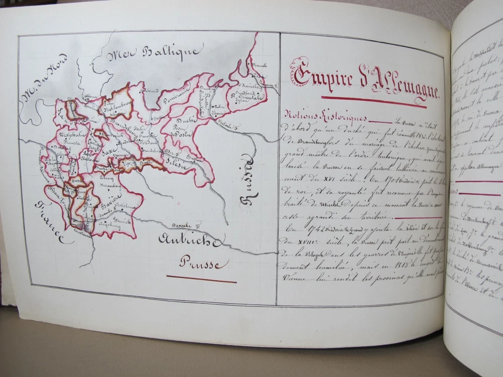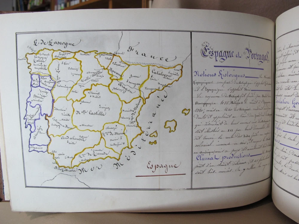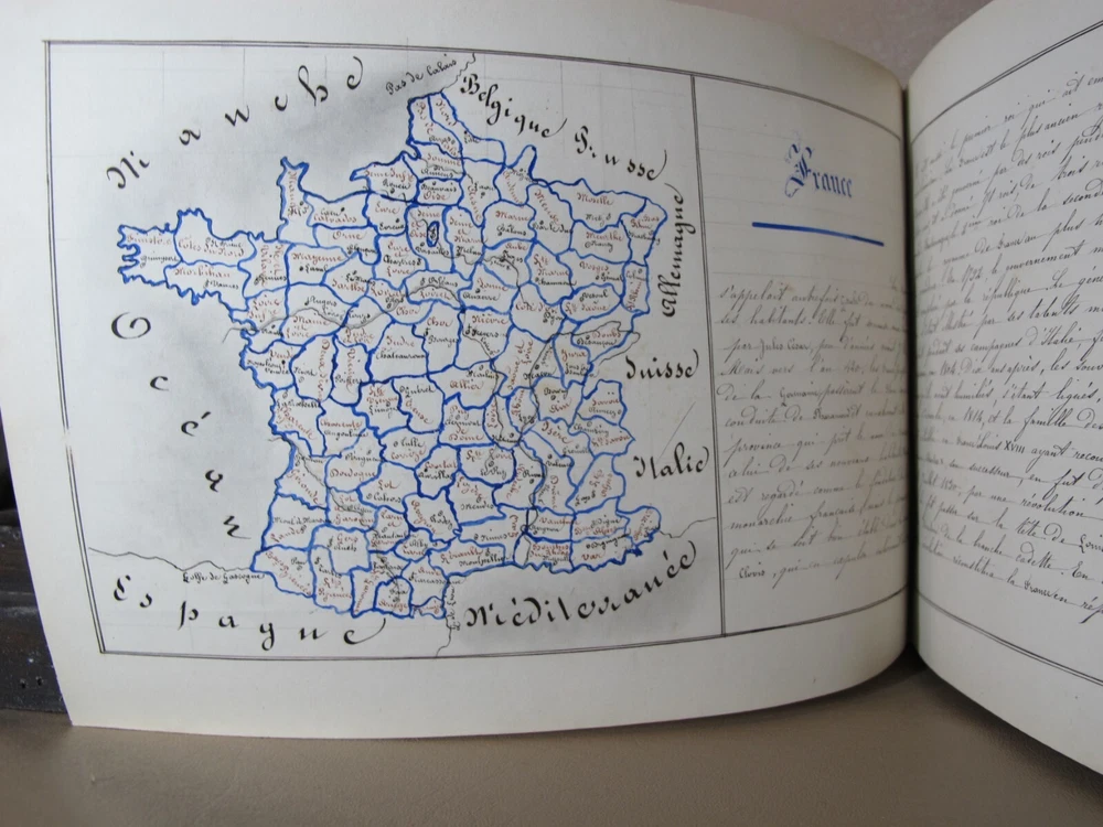 One of a kind handwritten manuscript with hand drawn maps, outlined in color. Undated but circa 1880. Written in French this appears to be a geography reference book. Bound in pebble cloth with a plain leather spine, rubbing at ends. Pages clean and tightly bound. 7.75" tall and 12" wide. Track Page Views With Auctiva's Counter
