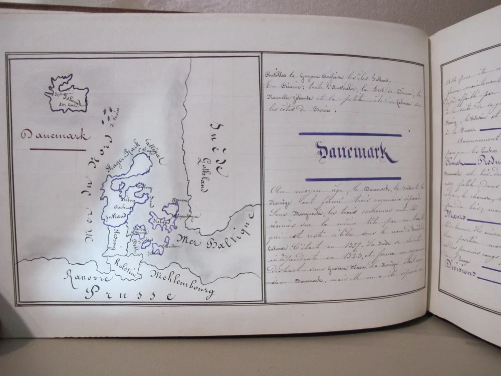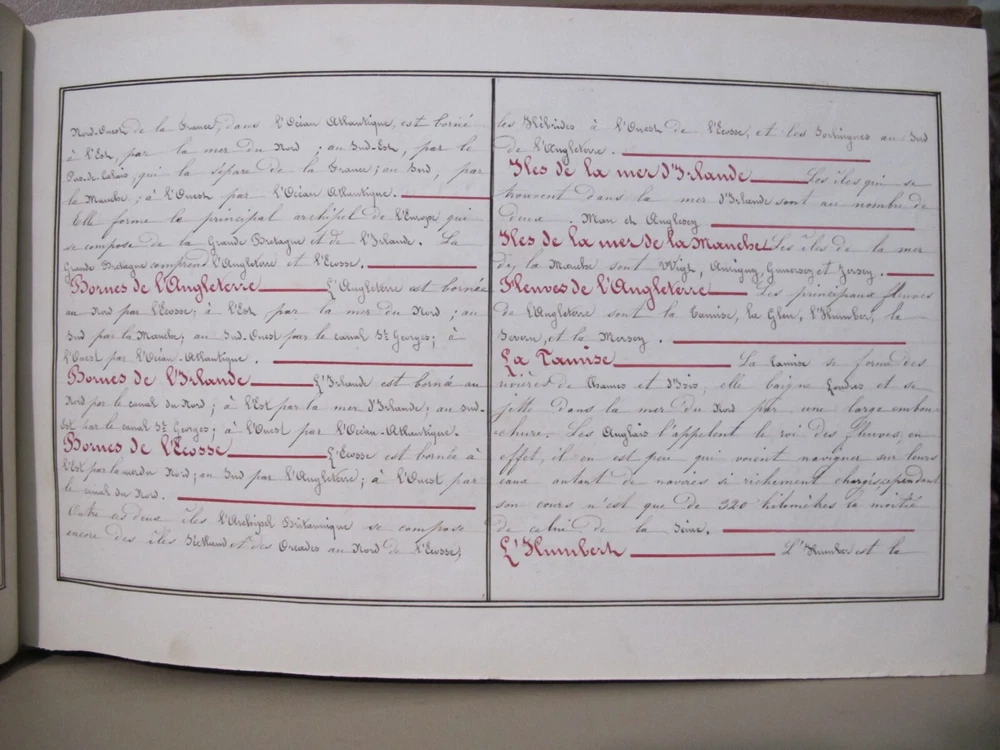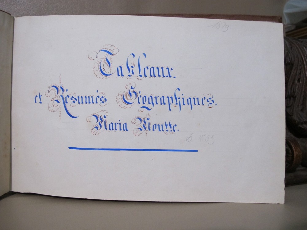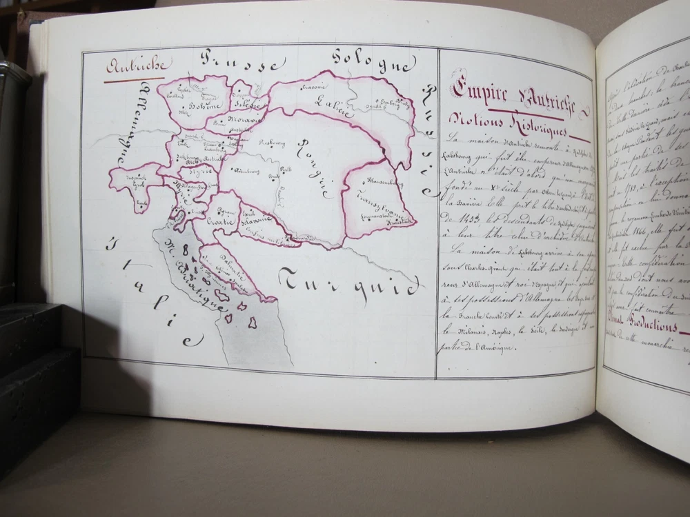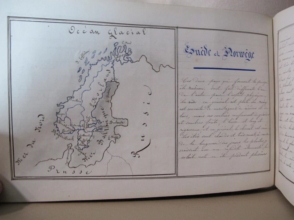 One of a kind handwritten manuscript with hand drawn maps, outlined in color. Undated but circa 1880. Written in French this appears to be a geography reference book. Bound in pebble cloth with a plain leather spine, rubbing at ends. Pages clean and tightly bound. 7.75" tall and 12" wide. Track Page Views With Auctiva's Counter