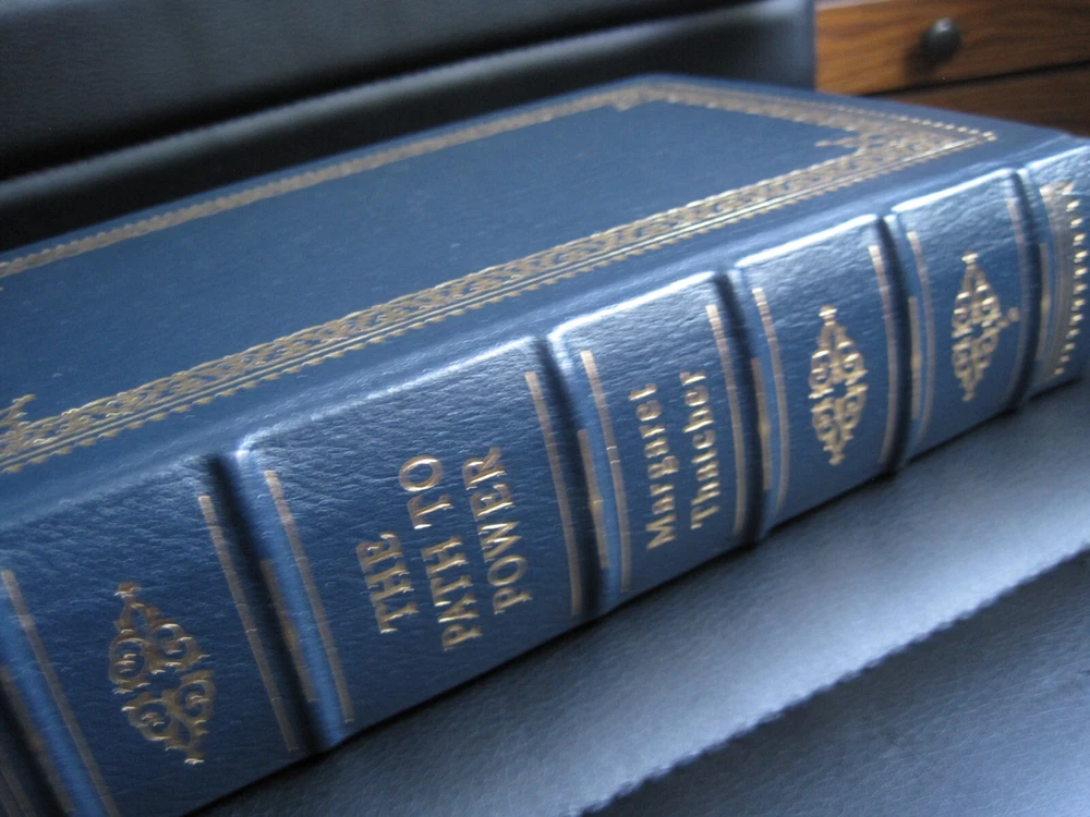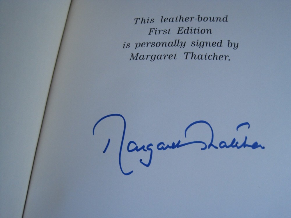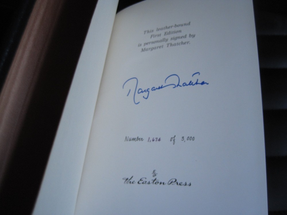 This is a leather bound signed and numbered first edition of former British Prime Minister Margaret Thatcher's best selling memoir - "The Path To Power" . The book is unread and in great condition. Signed by the former British PM on the limitation page, this is book number 1674 of only 3000 numbered copies of this limited first edition. Easton Press books are the golden standard in the publishing industry, highly collectible and lasting generations. Easton Press Full Genuine Leather Dubbed Spine Accented Wit 22 kt. Real Gold Satin Ribbon Page Marker Distinctive Cover Design Gilded Page Edges To Protect Against Humidity High Quality Acid - Free paper Smyth-Sewn Pages Silk-Moire Endleaves I combine multiple items for savings on shipping charges. I ship worldwide. Please ask about international shipping charges and/or different shipping options. Thank you!