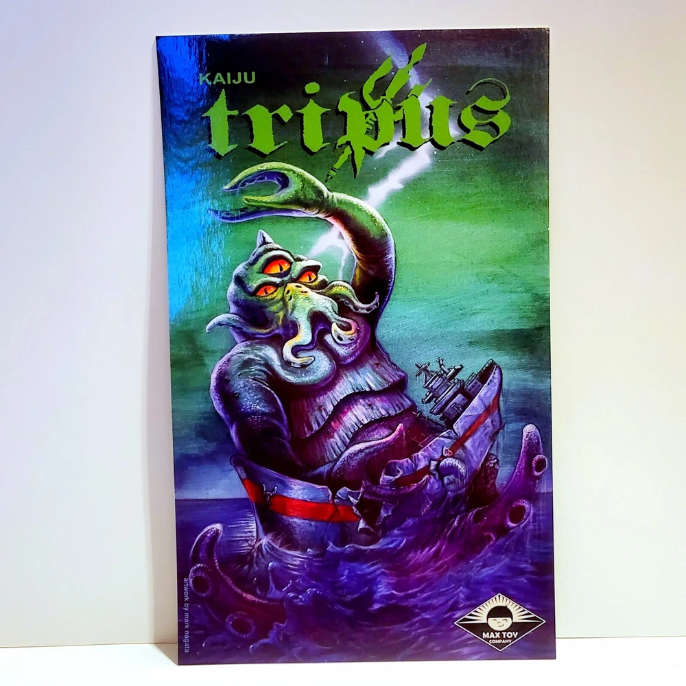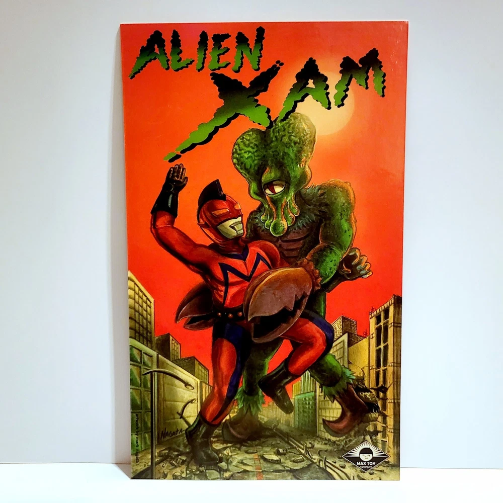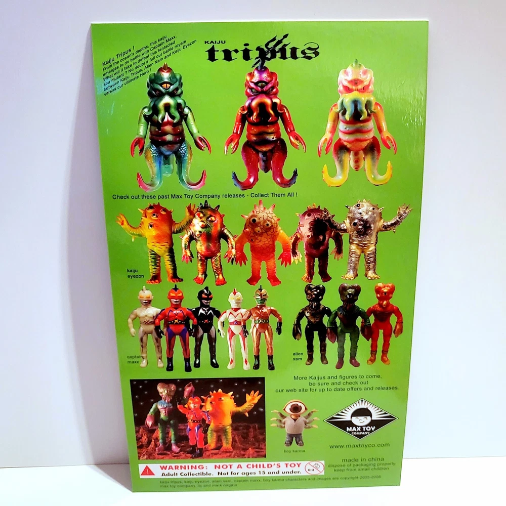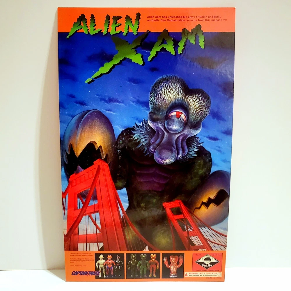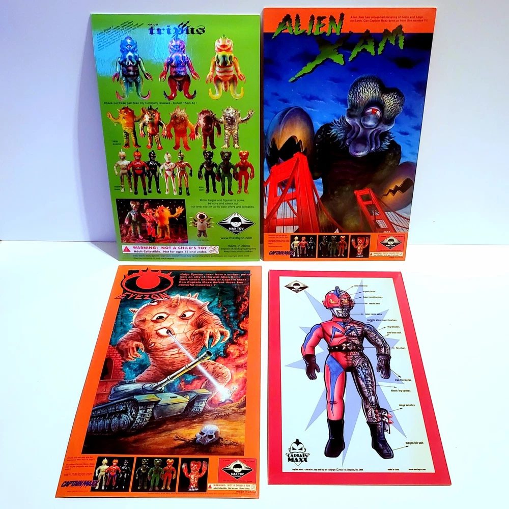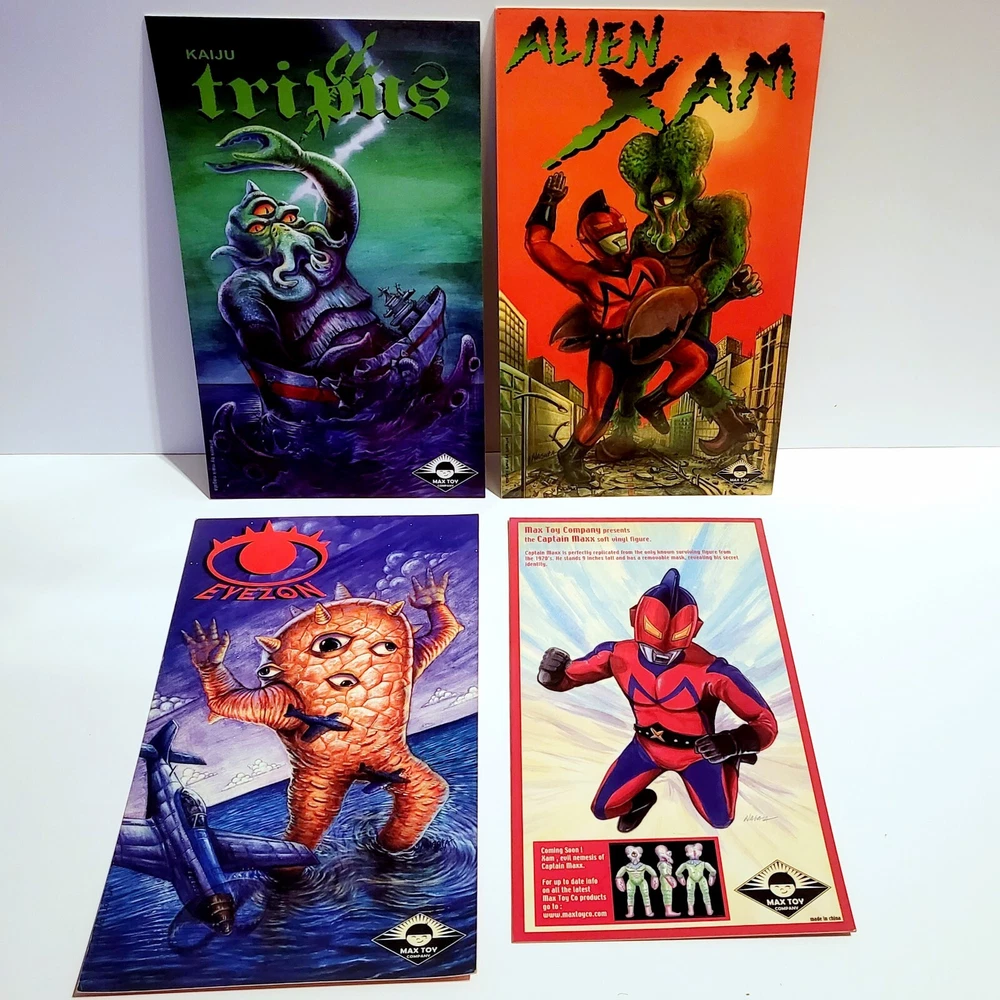 MAX TOY CO CAPTAIN MAXX KAIJU EYEZON TRIPUS ALIEN XAM PROMO ART CARD LOT NAGATA. The Captain Maxx art card is about 11"x6" and the others are about 12"x7". They are double-sided laminated heavy card stock. They have light shelf wear and the alien xam card has some light gold paint on the top as seen in the last picture. Check out the other captain Maxx stuff I have for sale too! I have been a long time collector of action figures, funko pops, pokemon cards, and other toys and I need to part with a bunch of them because I have a fiance who lives overseas and I might need to move as well so it's time to let someone else enjoy these as much as I have enjoyed them! All items ship the following business day so if you're hoping to receive this fast for a birthday or holiday I'll be sure to get it off to you quickly! Combined shipping is available ask before buying!