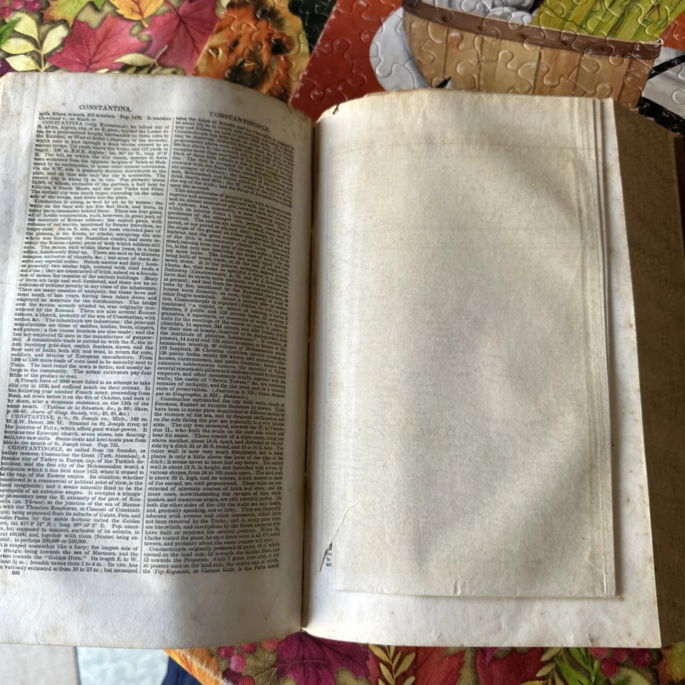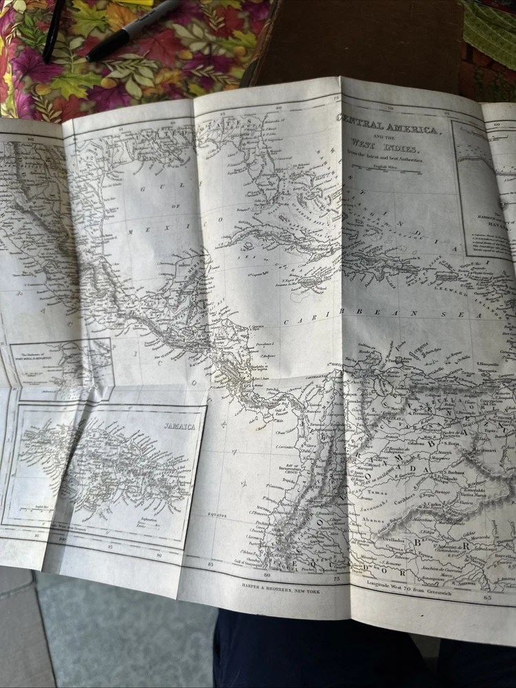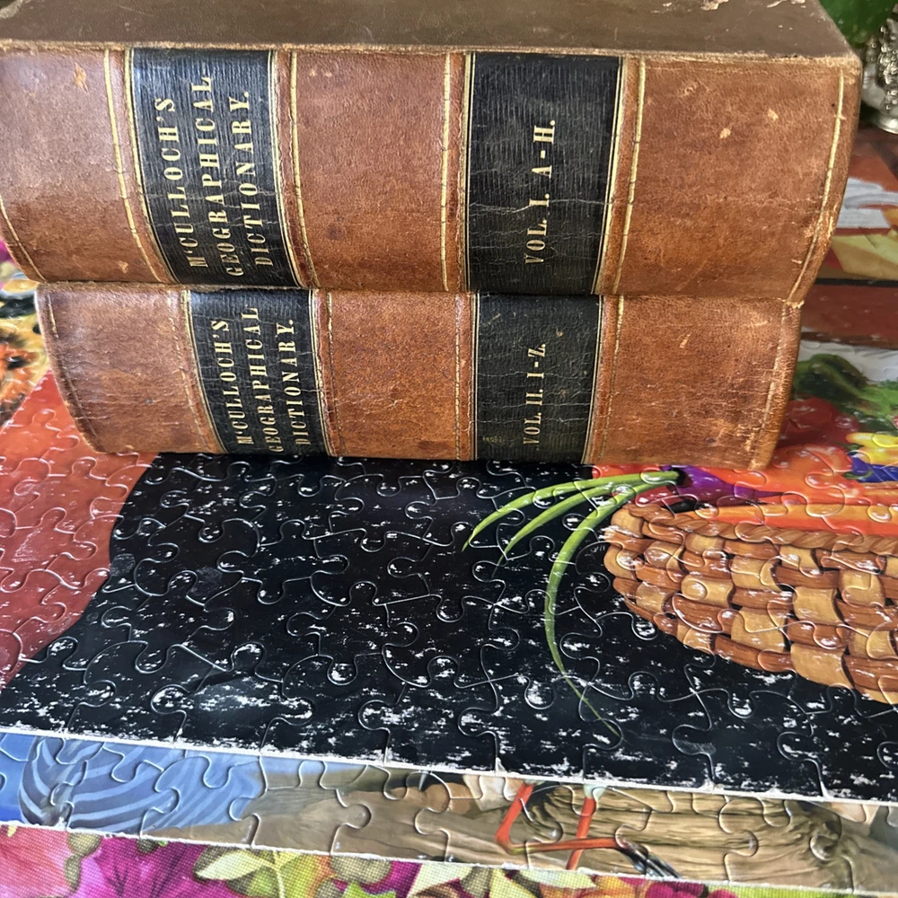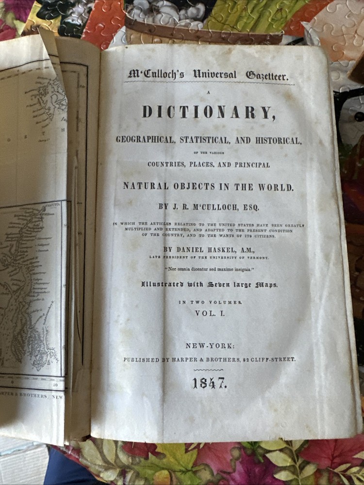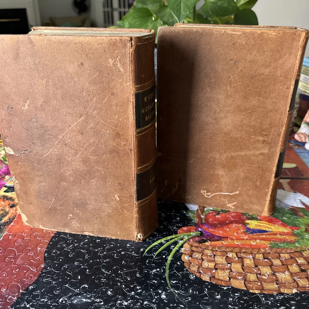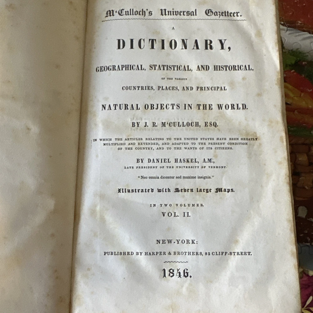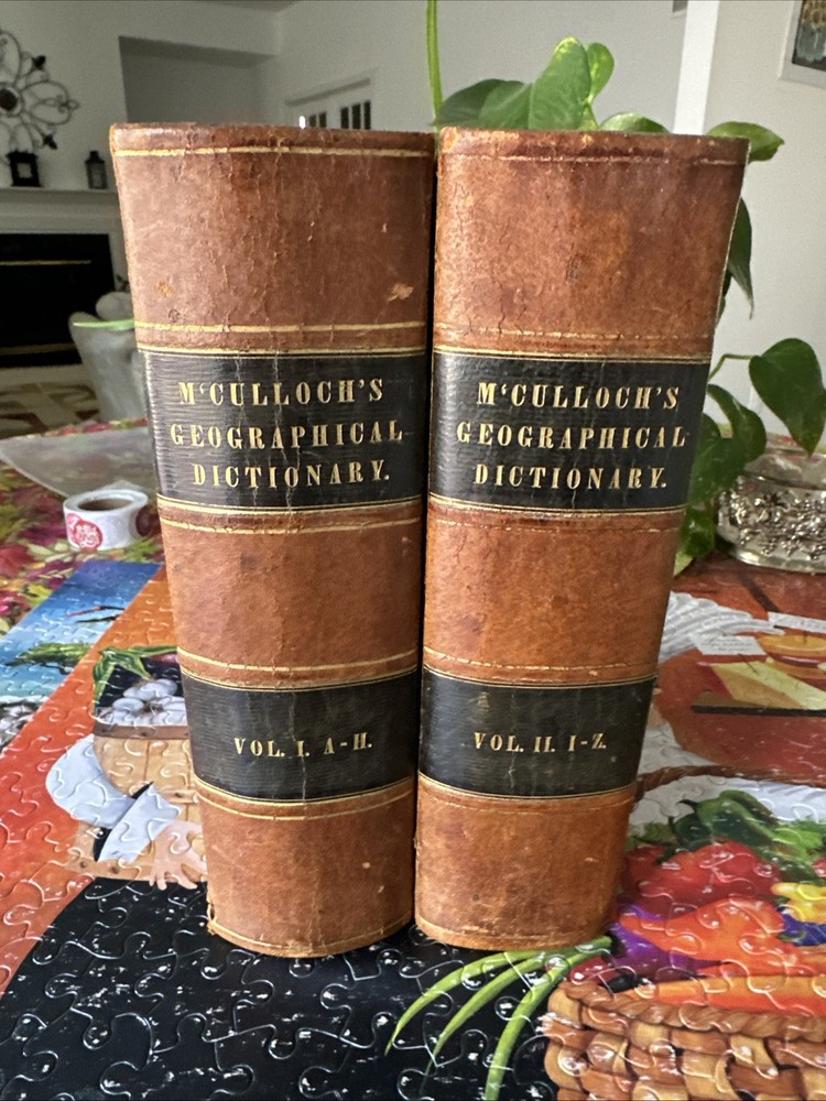 Explore the world of geography and politics with M’CULLOCH’S GEOPOLITICAL DICTIONARY VOL 1 &2. This set of leather-bound dictionaries by HARPER BROTHERS is a valuable resource for anyone interested in reference books. The special illustrated attribute makes it even more appealing to collectors and enthusiasts alike. M'Culloch's Universal Gazetteer: A Dictionary, Geographical, Statistical, and Historical (2 Volume Set) Harper & Brothers, New York. RARE Out of Print HUGE 2 volume set. Volume One says 1847, Volume Two says 1846, but definitely a matching pair. Leather surfaced hardcovers are in good condition Both are solid and tight, pages have a lot of scattered foxing, mostly on the leading and ending pages, and stiff from the age. Covers have natural aging, rubs/wear of anything leather that's 166 years old! SCARCE COPY OF THE 1847 & 1846 EDITION TWO VOLUME MIXED DATE SET ILLUSTRATED WITH MANY LARGE FOLD-OUT MAPS OF DIFFERENT REGIONS OF THE WORLD NOTE: MAP OF THE UNITED STATES LISTS TEXAS IN ITS TITLE AS A SEPARATE REGION AND NOT A STATE LARGE BOOKS EACH MEASURING 9-3/4" X 6-3/4" X 3" THICK