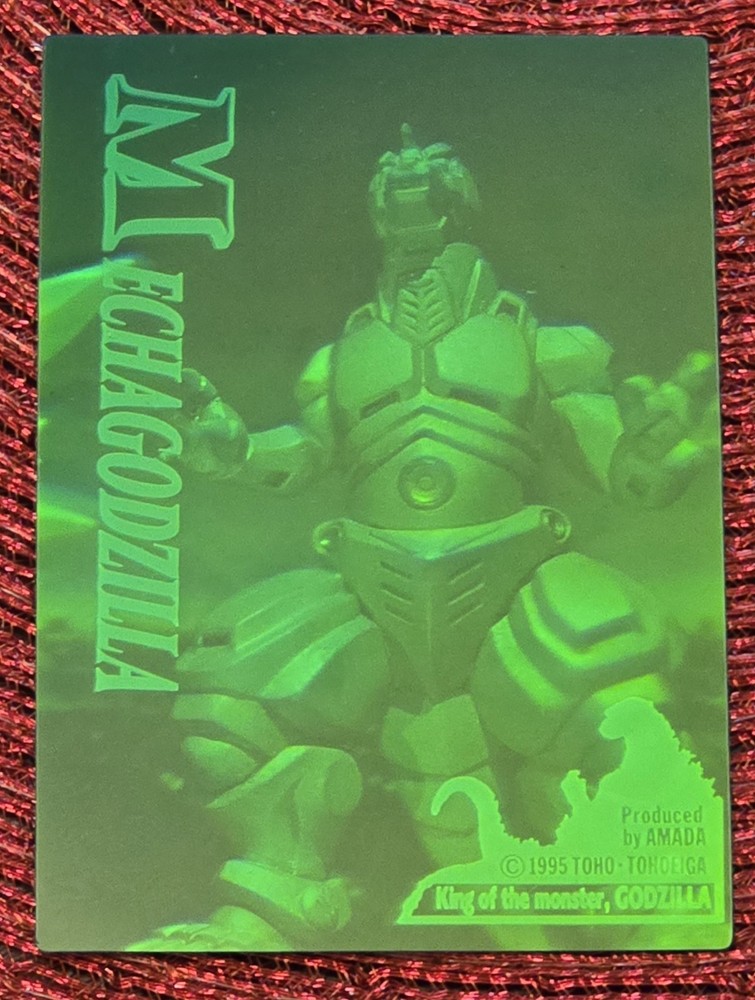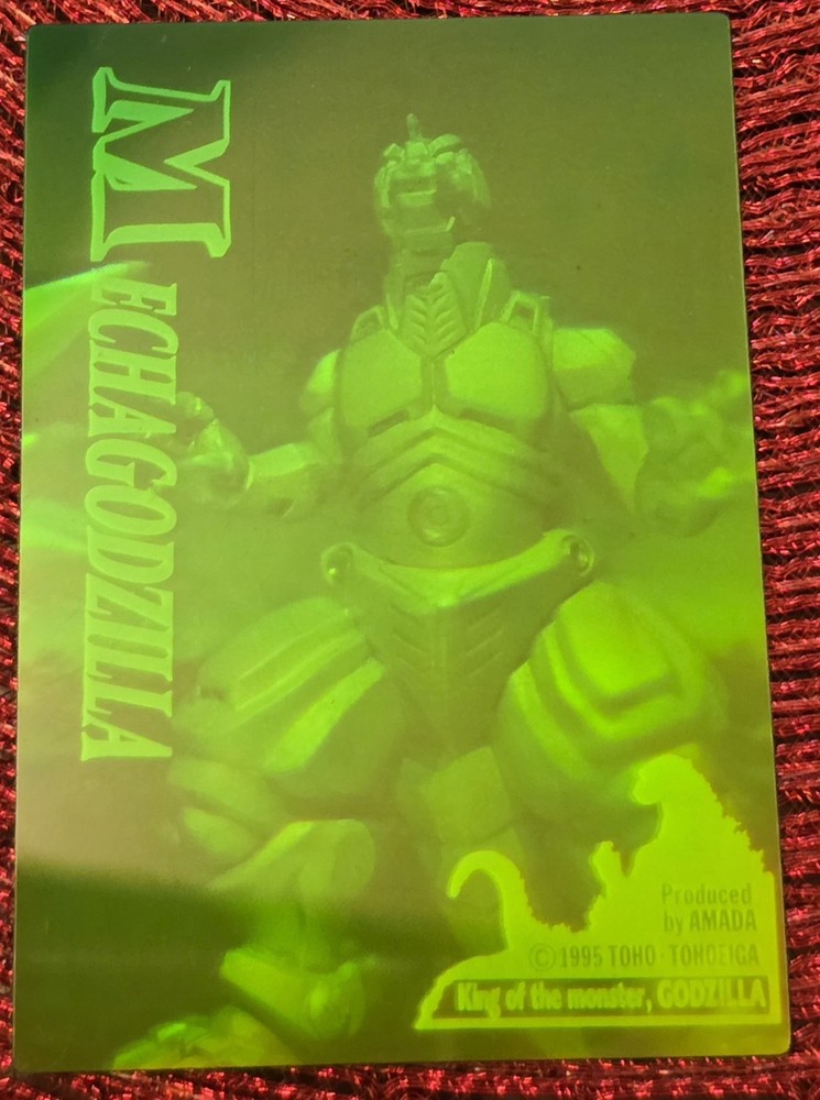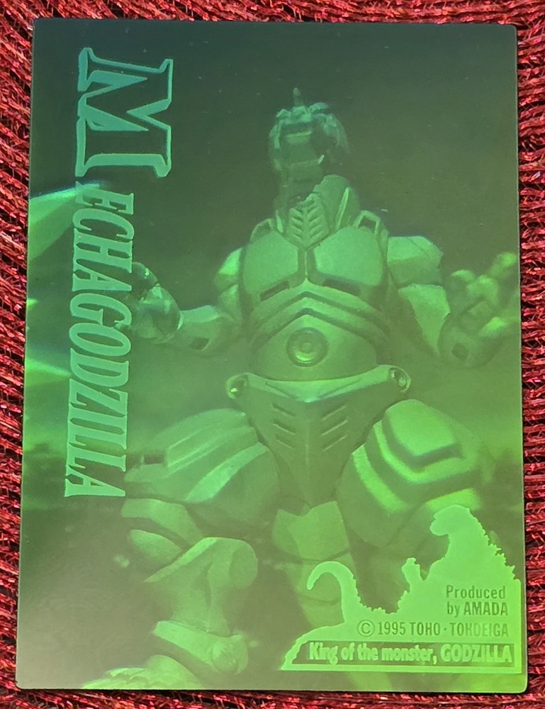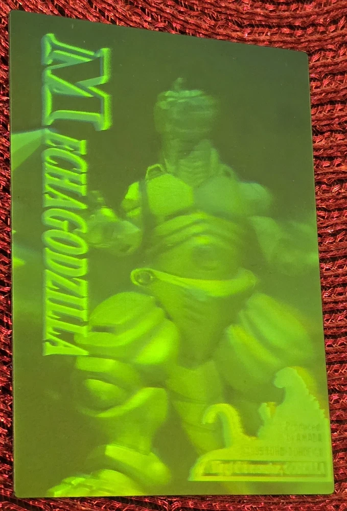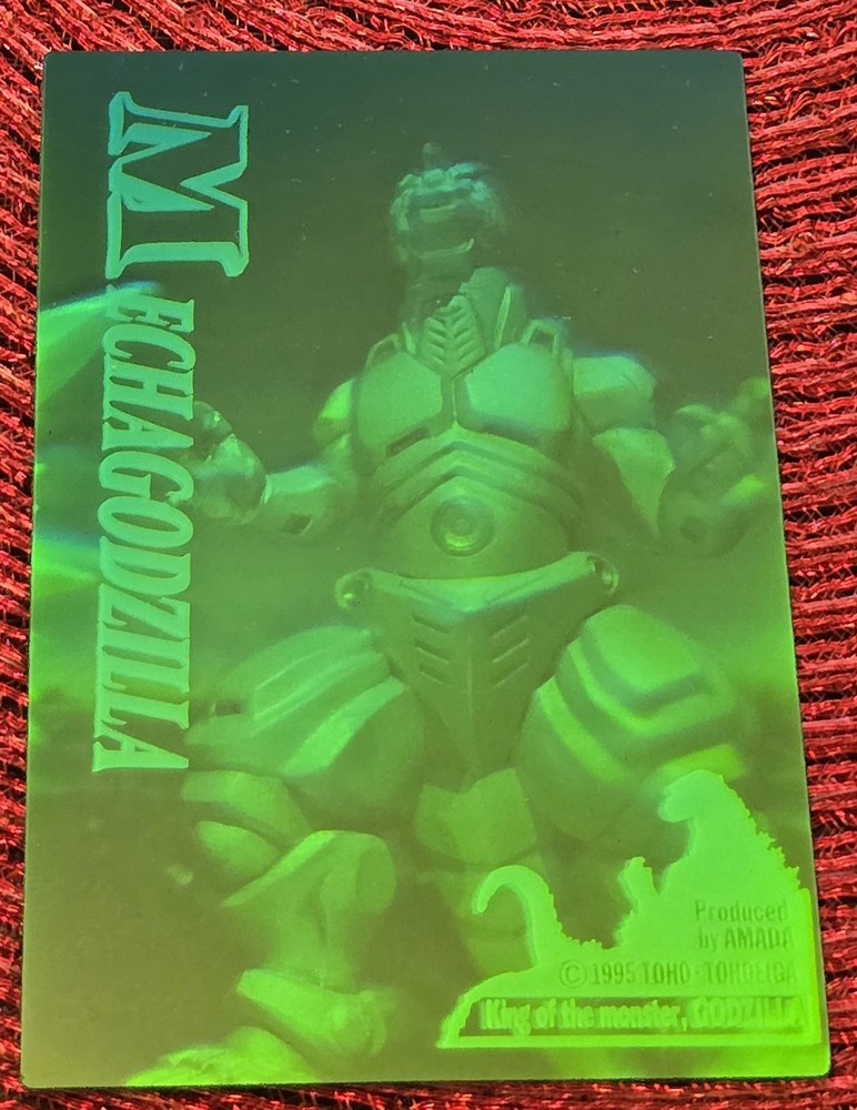 💥💥GEM MINT CONDITION💥💥 This rare and coveted non-sport trading card features Mechagodzilla, the formidable monster from the 1995 Godzilla movie. Manufactured by Amada Printing Mfg. Co., Ltd. in Japan, this original card is made of hologram and card stock materials and is a part of the 1995 Amada Godzilla Story - Holograms insert set. The card is in mint condition and is a must-have for any serious collector of Godzilla memorabilia. The hologram feature adds an extra layer of excitement and uniqueness to this already valuable card. Don't miss your chance to add this amazing card to your collection.