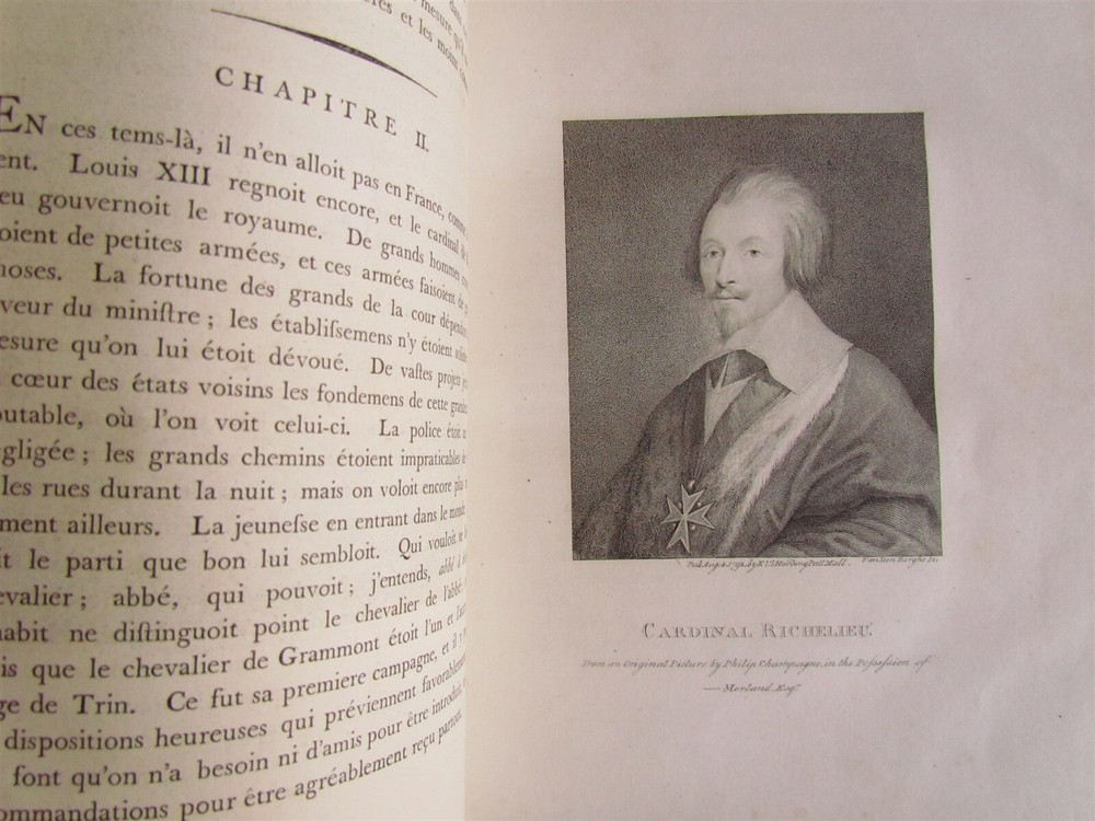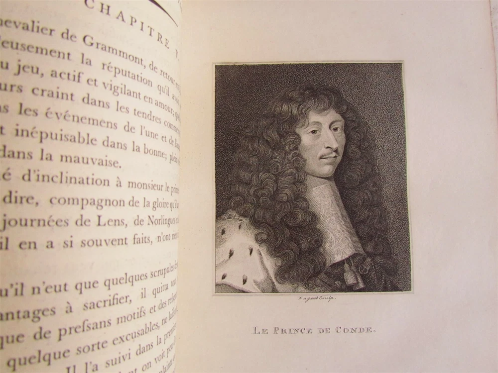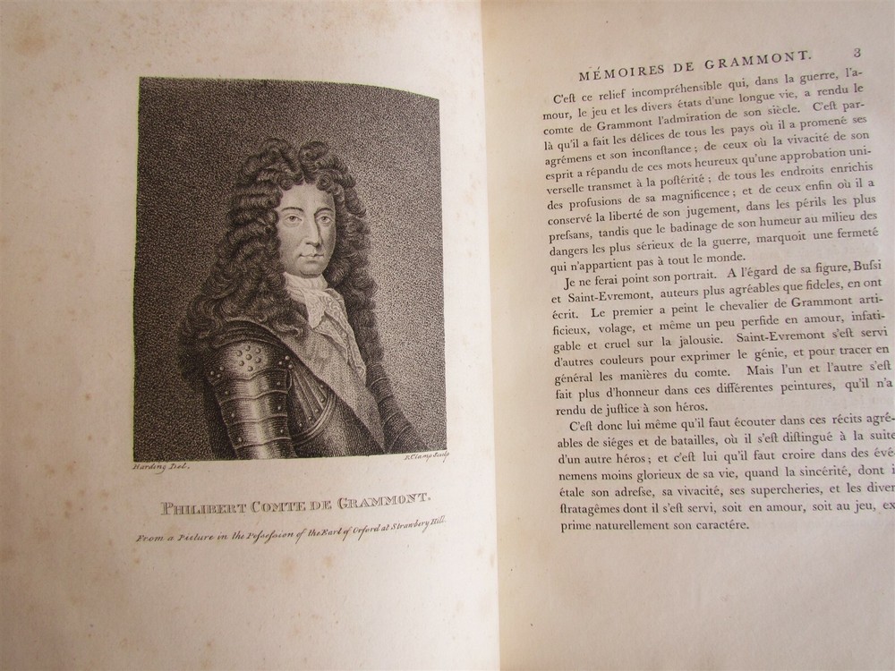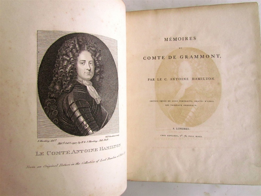 MEMOIRES du COMTE DE GRAMMONT Par Le C. Antoine Hamilton With 72 full page copper plates - portraits of personages involved. London. No date. 18th century. Leather binding. Front cover detached. Otherwise very good condition. Size 8 3/4 by 10 3/4" ----------------------------------------------------------------------------------------------------------------------------------------------------------------------------- Philibert, Count de Gramont (1621 – 31 January 1707), was a French nobleman, known as the protagonist of the Mémoires written by Antoine Hamilton (his brother-in-law). He was a younger halfbrother of Antoine III of Gramont and uncle of Catherine Charlotte de Gramont, princess of Monaco ------------------------------------------------------------------------------------------------------------------------------------------------------------------------------ Antoine (or Anthony) Hamilton (c.?1645 – 1719) was a soldier and a writer of literature. As a Catholic of Irish and Scottish ancestry, he fled with his family to France during the Interregnum and later sided with James II against the Prince of Orange, which led him into another French exile. As a soldier he fought in French service in the Franco-Dutch War (1672–1678) and then in the Irish Army in the Williamite War (1688–1690) where he fought on the losing side in the battles of Newtownbutler and the Boyne. As a writer he chose French as his language and adopted a light and elegant style seeking to amuse and entertain his reader. He is mainly known for the Mémoires du comte de Grammont, which tell about the time his brother-in-law, Philibert, comte de Gramont, spent at the court of Charles II at Whitehall. PA residents please add sales tax. Please see my other auctions Refund Policy: We will issue a FULL REFUND, 100% money back if you are not satisfied with your purchase. Items must be returned to us within 20 days in order to receive a refund or replacement. Buyer is responsible for shipping costs. Powered by SixBit's eCommerce Solution 4.23 4.25
