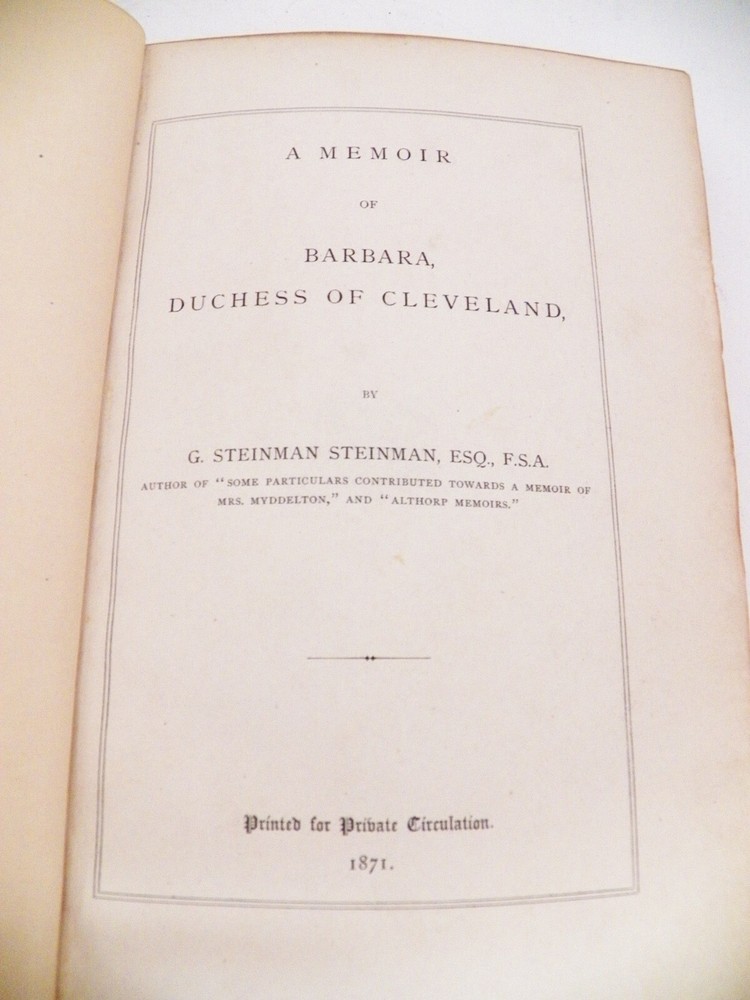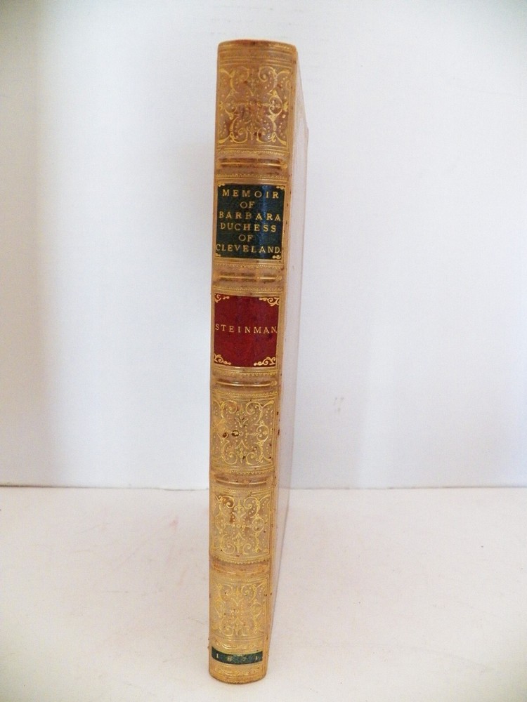 MEMOIRS OF BARBARA, DUCHESS OF CLEVELAND. BY G. STEINMAN, STEINMAN IN FULL LEATHER. THIS IS IN NICE CONDITION FOR THE AGE, JUST A FEW VERY SLIGHT BUMPS ON THE EDGES. THERE IS A PERSONALIZED BOOK PLATE INSIDE Dimensions: 9" X 6" Please email early with questions.