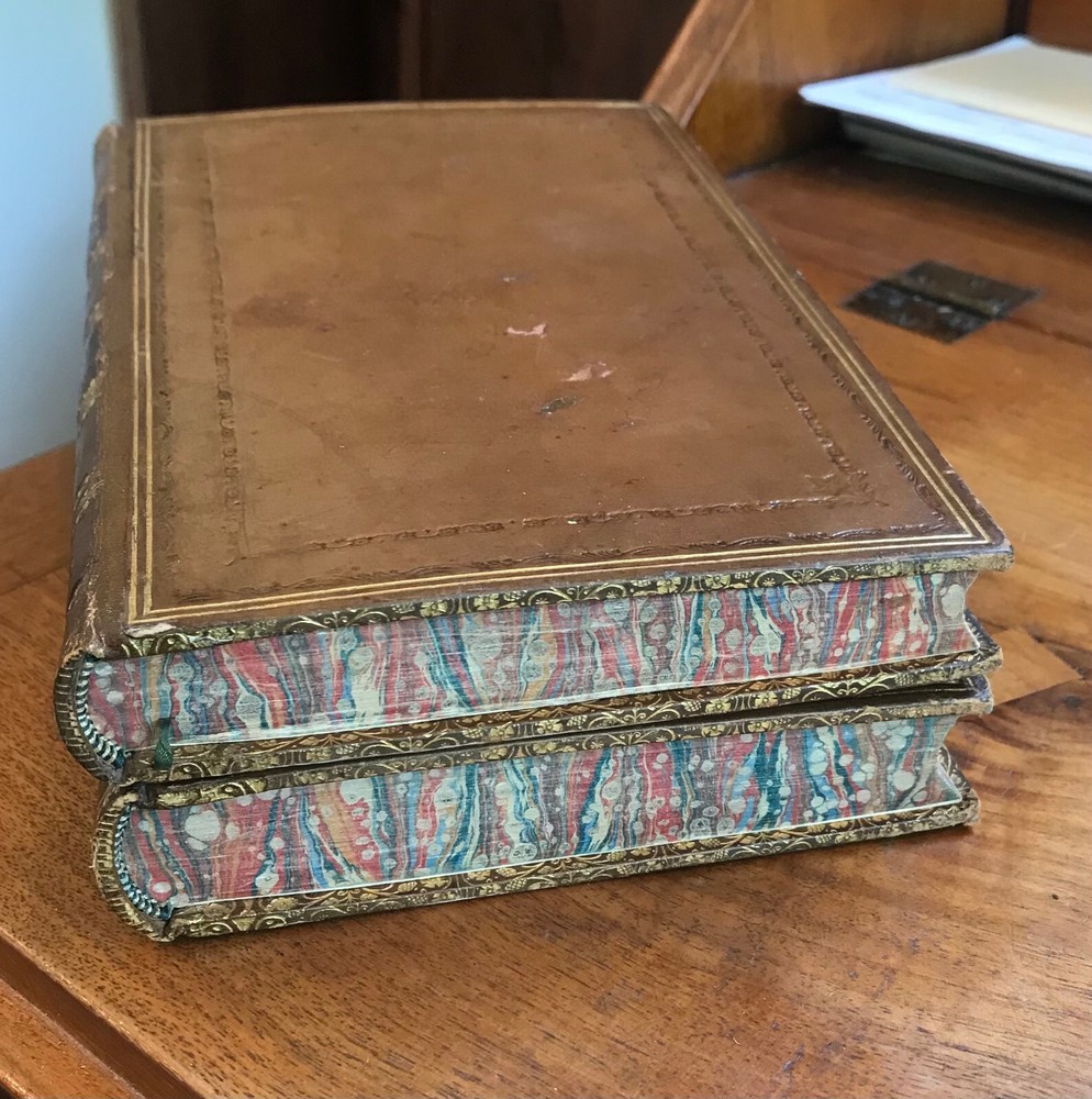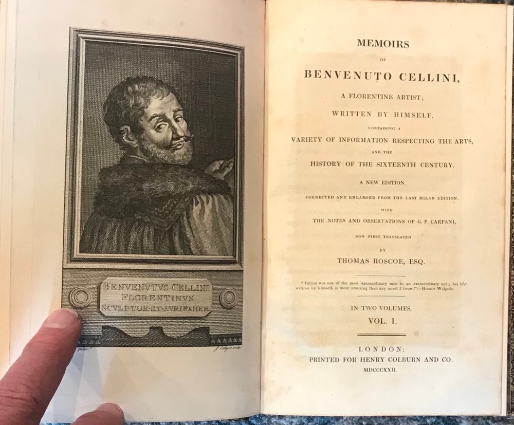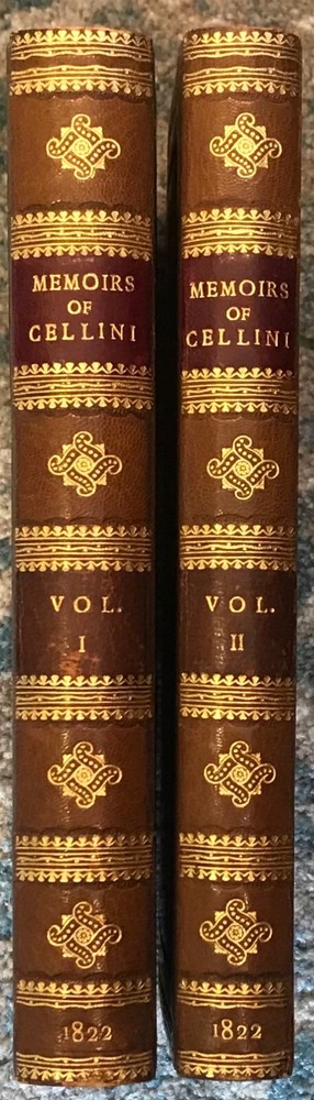 This is "Memoirs of Benvenuto Cellini", in an 1822 edition published in two volumes by Henry Colburn, London. This edition features the autobiography of this famous Florentine jeweler, with afrontispiece portrait engraved by J. Collyer. The volumes are bound in full leather with stamped and gilt decorations to the boards and spine. All page edges are marbled, and matching marbled paper was used for the endsheets, with gilt dentelles. A triumph of the binder's art! Condition of these books is Very Good Plus; there is light rubbing to the edges and wear to the corners, and a couple of dings to the cover of Volume II. Please see my other rare and fine listings.