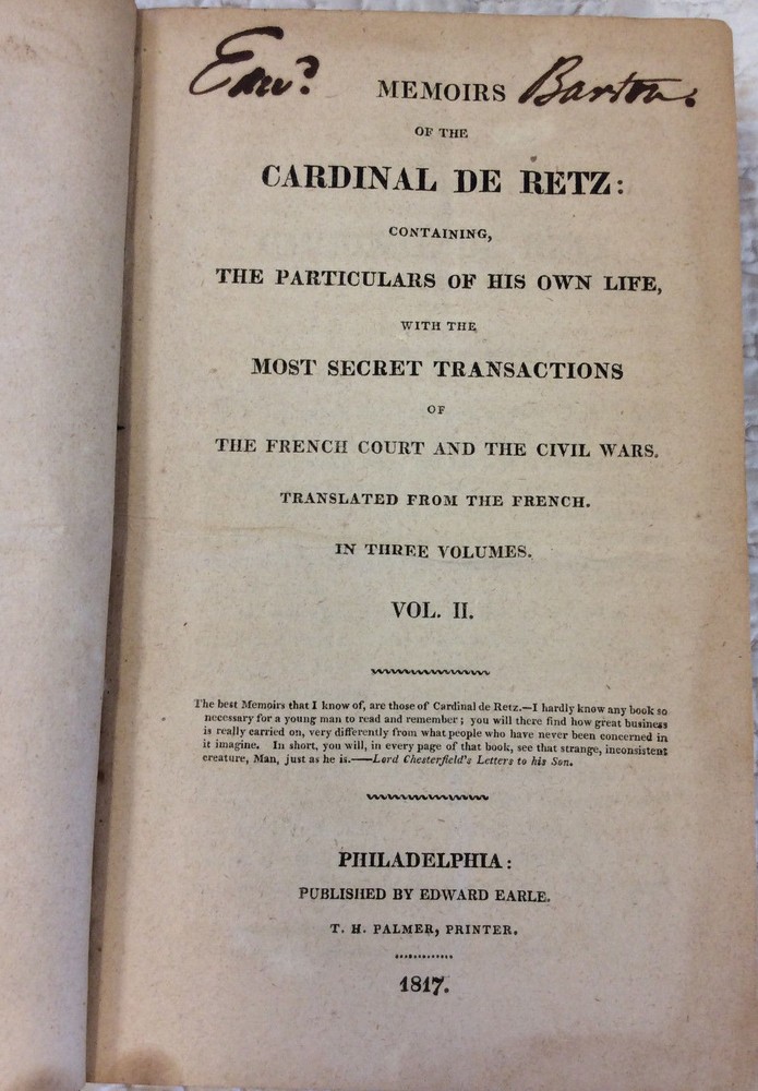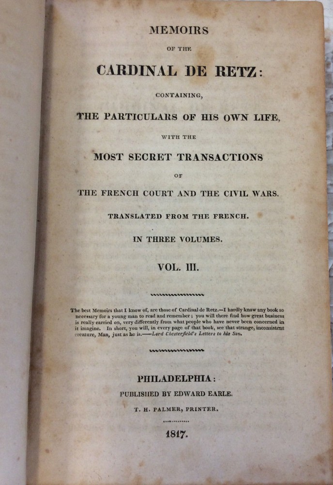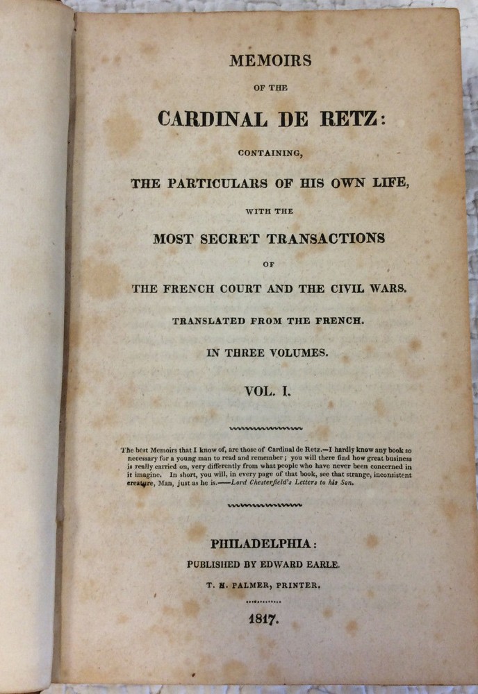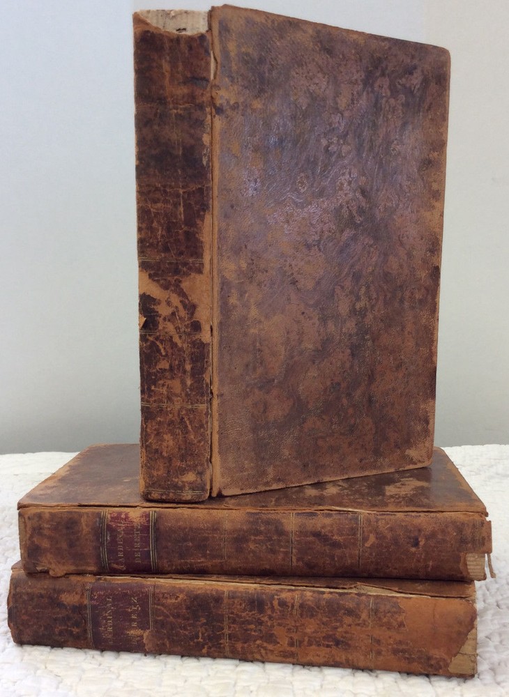 MEMOIRS OF THE CARDINAL DE RETZ: Containing, The Particulars of His Own Life: 3 Volumes By Cardinal De Retz Description: Philadelphia: Edward Earle, 1817. 1st American edition. Vol I: 458p. Vol II: 440p. Vol III: 460p. Brown leather. Three hardcover books in fair condition. Cords intact but leather of hinges cracked, leather worn and spines chipping, pages age-spotted, previous owner's name, otherwise pages unmarked. Three volumes. "Containing the particulars of his own life, with the most secret transactions of the French court and the Civil Wars."