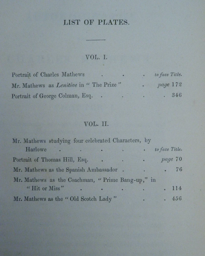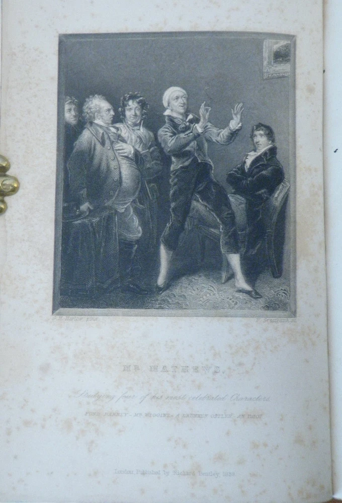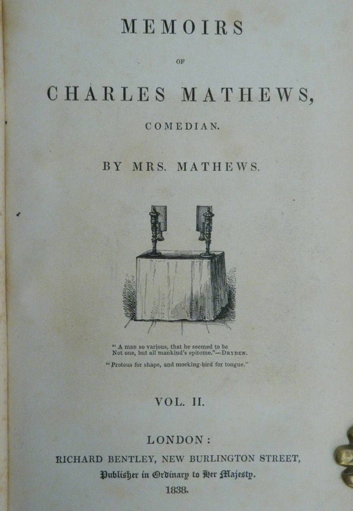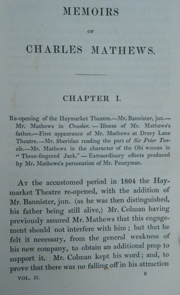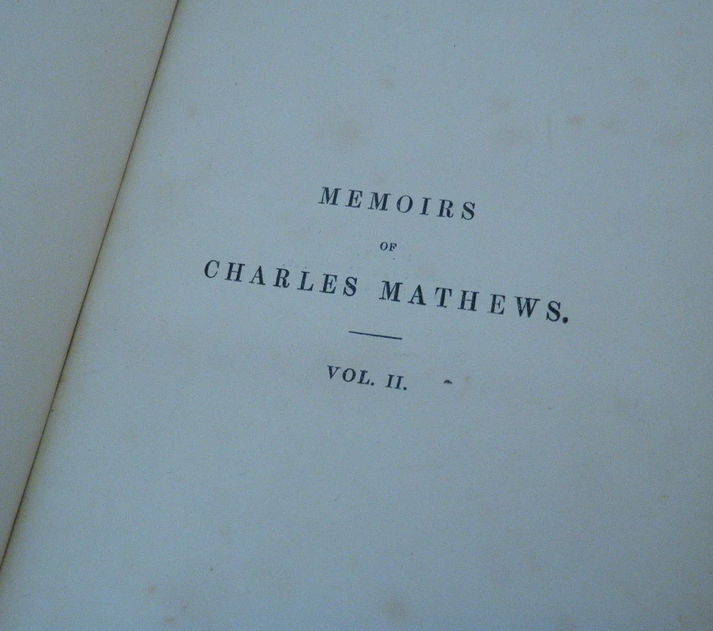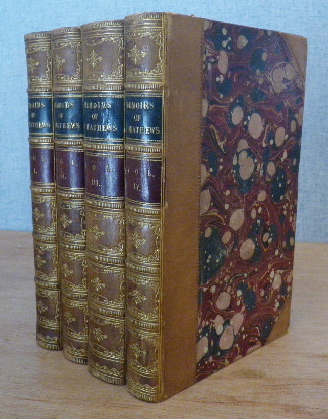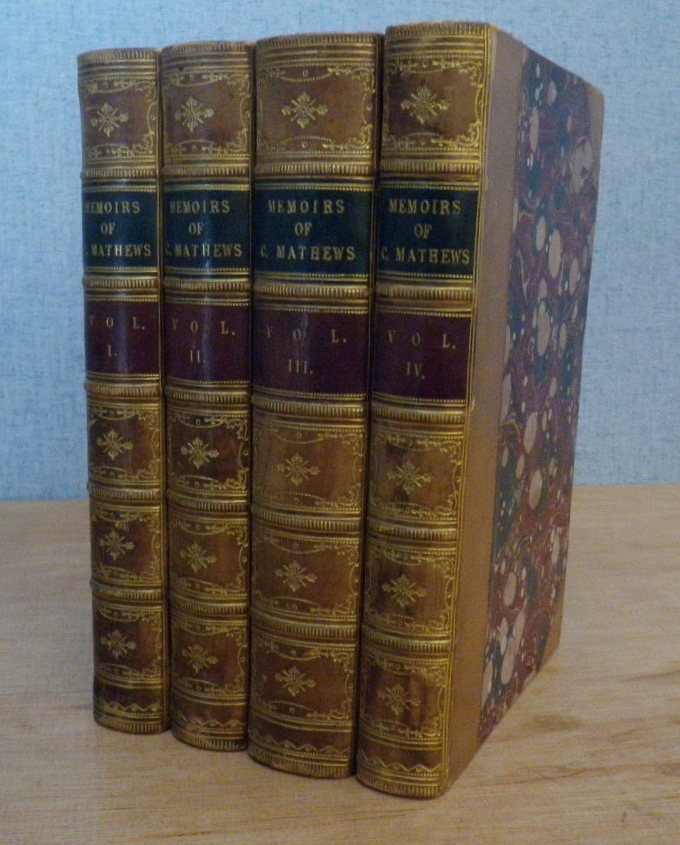 MEMOIRS OF CHARLES MATHEW Comedian 1838-39 4 Volume MEMOIRS OF CHARLES MATHEW Comedian 1838-39 4 Volume POB#51128 TITLE: Memoirs of Charles Mathew, Comedian AUTHOR: Mathews, Mrs. (Anne Jackson), 1782?-1869 PUBLISHER: London: Richard Bentley DATE: 1838-39 DESCRIPTION: 4 volumes containing fragments of an autobiography. Illustrated. Vol. 1: [v] vi-xi,[xii-xiv], [1,] 2-438, [2]p. Vol 2: [v] vi-xi, [xii] [1] 2-472, [2]p. Vol 3: [v] vi-xiv, [1] 2-650p. Vol 4: [v] vi-xii, [1] 2-503p. CONDITION NOTES: VERY GOOD. Near fine. Caps and corners touched but solid. Owner bookplate of James McDonald on front pastedown of all volumes. BINDING: Half calf over marbled boards with marbled pastedowns and edges. NOTES from the EB 11th Edition: Charles Mathews, (born June 28, 1776, London, Eng.—died June 28, 1835, Plymouth, Devon), prominent English stage personality and theatre manager who, renowned for his genius at mimicry and for his wit, was among the leading comedians of his day. The son of a bookseller, Mathews was educated at Merchant Taylors School, Crosby, Lancashire. After acting in the provinces, primarily at York, he first appeared on the stage in Dublin in 1794 and made his London debut in 1803 in the role of Lingo in The Agreeable Surprize, by the English dramatist Samuel Foote. From that time, Mathews’ career was an uninterrupted triumph. He is credited with having created some 400 new parts, appearing at London’s finest theatres. Among his most notable roles was Sir Fretful Plagiary in Richard Brinsley Sheridan’s Critic. His first wife, Eliza Kirkham Strong, died in 1802, and he married the actress Anne Jackson, who later wrote the popular and diverting Memoirs of Charles Mathews (4 vol., 1838–39). In 1808 Mathews conceived a personal form of entertainment known as “At Homes,” involving one-man shows with comic songs and impersonations of eccentric characters. It was in such performances that he revealed his great art of mimicry. In 1817 the English dramatist George Colman (the Younger) wrote The Actor of All Work for Mathews, enabling him to play a fantastically varied group of characters. Among the sketches he devised for himself are “Mr. Mathews and His Youthful Days” and “The Trip to America.” He toured the United States in 1822 and 1834. Already in poor health, he died shortly after his return to England. From 1827 he had co-managed the Adelphi Theatre, London, with a fellow actor, Frederick Henry Yates.0 Listing and template services provided by inkFrog