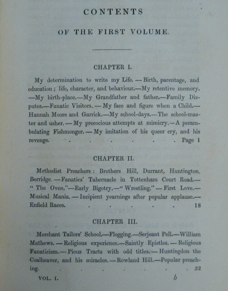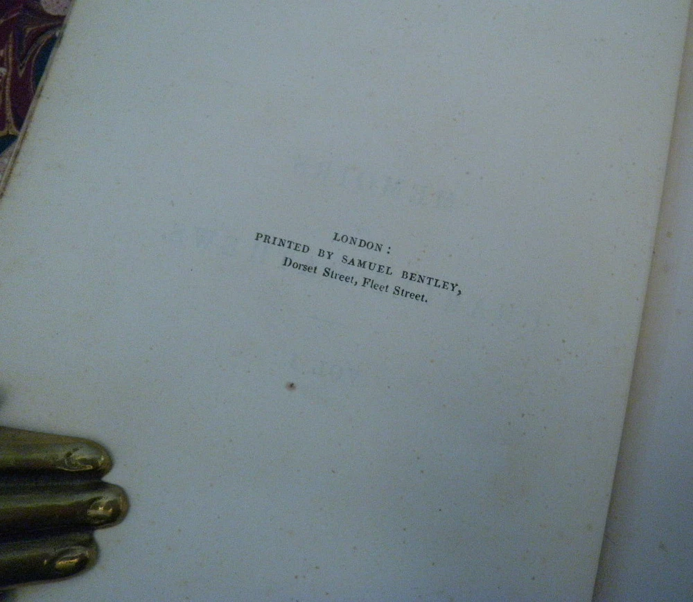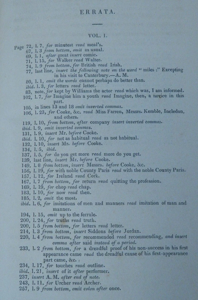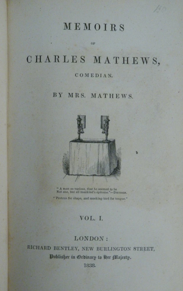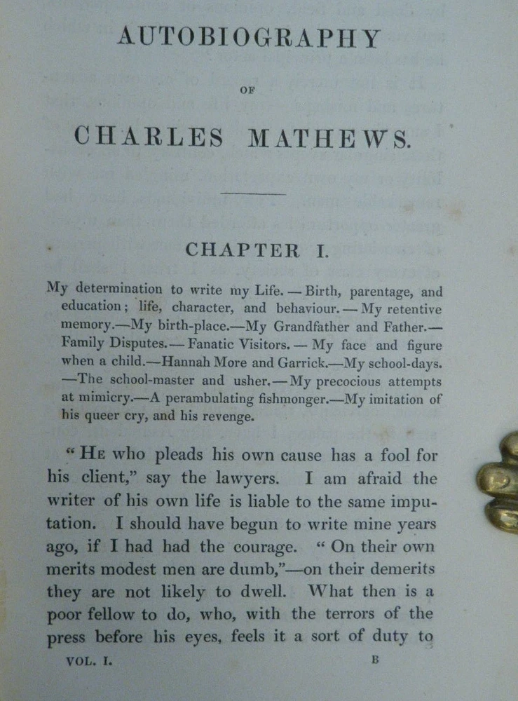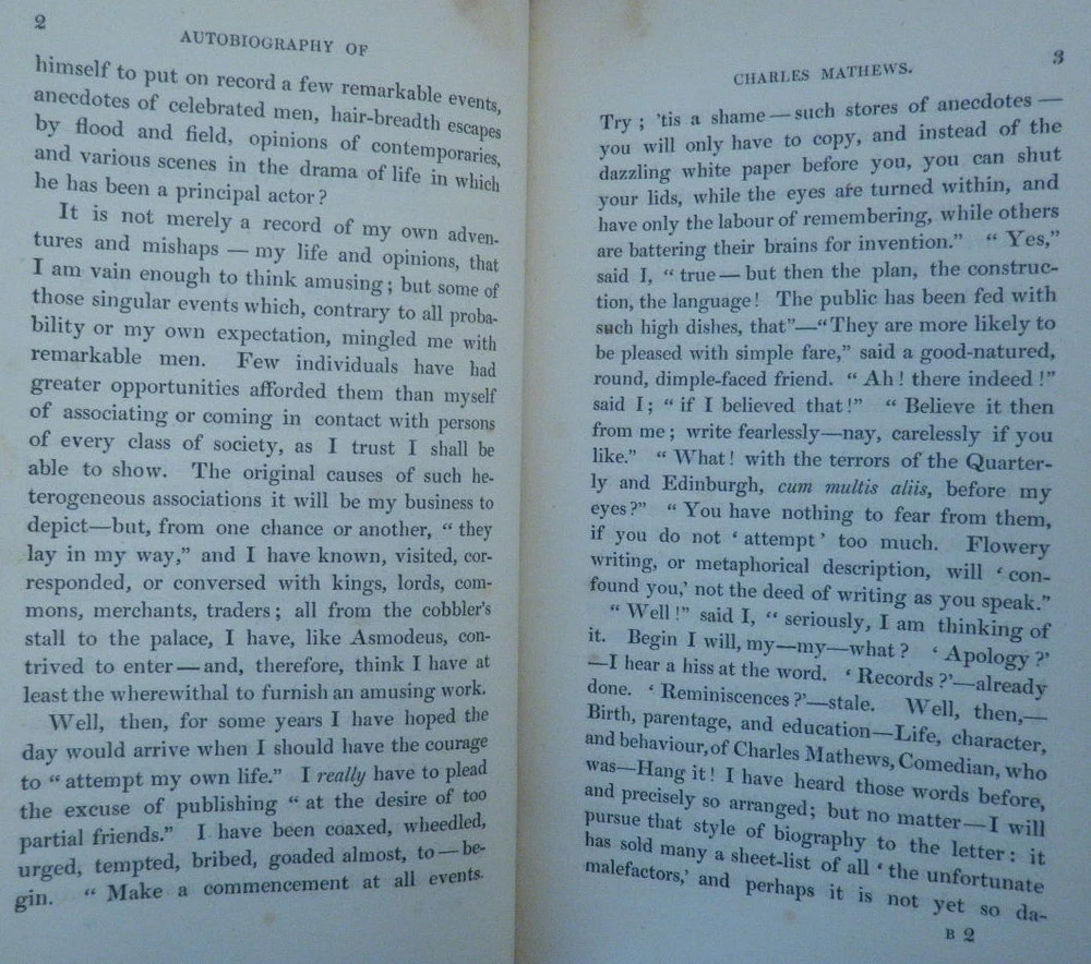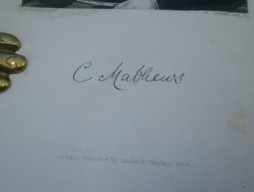MEMOIRS OF CHARLES MATHEW Comedian 1838-39 4 Volume MEMOIRS OF CHARLES MATHEW Comedian 1838-39 4 Volume POB#51128 TITLE: Memoirs of Charles Mathew, Comedian AUTHOR: Mathews, Mrs. (Anne Jackson), 1782?-1869 PUBLISHER: London: Richard Bentley DATE: 1838-39 DESCRIPTION: 4 volumes containing fragments of an autobiography. Illustrated. Vol. 1: [v] vi-xi,[xii-xiv], [1,] 2-438, [2]p. Vol 2: [v] vi-xi, [xii] [1] 2-472, [2]p. Vol 3: [v] vi-xiv, [1] 2-650p. Vol 4: [v] vi-xii, [1] 2-503p. CONDITION NOTES: VERY GOOD. Near fine. Caps and corners touched but solid. Owner bookplate of James McDonald on front pastedown of all volumes. BINDING: Half calf over marbled boards with marbled pastedowns and edges. NOTES from the EB 11th Edition: Charles Mathews, (born June 28, 1776, London, Eng.—died June 28, 1835, Plymouth, Devon), prominent English stage personality and theatre manager who, renowned for his genius at mimicry and for his wit, was among the leading comedians of his day. The son of a bookseller, Mathews was educated at Merchant Taylors School, Crosby, Lancashire. After acting in the provinces, primarily at York, he first appeared on the stage in Dublin in 1794 and made his London debut in 1803 in the role of Lingo in The Agreeable Surprize, by the English dramatist Samuel Foote. From that time, Mathews’ career was an uninterrupted triumph. He is credited with having created some 400 new parts, appearing at London’s finest theatres. Among his most notable roles was Sir Fretful Plagiary in Richard Brinsley Sheridan’s Critic. His first wife, Eliza Kirkham Strong, died in 1802, and he married the actress Anne Jackson, who later wrote the popular and diverting Memoirs of Charles Mathews (4 vol., 1838–39). In 1808 Mathews conceived a personal form of entertainment known as “At Homes,” involving one-man shows with comic songs and impersonations of eccentric characters. It was in such performances that he revealed his great art of mimicry. In 1817 the English dramatist George Colman (the Younger) wrote The Actor of All Work for Mathews, enabling him to play a fantastically varied group of characters. Among the sketches he devised for himself are “Mr. Mathews and His Youthful Days” and “The Trip to America.” He toured the United States in 1822 and 1834. Already in poor health, he died shortly after his return to England. From 1827 he had co-managed the Adelphi Theatre, London, with a fellow actor, Frederick Henry Yates.0 Listing and template services provided by inkFrog